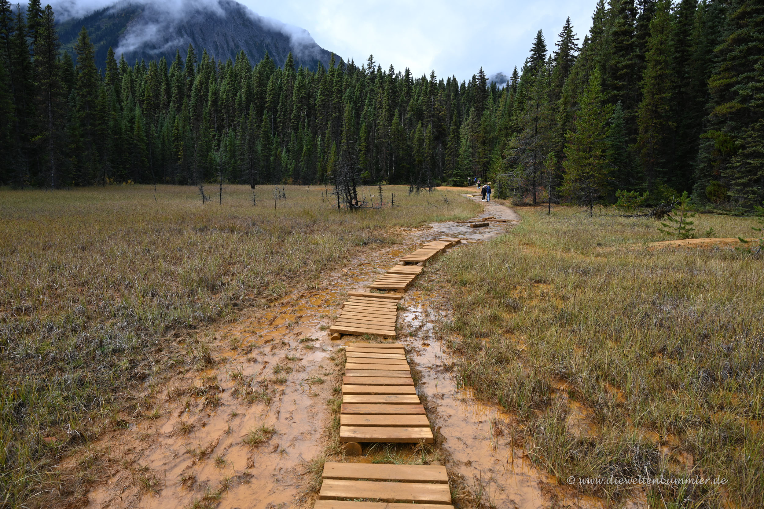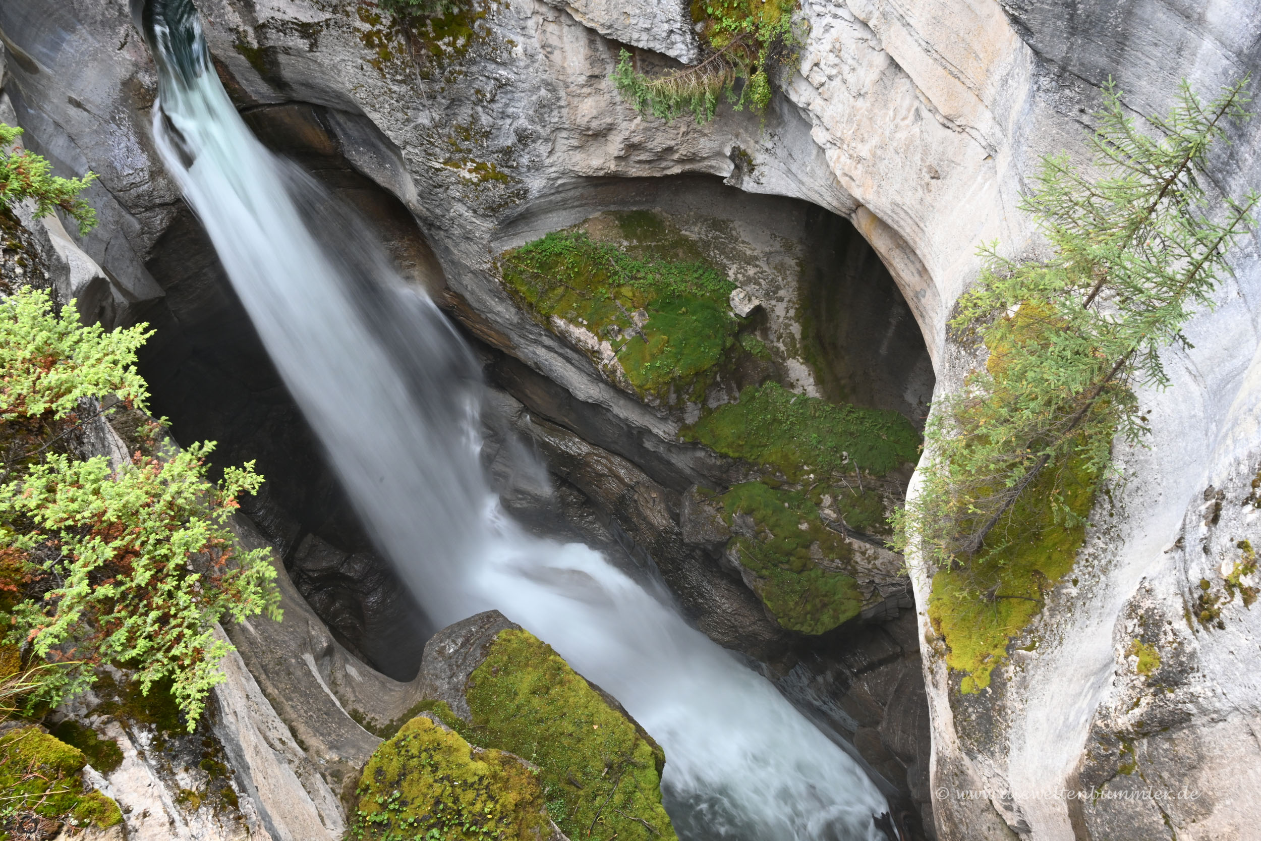 Leider wurde das Wetter immer schlechter und leider gab es auch hier gesperrte Parkplätze. Denn gerne hätten wir die beliebte Aussicht auf den Peyto Lake genossen. Doch wir kamen noch nicht einmal auf die Zufahrtsstraße, weil diese schon gesperrt war. Dafür hatten wir kurz zuvor die Möglichkeit, uns auf eine sehr kurze Wanderung zum Mistaya Canyon zu begeben. Kurzum, zu sehen gab es also jede Menge.