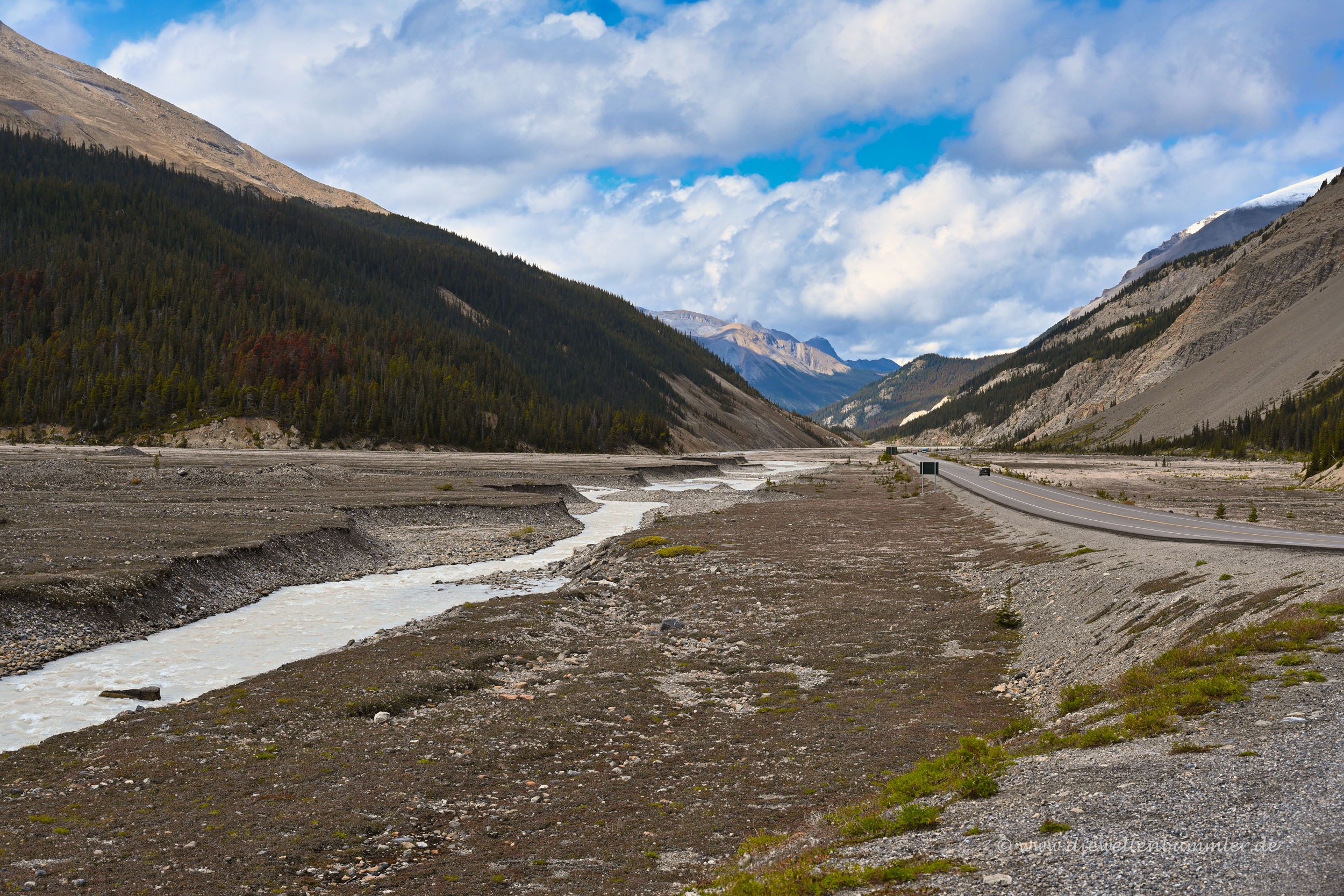 Gleich hinter dem Besucherzentrum überquert man einen Pass, der gleichzeitig die Grenze zwischen Jasper Nationalpark und Banff Nationalpark darstellt. Weil auch der Banff Nationalpark kostenpflichtig ist, kauften wir noch im Besucherzentrum ein Ticket für unser Auto. Der Icefields Parkway führt nun durch das enge Tal deutlich hinab und bot auch weiterhin tolle Ausblicke.
