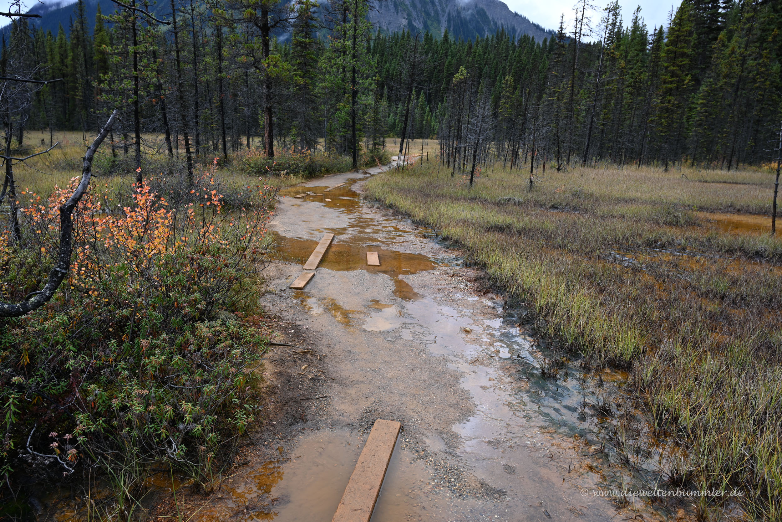 Den Kootenay Nationalpark hat man relativ schnell durchquert. Der Highway 93 führt einmal durch ihn hindurch. Wir hielten am Eingang des Parks, der gleichzeitig auch mal wieder die kontinentale Wasserscheide bildet. Wenig später stoppten wir schon wieder, als wir zu einer kleinen Wanderung zu den sogenannten Paint Pots aufbrachen.