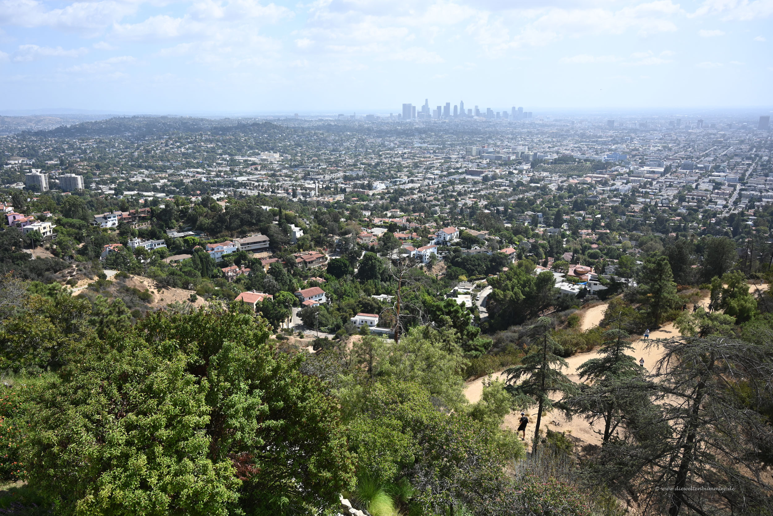 Die meisten, die hier in die Hügel nördlich von Hollywood hinauf fahren oder wandern, dürften das vermutlich wegen der Aussicht nach Süden machen. Der Blick reicht nämlich über Hollywood hinweg über weite Teile von Los Angeles. Gut zu erkennen ist natürlich dabei auch die Wolkenkratzer-Kulisse von Downtown.