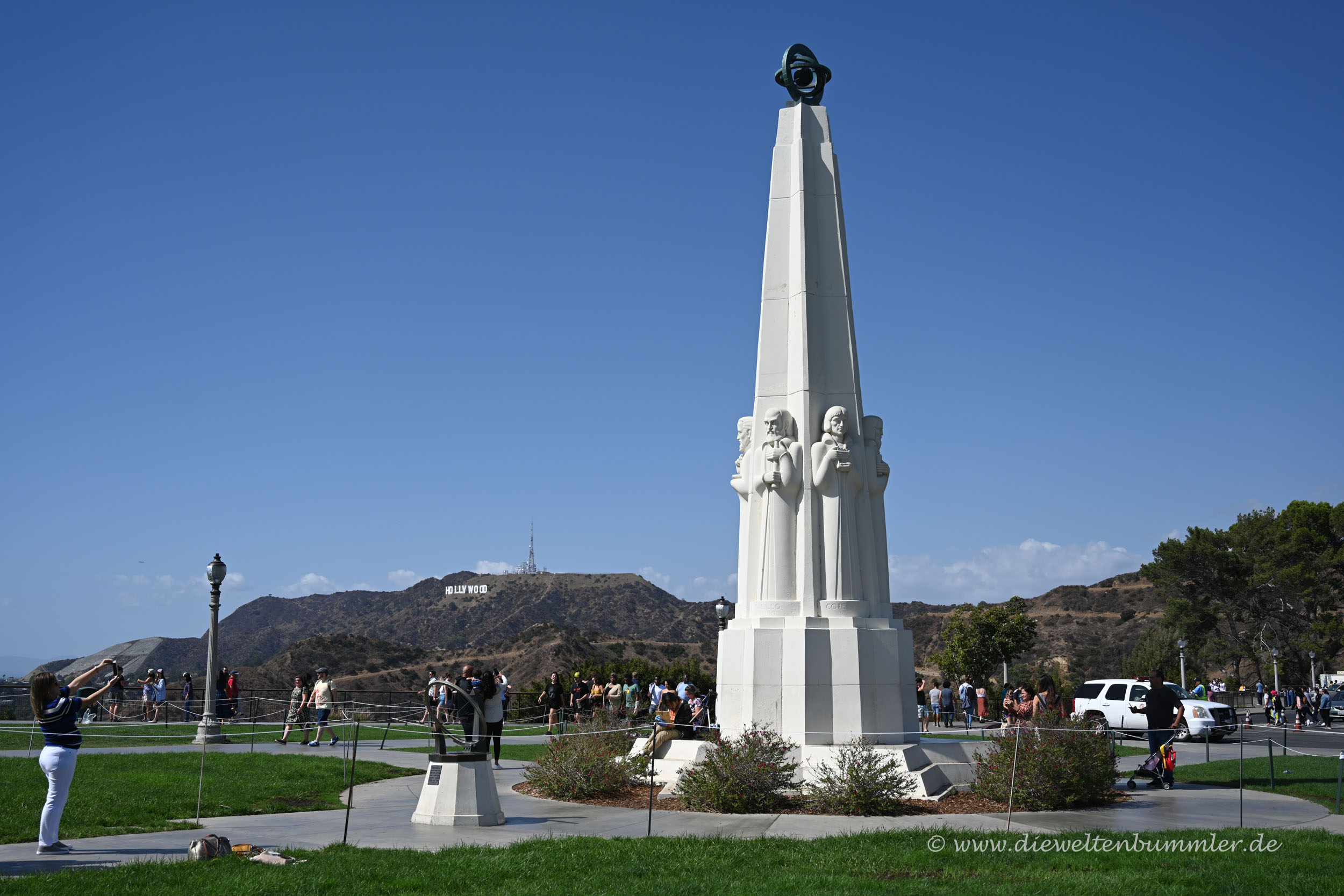Außerdem gibt es neben der Grünfläche vor dem Griffith Observatorium noch ein kleines Denkmal. Zu sehen ist dort die Büste von James Dean. Denn das Gelände diente ebenfalls als Kulisse für seinen ersten Film „…denn sie wissen nicht, was sie tun“. Wo man also hingeht und hinblickt – überall trifft man auf Erinnerungen an verschiedene Filme.