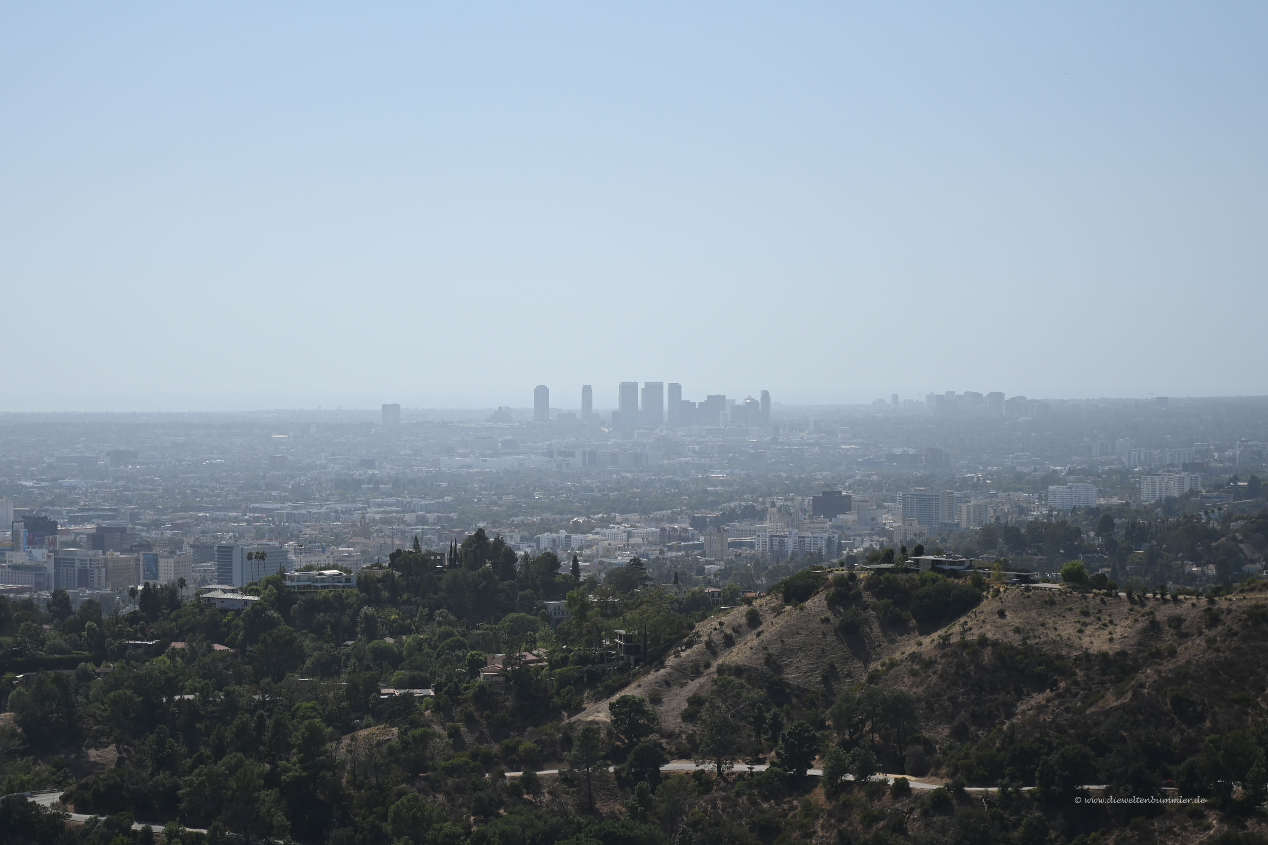 Wobei man da sagen muss, dass Los Angeles mehrere Hochhauskulissen bietet. In Richtung Süden wäre da also das bereits erwähnte Stadtzentrum Downtown. Doch schaut man ein wenig Richtung West und Südwest, so sieht man weitere Hochhäuser, die sich bei Beverly Hills in die Höhe erheben. Erst später habe ich auf den Bildern zum Beispiel auch das Fox Plaza erkannt, dass als Nakatomi Plaza im ersten Teil der Stirb langsam-Reihe mit Bruce Willis als Kulisse diente. Allerdings war es in dieser Richtung so dunstig, dass man es nur schemenhaft sehen kann.