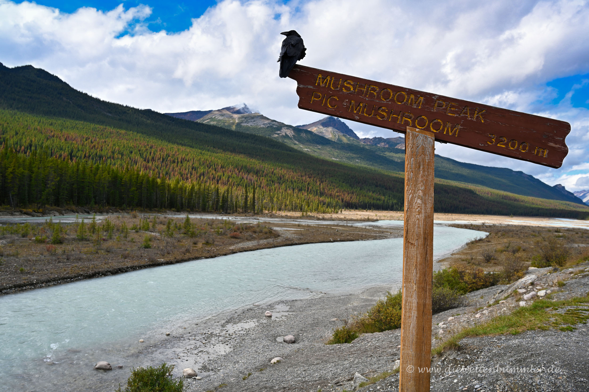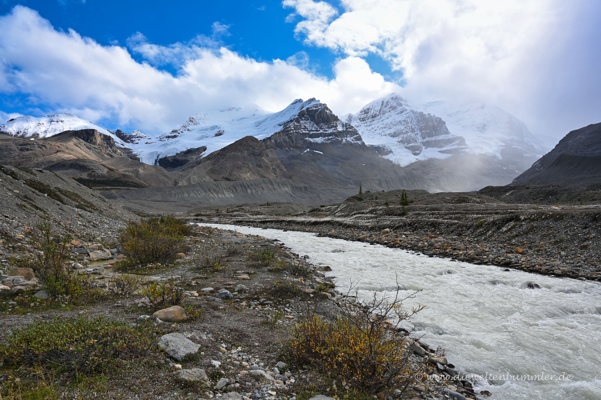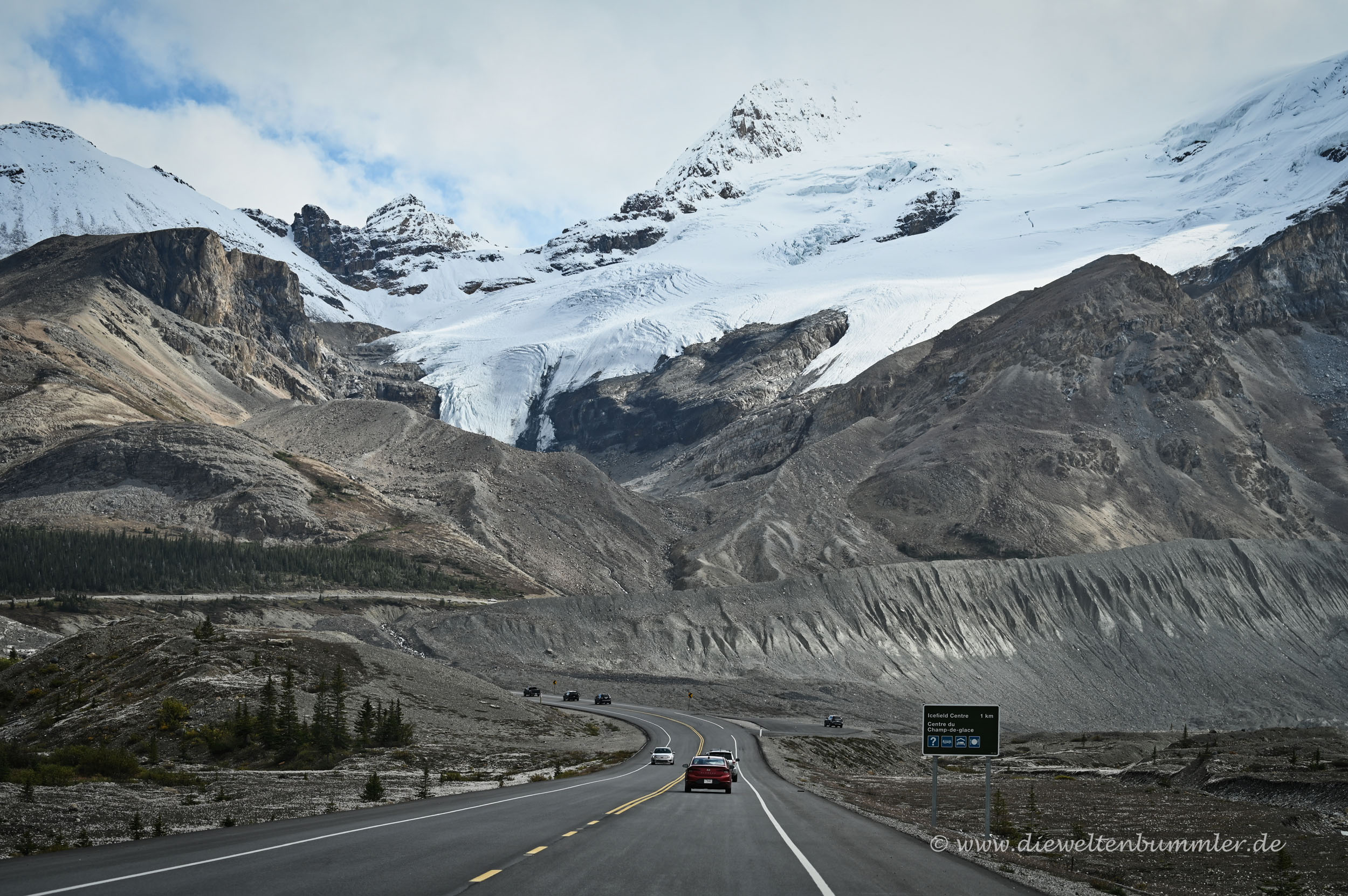 Je weiter man nach Süden fährt um so höher gelangt man. Das bedeutet zugleich, dass man sich dem Höhepunkt des Jasper-Nationalparks nähert. Das ist nämlich das riesige Columbia Icefield mit seinen Gletscherzungen auf den Gipfeln westlich des Tals.