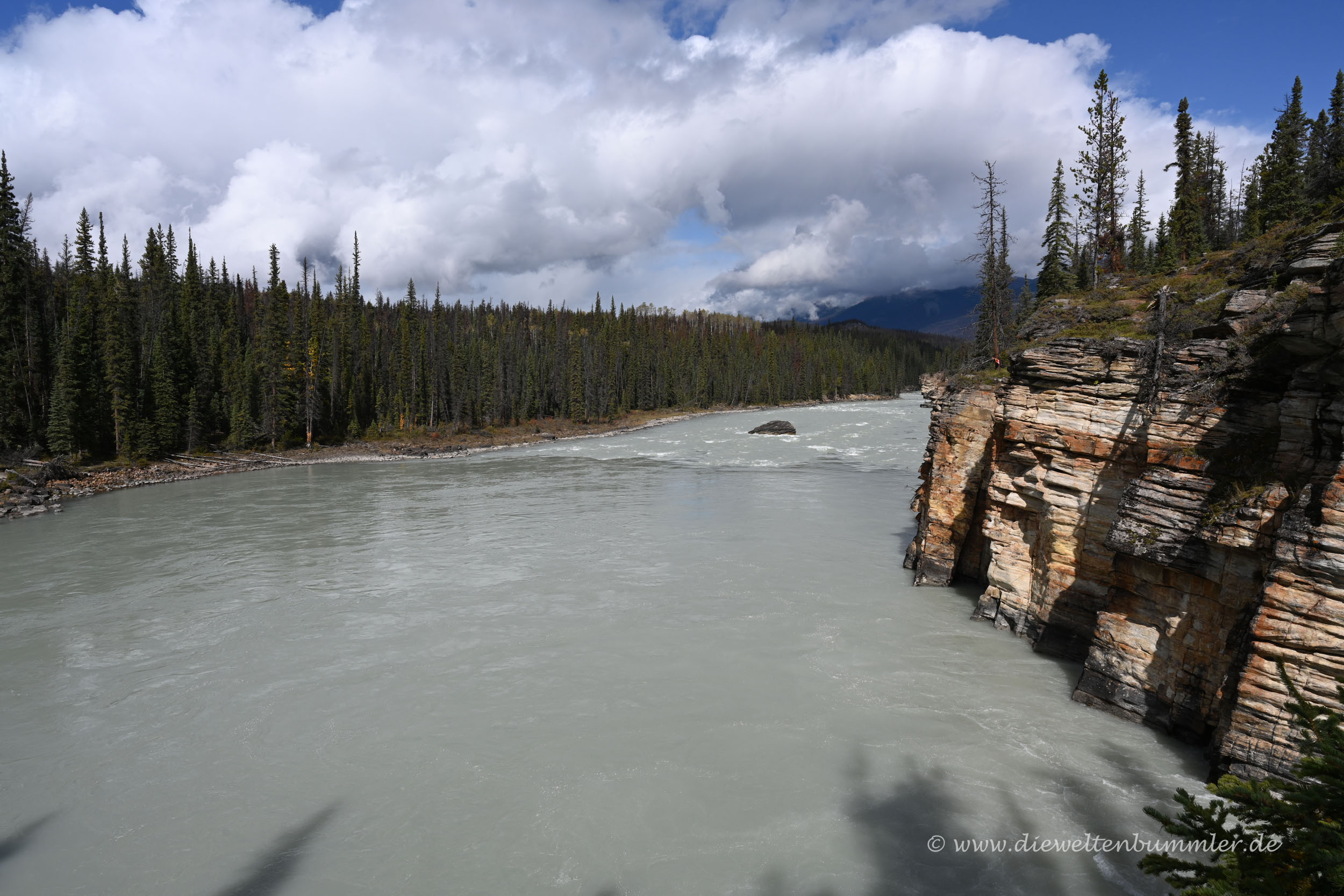 Vom Horseshoe Lake ist es nur ein Katzensprung bis zu den Athabasca Falls. Hier stürzt das Wasser des gleichnamigen Athabasca-Rivers auch mal wieder abenteuerlich in die Tiefe und scheint irgendwo in einem engen Canyon zu verschwinden.