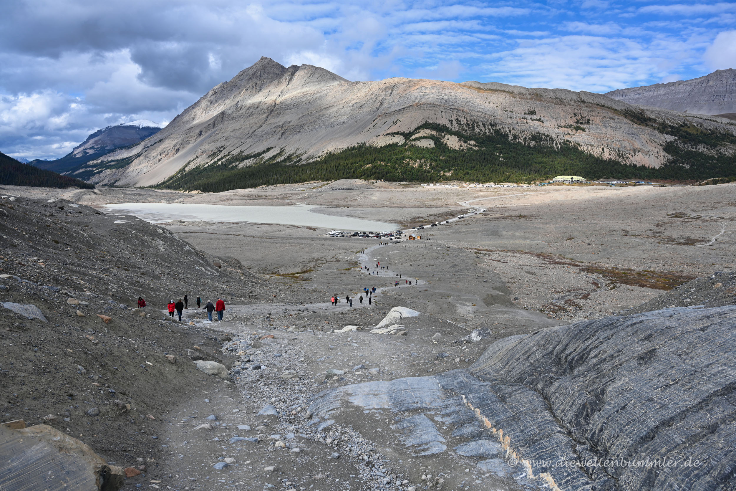Denn auf der anderen Seite der Straße erstreckt sich die Zunge des Athabasca-Gletschers, der wiederum Teil des darüber befindlichen Columbia Icefields Parkway ist. Diese Gletscherzunge kann man mit einem geländegängigen Bus befahren, der für Polarexpeditionen gebaut wurde.