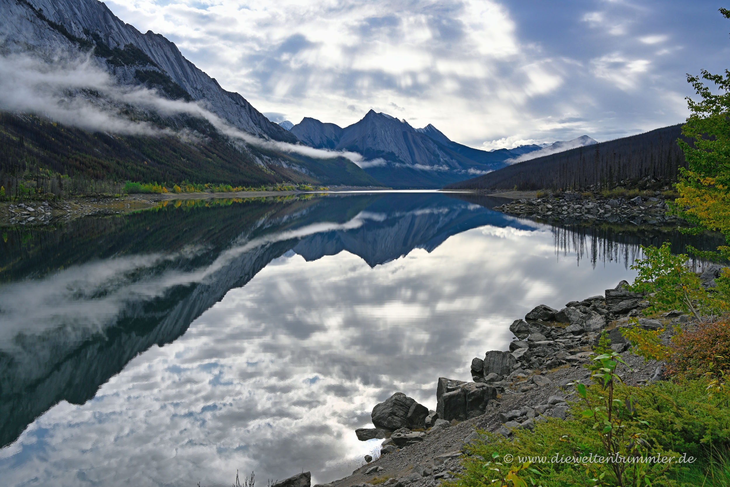Auf die Fahrt auf dem Maligne Lake haben wir verzichtet, weil unsere Zeit es nicht zuließ. Wir waren eben nicht im Urlaub im Jasper-Nationalpark, sondern auf einem Roadtrip und damit eher auf der Durchreise. Außerdem fiel das Wetter an diesem Tag eher bescheiden aus und die Wolken hingen sehr tief. So tief, dass man von vielen Bergen die Gipfel nicht sehen kann. Da lohnte sich die nicht ganz günstige Fahrt mit dem Boot einfach nicht.