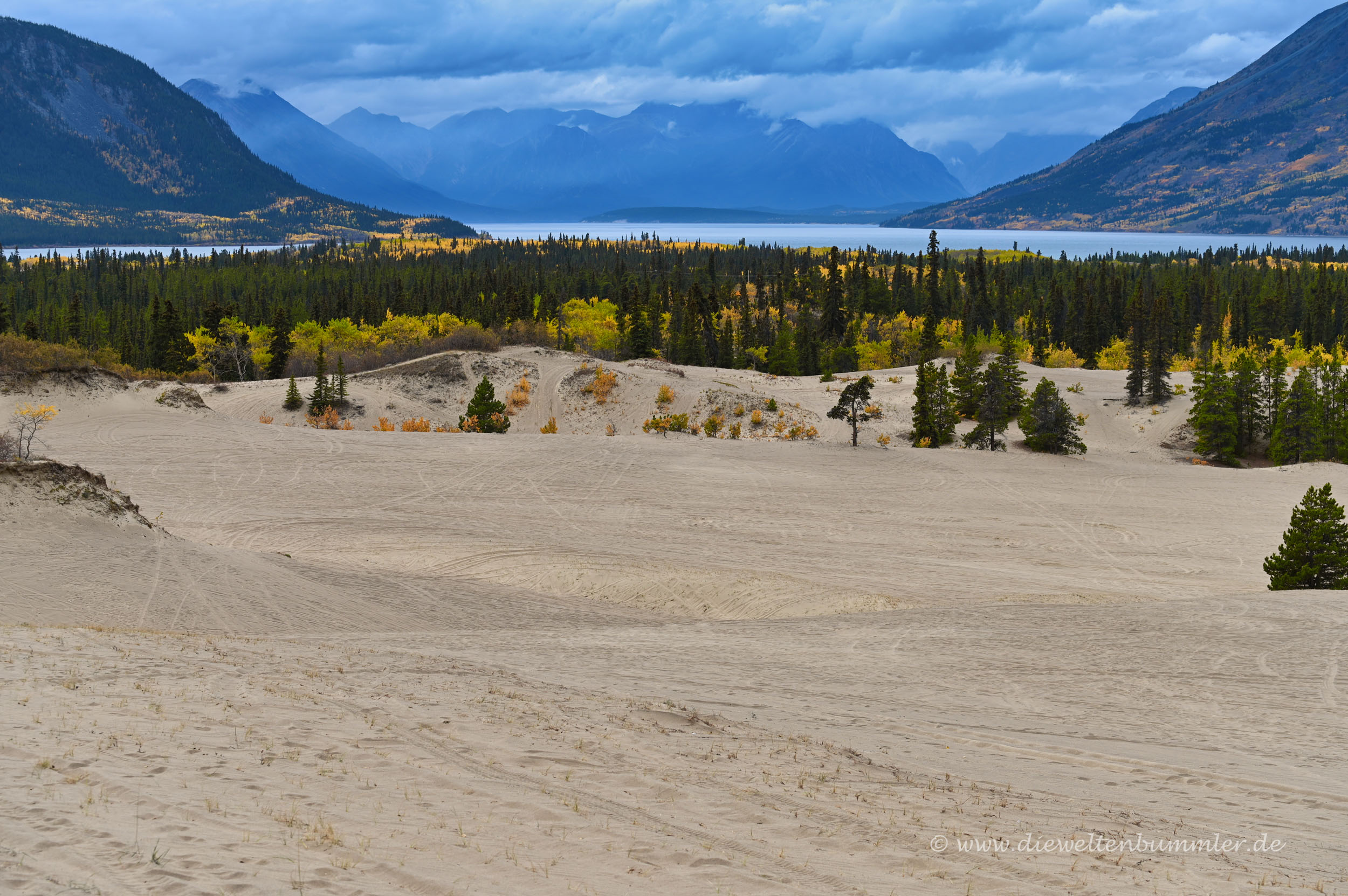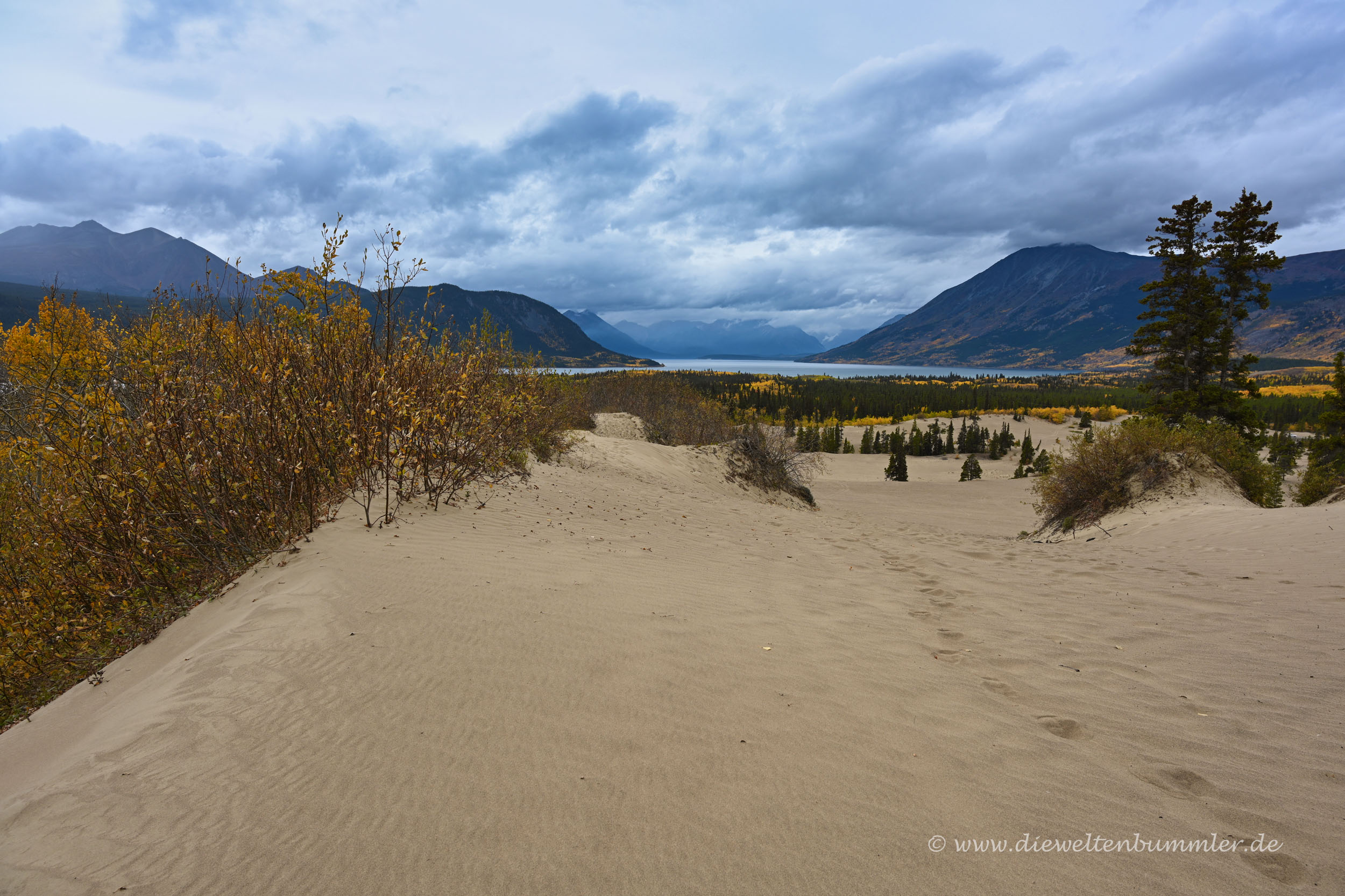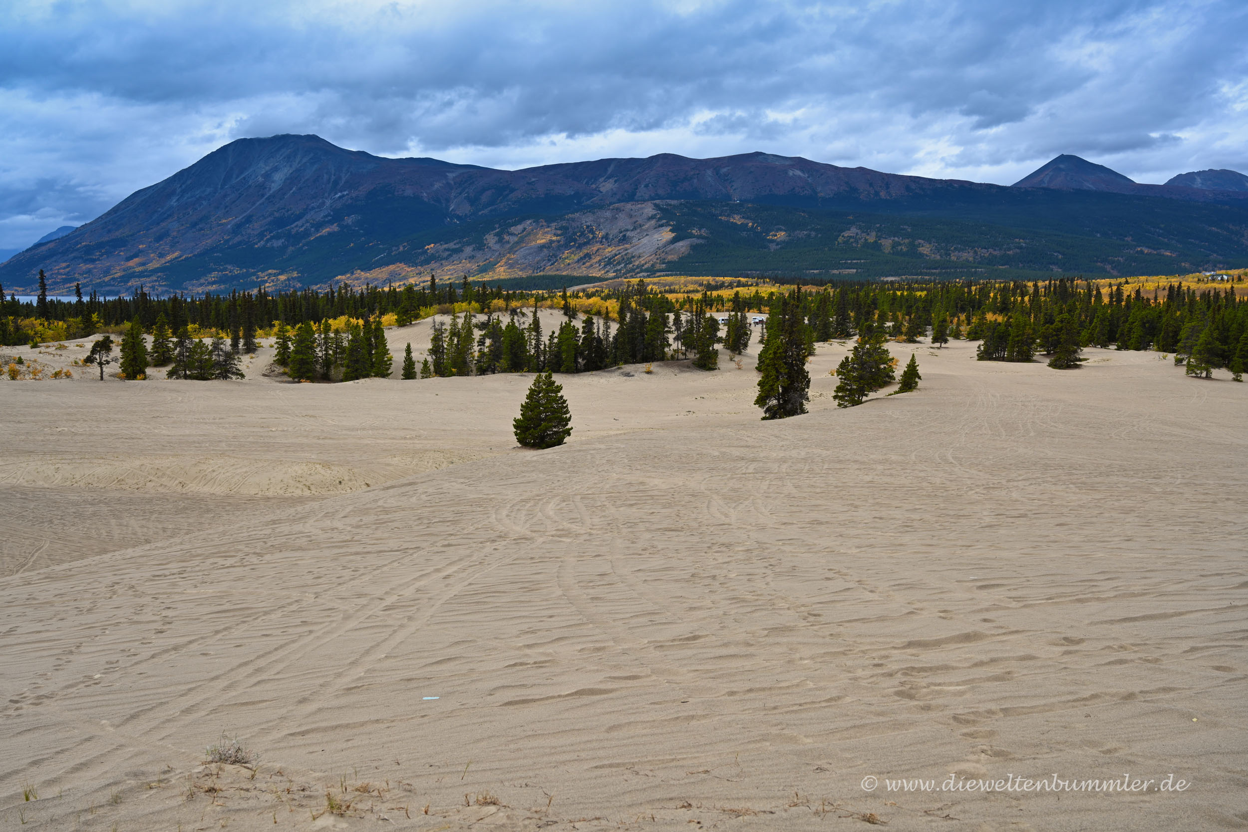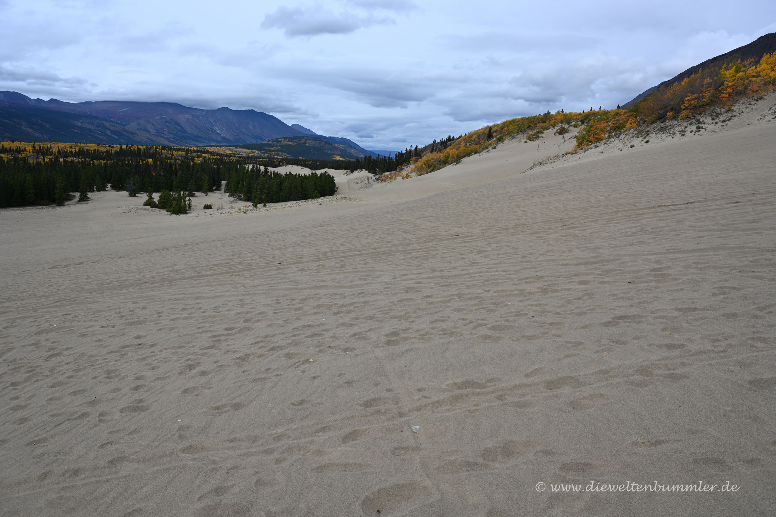 Die Düne ist nicht geschützt und kann frei betreten werden. Vom obersten Punkt aus hat man schließlich einen schönen Überblick auf die sandige Landschaft, die wiederum von den hohen Bergen im Yukon umgeben ist. In nicht allzu weiter Ferne erblickt man dann auch noch den Lake Bennett, der sich vor der Gebirgskulisse abzeichnet. Einfach nur schön.