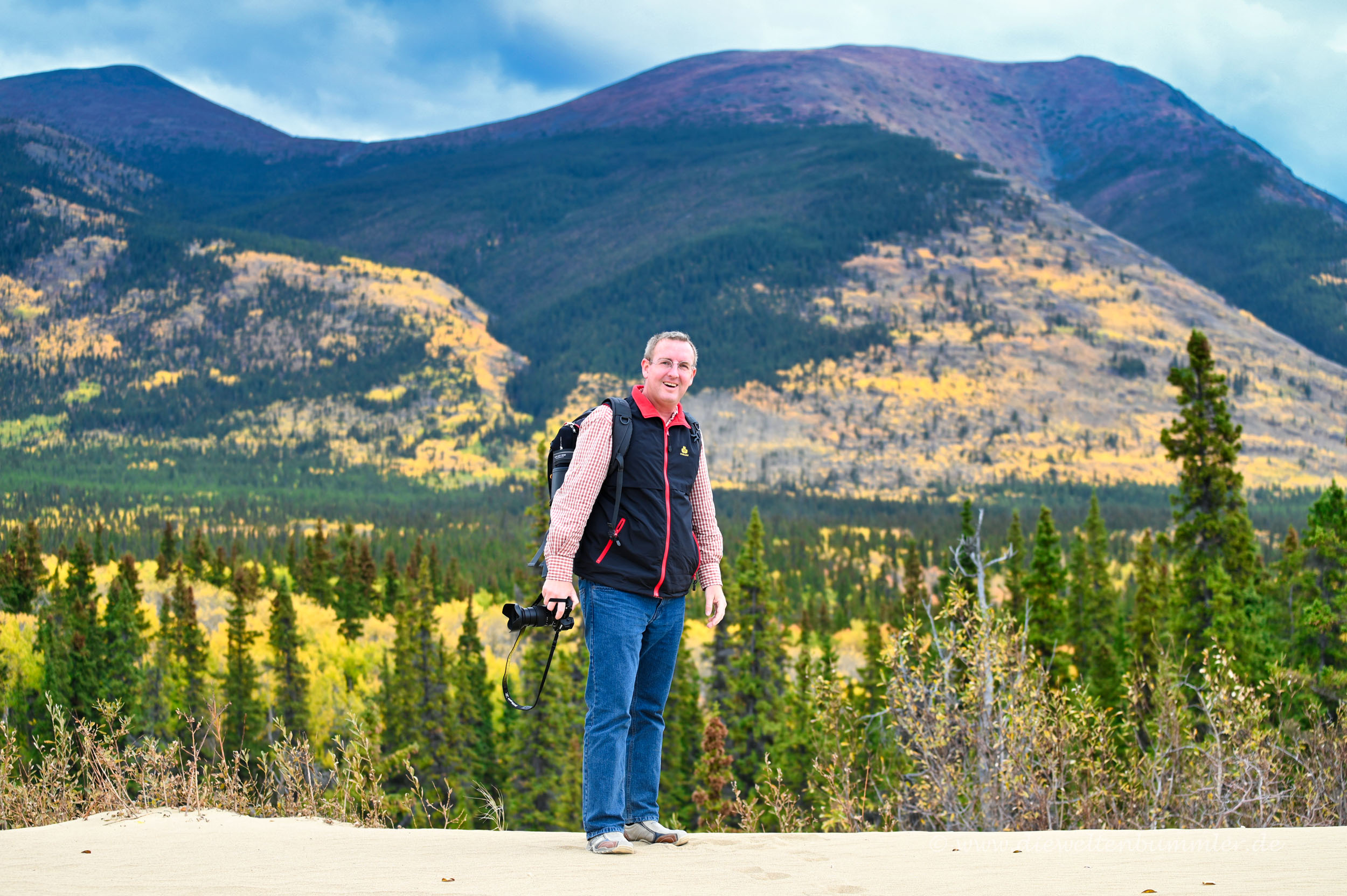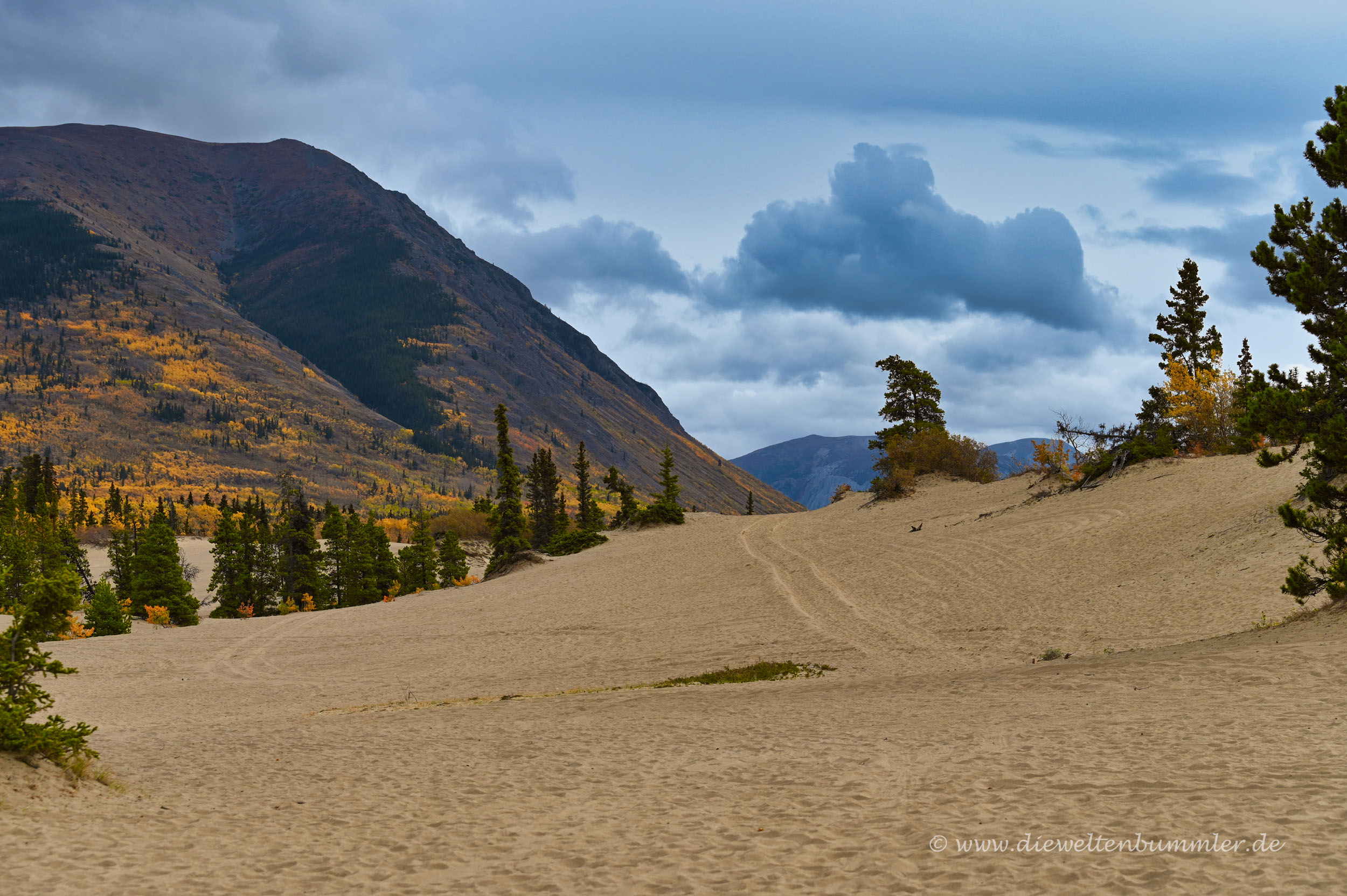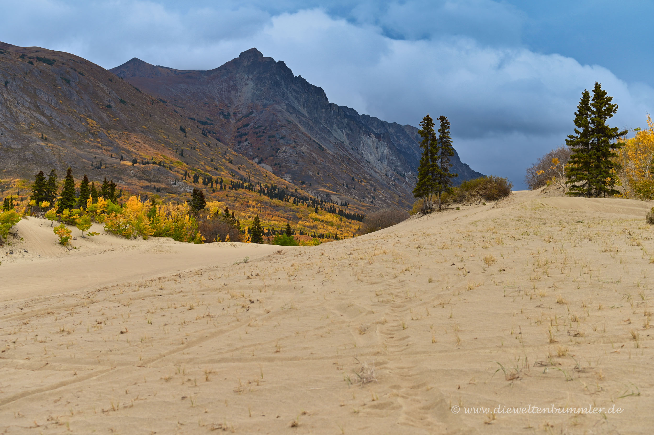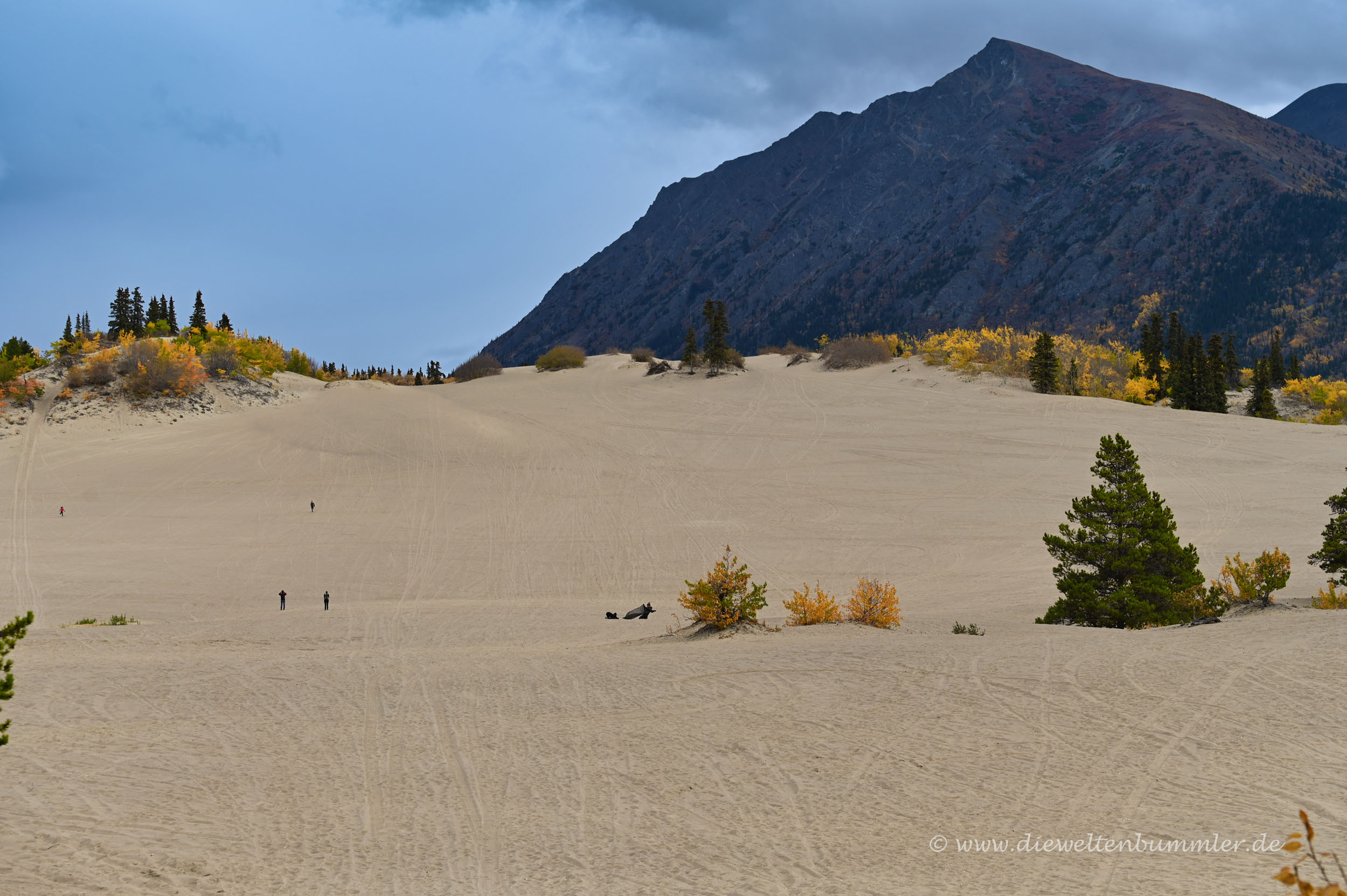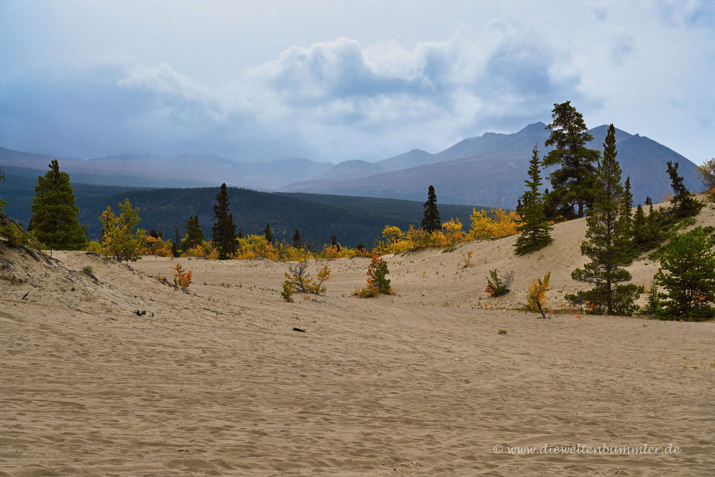 Die Düne ist nicht geschützt und kann frei betreten werden. Vom obersten Punkt aus hat man schließlich einen schönen Überblick auf die sandige Landschaft, die wiederum von den hohen Bergen im Yukon umgeben ist. In nicht allzu weiter Ferne erblickt man dann auch noch den Lake Bennett, der sich vor der Gebirgskulisse abzeichnet. Einfach nur schön.