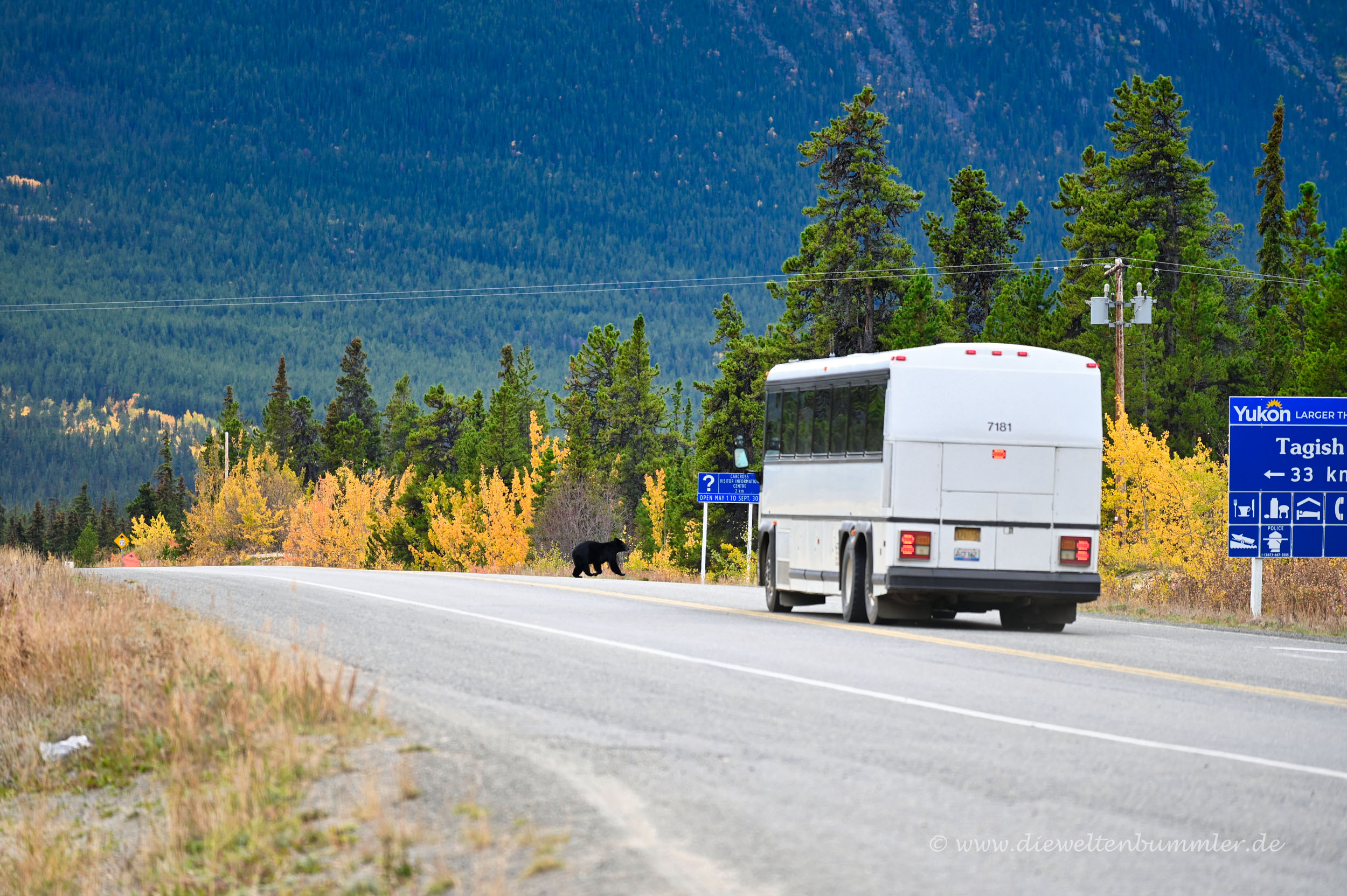 Er kam aus der gleichen Richtung wie wir, trottete aber wohl parallel zu uns im angrenzenden Wald entlang. Er hätte uns ungewollt jeder Zeit den Weg abschneiden können. So sahen wir nur noch, wie er über die Straße lief und zum Glück schneller wurde, als gerade ein Bus angefahren kam. Wir befürchteten schon, wir würden Zeugen eines tragischen Unfalls werden. Aber dem war nicht so und so blieb uns die Sanddüne von Carcross gut in Erinnerung.