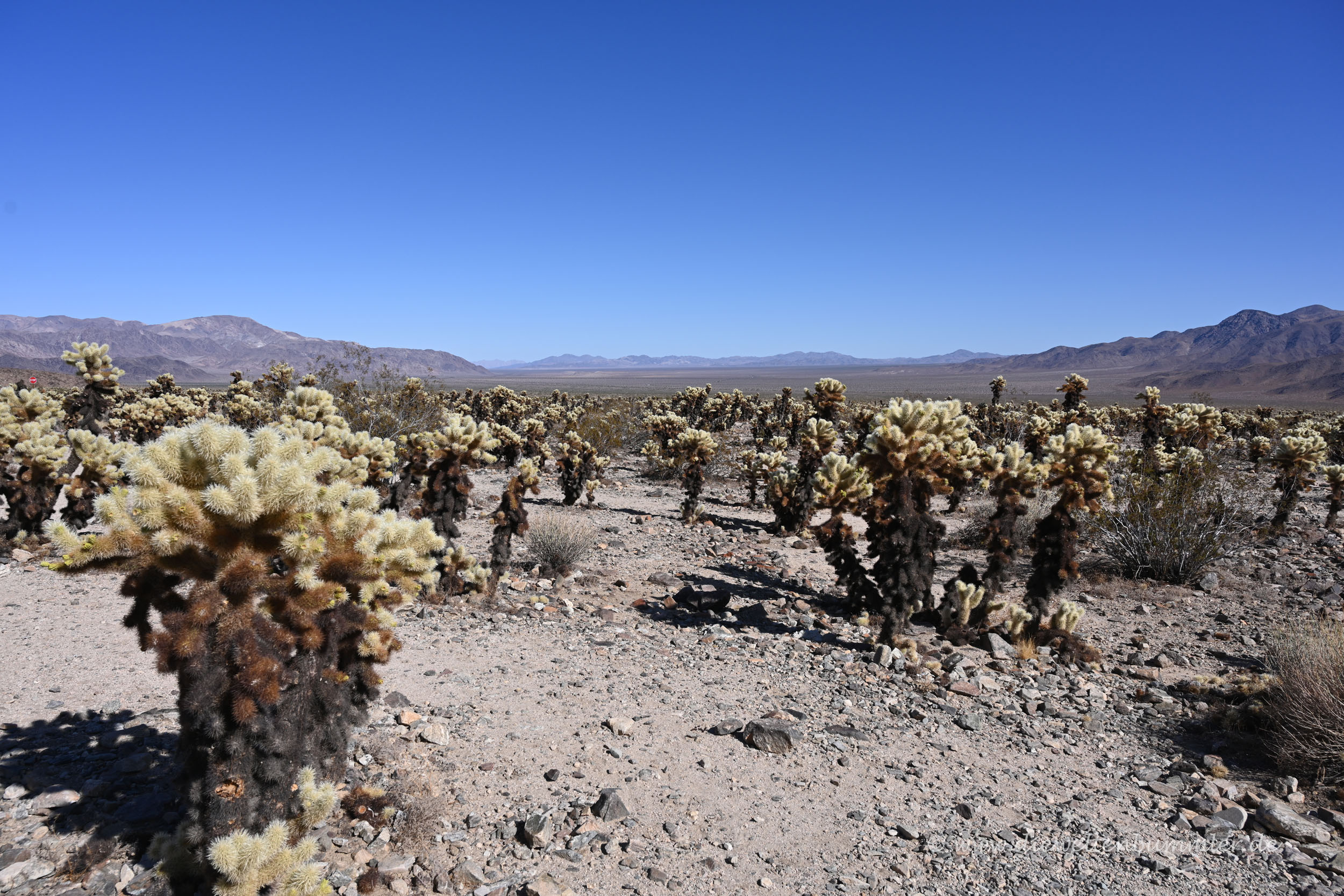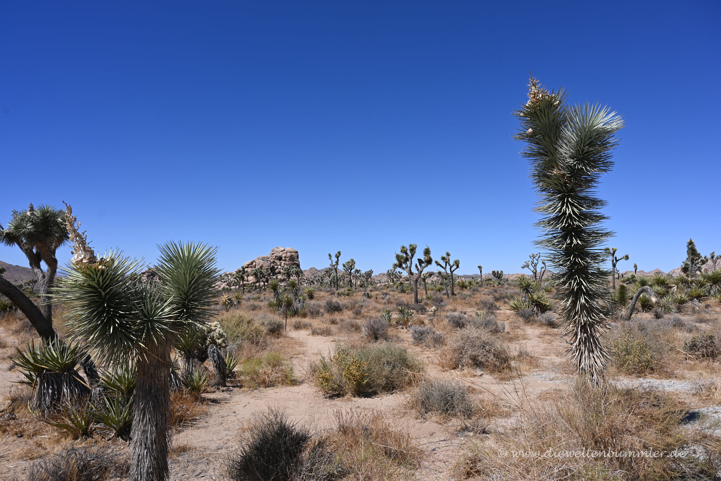Aber es sind dennoch jede Menge Josua-Palmlilien, soweit das Auge reicht. Und das reicht auf jeden Fall bis zu den umliegenden Berggipfeln, denn man ist selber auf einer Art Plateau unterwegs. Vielleicht ist es auch eine Senke, ich weiß es nicht. Es ist auf jeden Fall weite, flache von Bergen umgebende Landschaft.