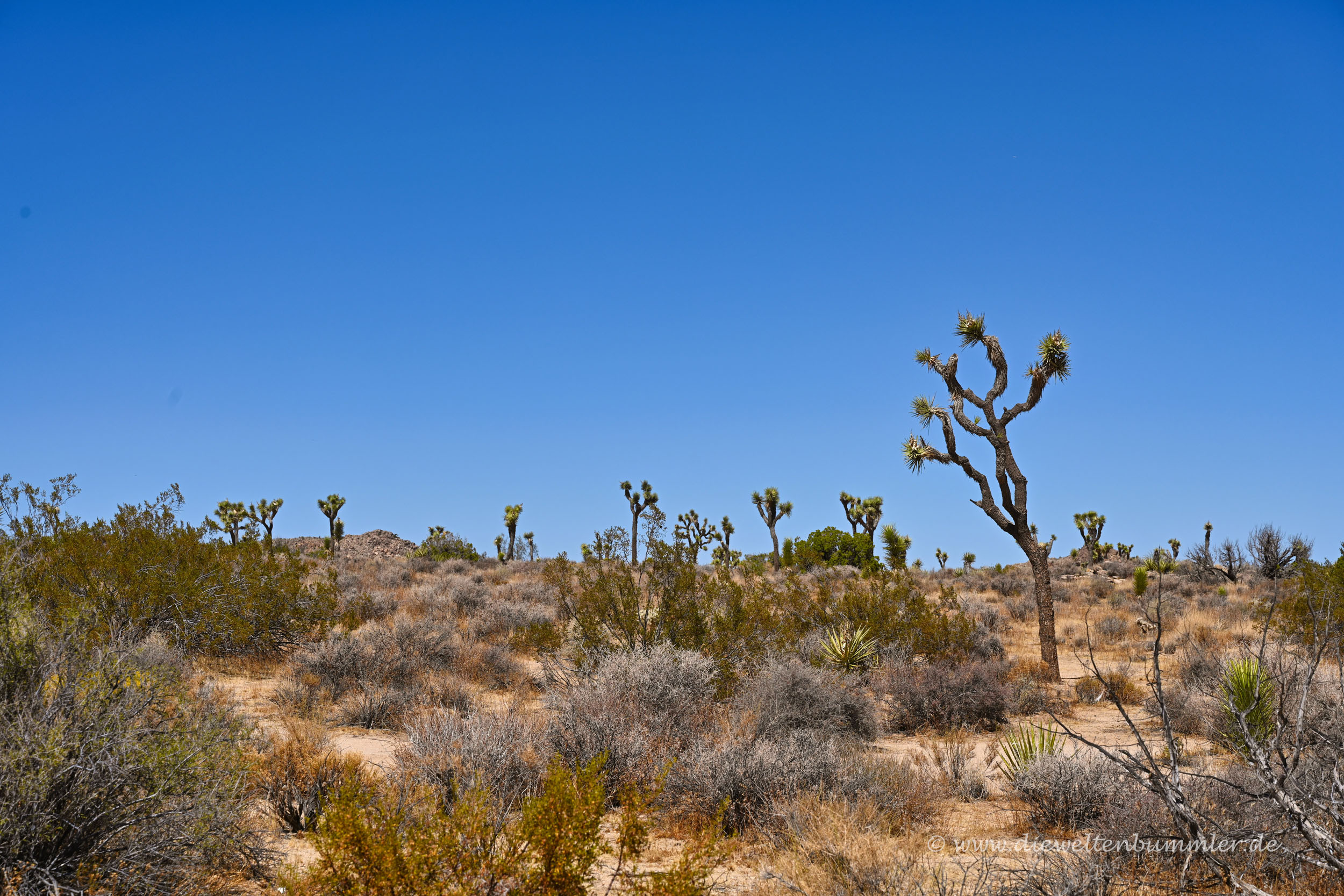 Die Landschaft ist überwiegend wüstenartig, dennoch haben wir Unterschiede festgestellt, besonders bei der Flora. Anfangs fährt man in der Tat an zahlreichen Joshua-Bäumen vorbei. Das gleicht natürlich nicht einem klassischen Wald, wie wir das aus unseren Breitengraden kennen.