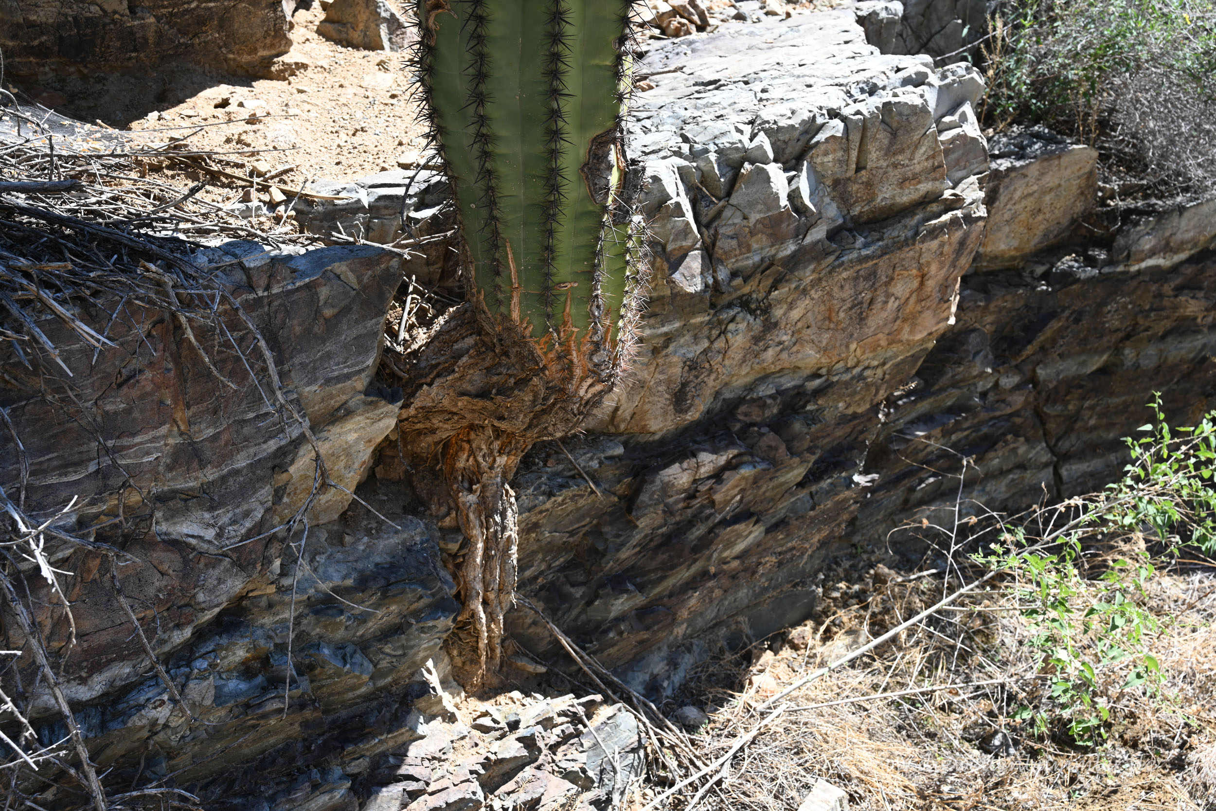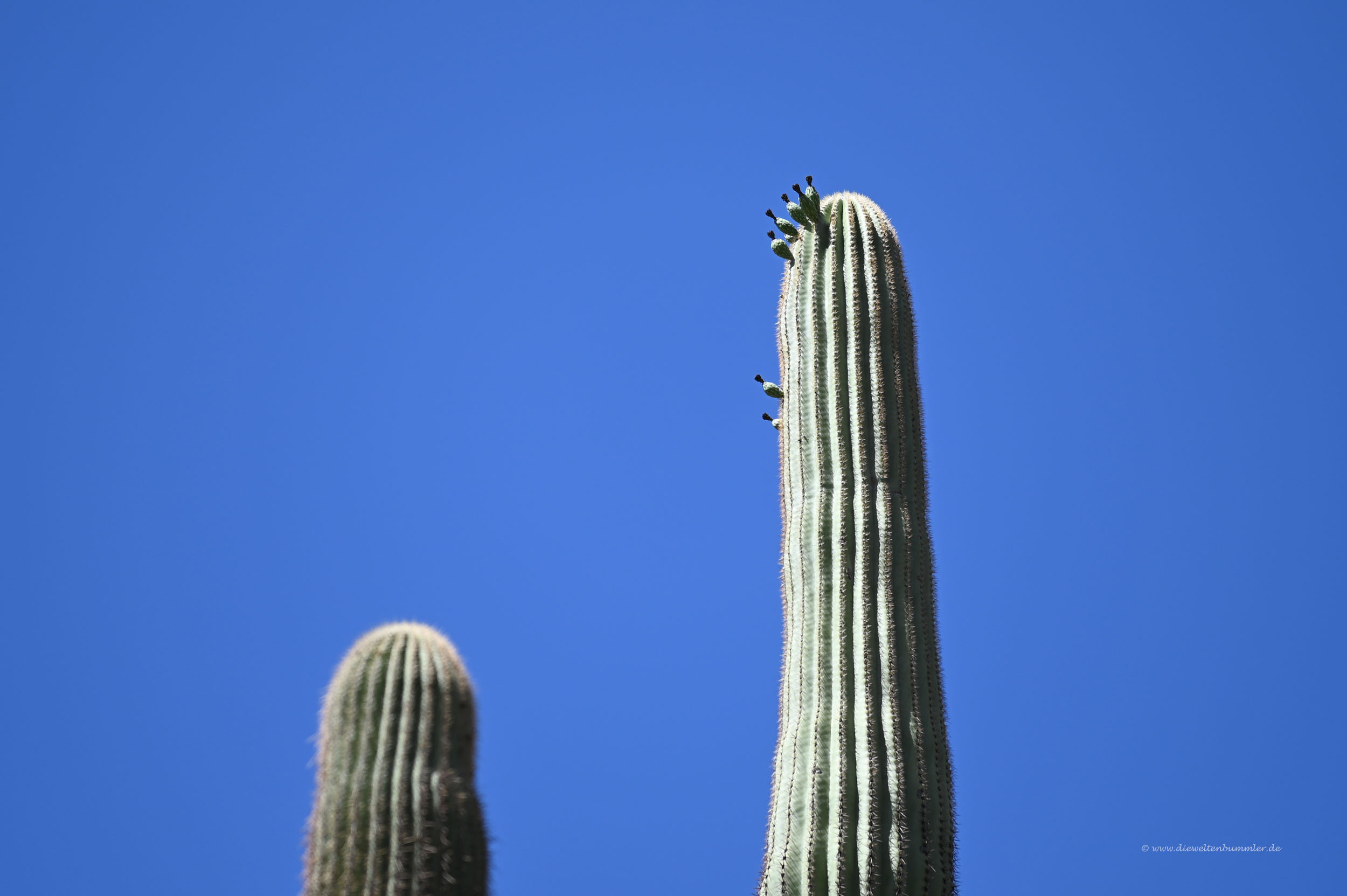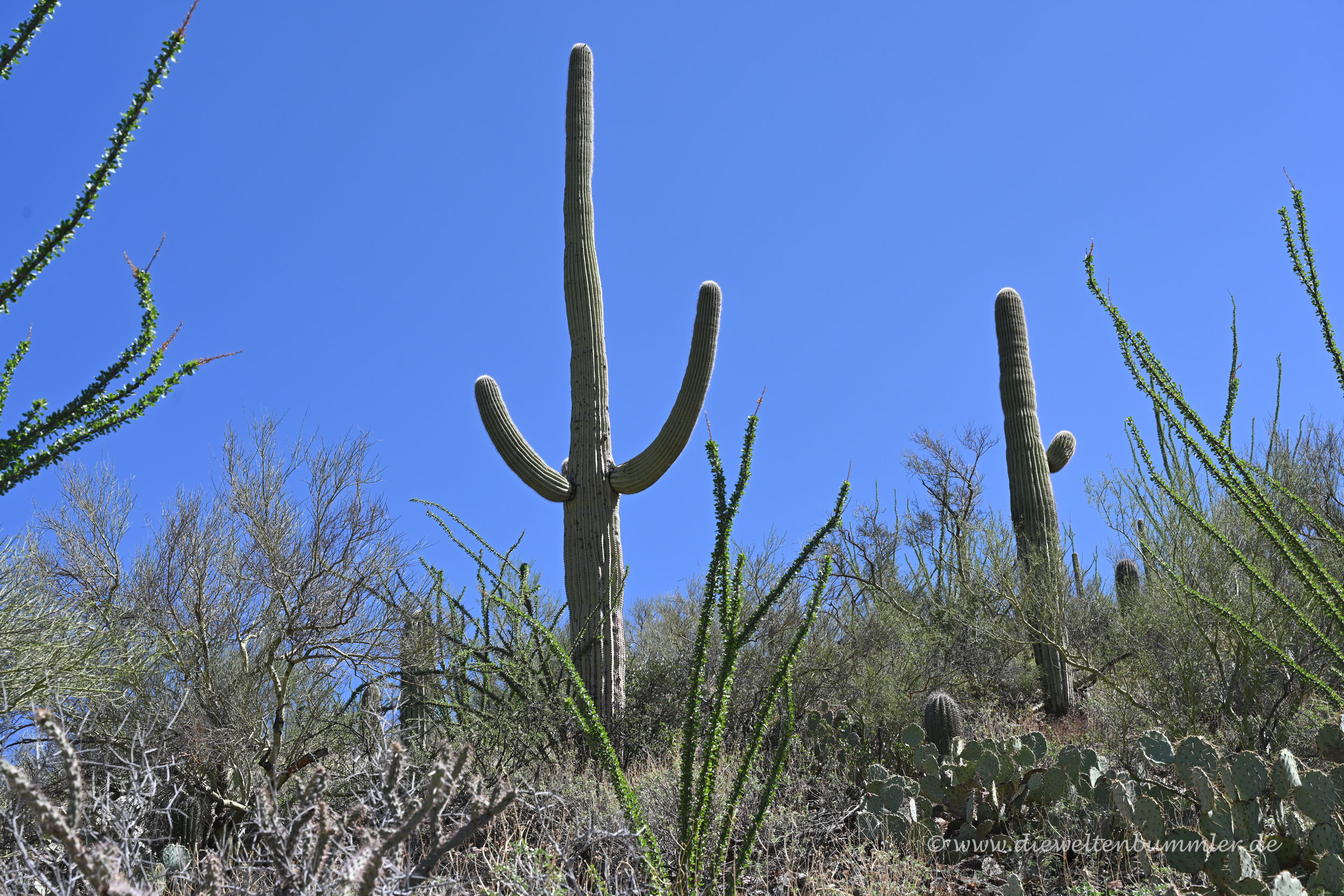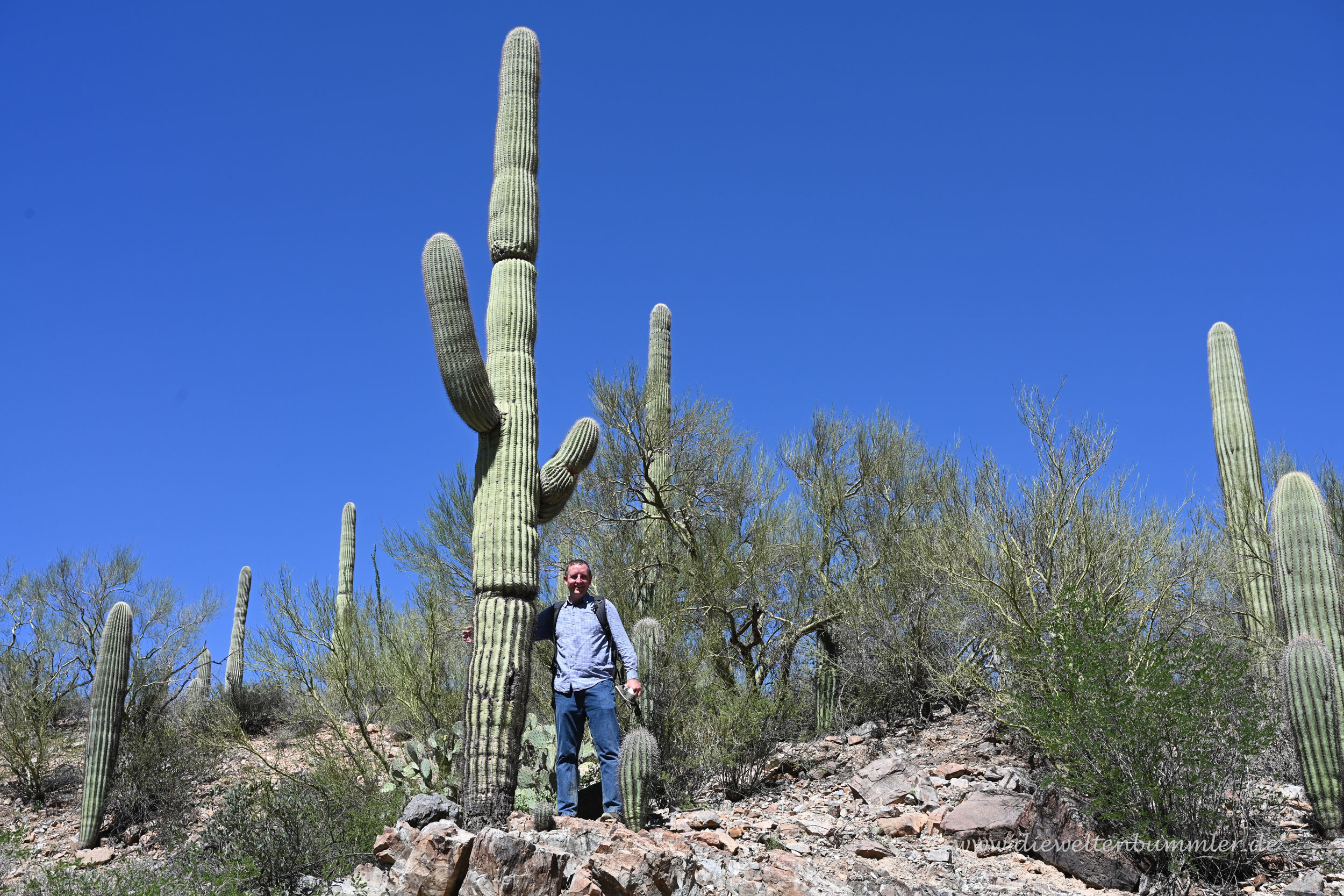 Prachtvoll ragten sie rechts und links des Wanderwegs in die Höhe. Es war dieses klassische Bild von einem grünen Säulen-Kaktus unter blauem Himmel und vor rot-brauner Wüstenlandschaft. Schöner und typischer konnte es nicht werden.