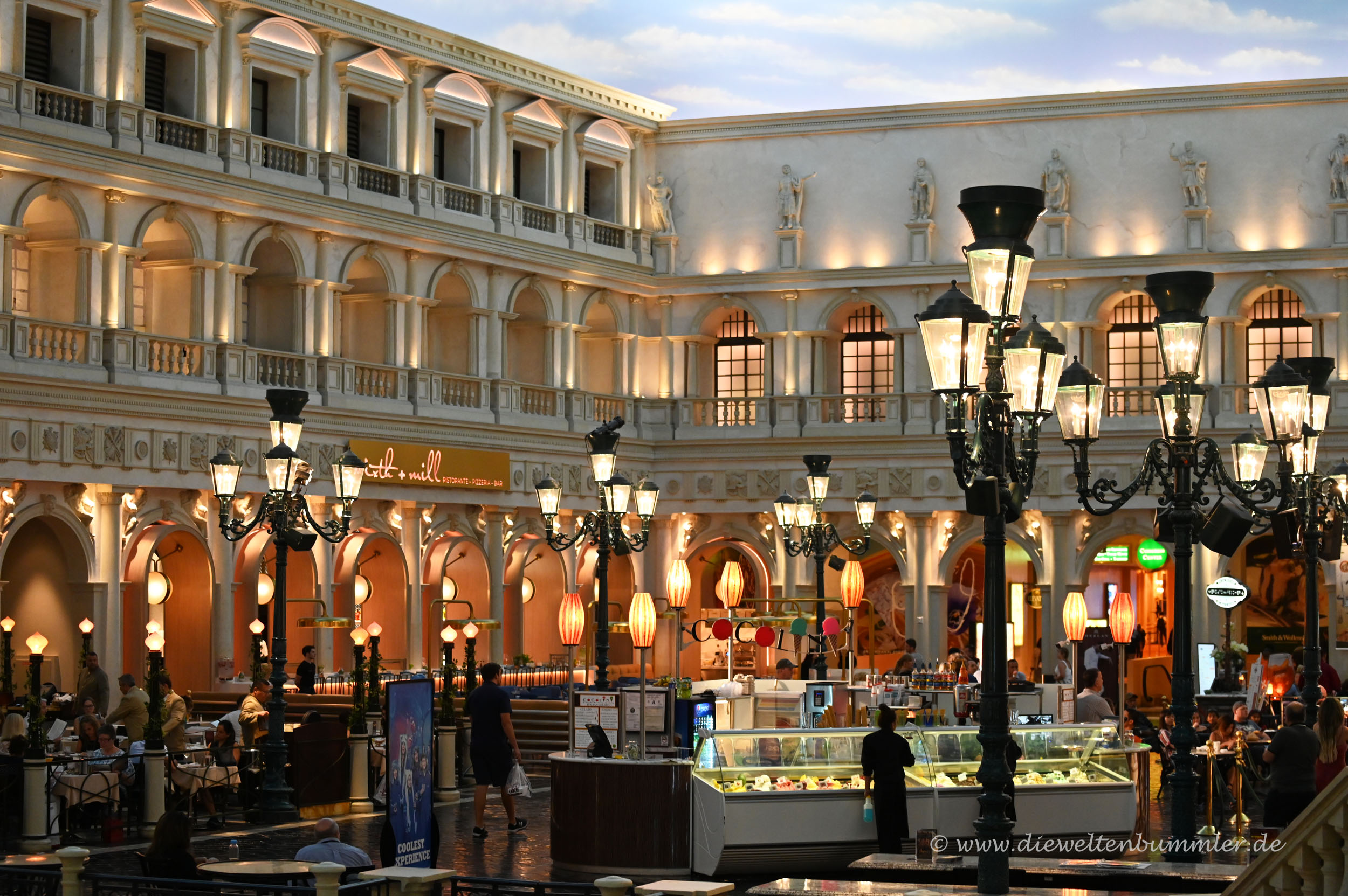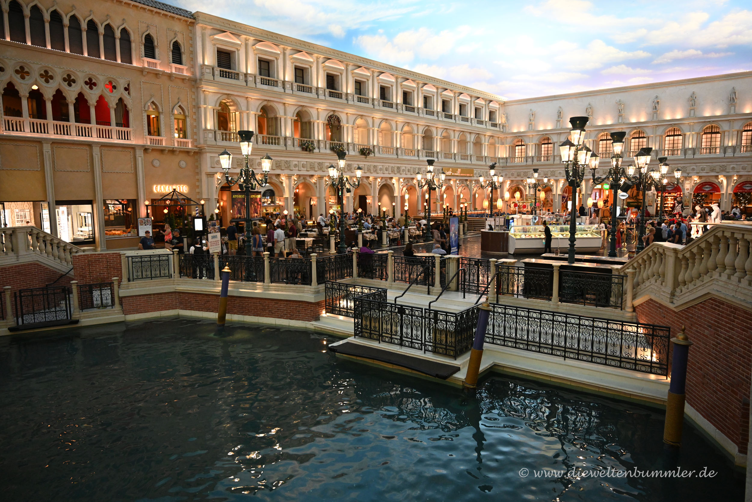 Man gibt hier wirklich sein Bestes. Straßenkünstler tanzen zur Musik unter dem gemalten italienischen Himmel, während man in einem Straßencafé der Darbietung lauscht oder von Shop zu Shop schlendert. Es ist alles nicht echt, ganz klar. Aber es ist ein echtes Erlebnis, diese venezianische Nachbildung im Venetian mal gesehen zu haben.