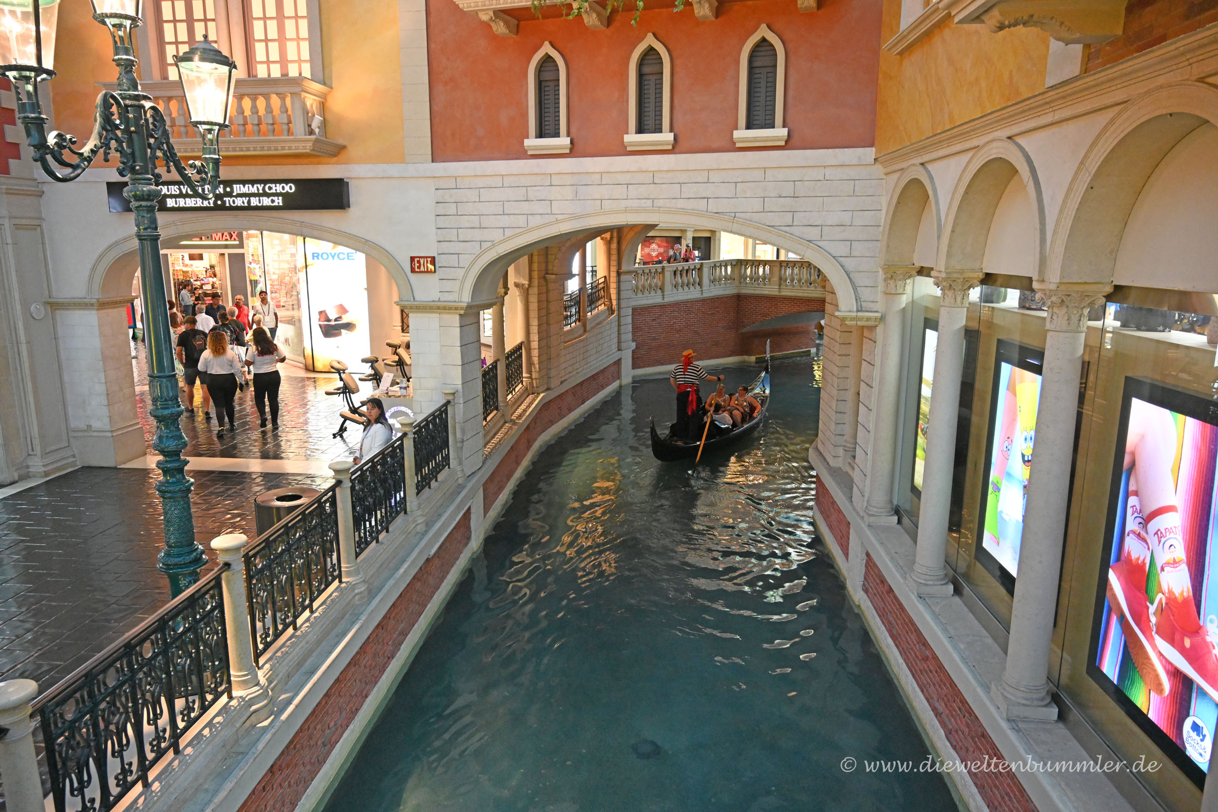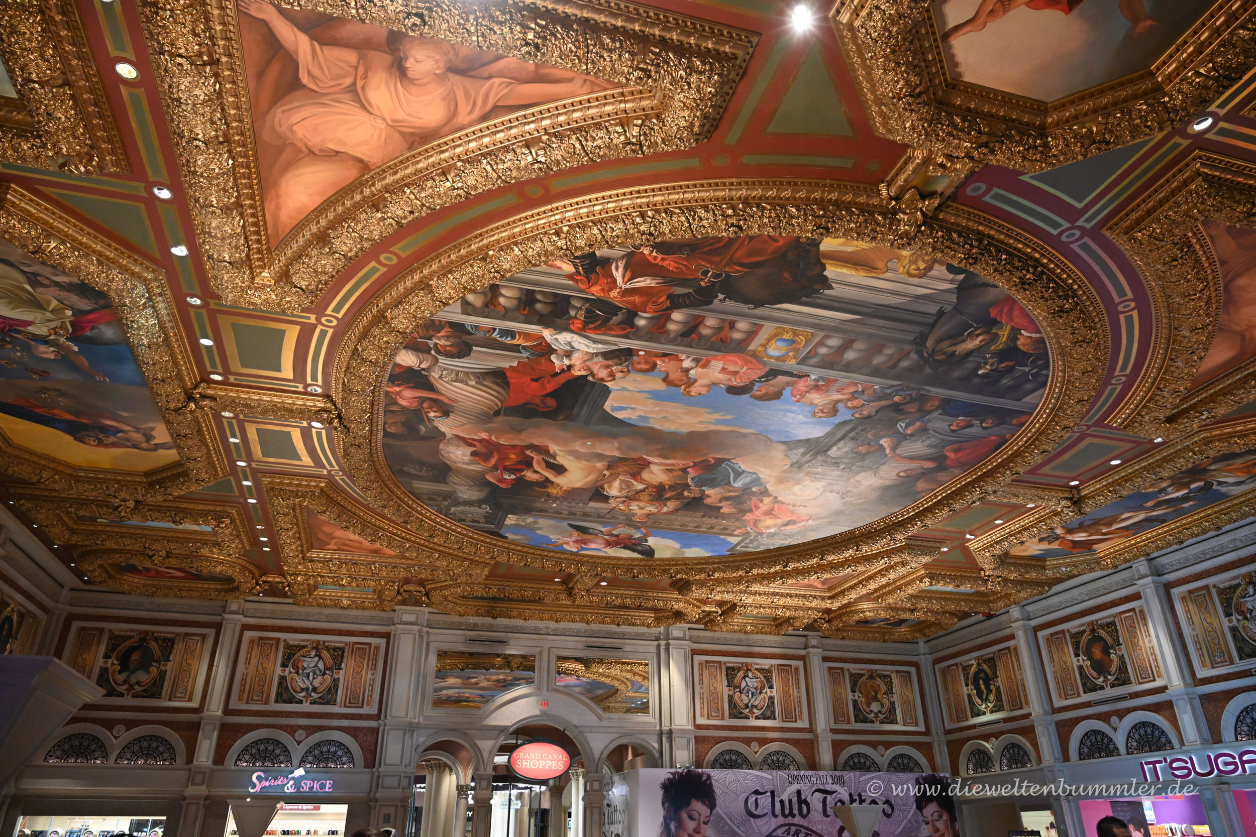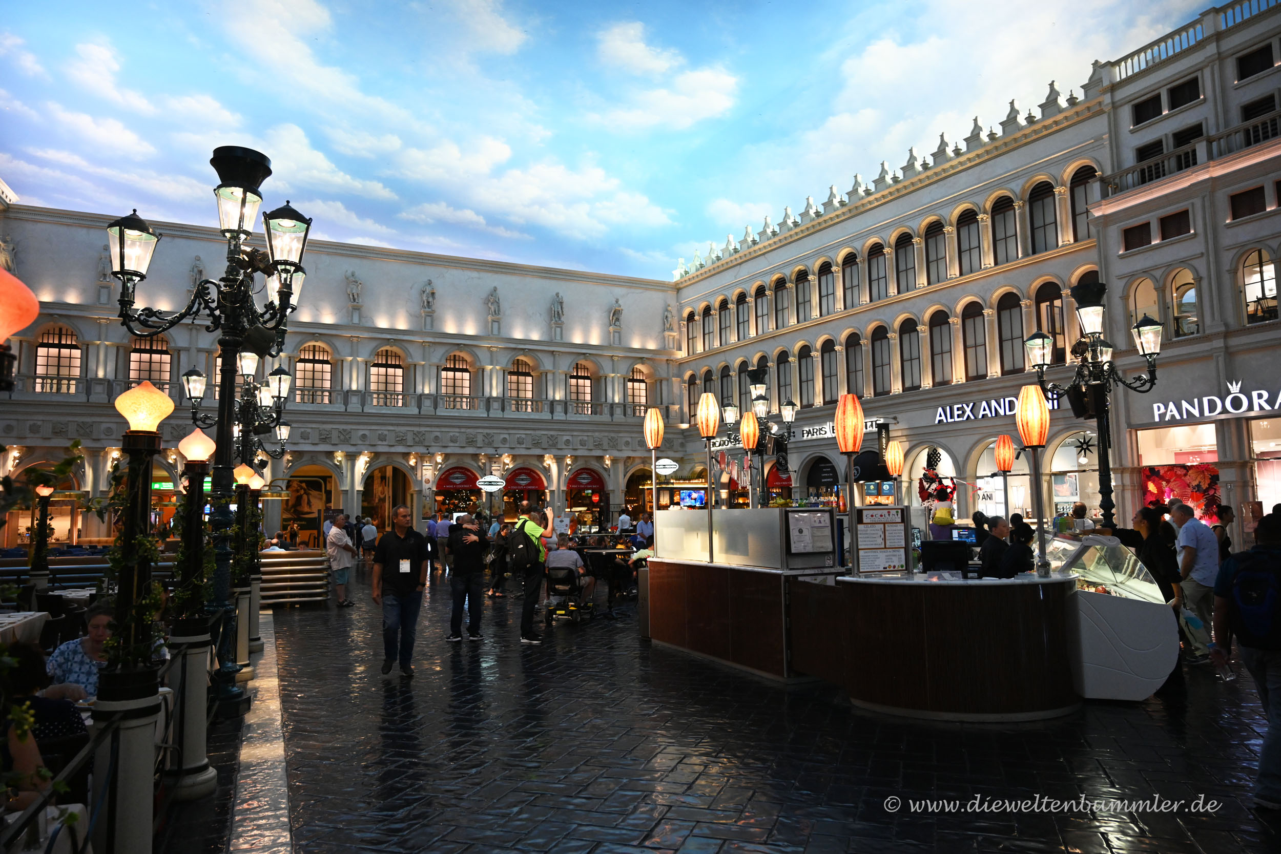 Denn innerhalb des Gebäudes geht es ja mit den venezianischen Eindrücken weiter. Die Decke ist hellblau gestrichen und zeigt ein paar Wolken. Damit soll das Leben in Venedig unter freiem Himmel gezeigt werden. Man schlendert zwischen all den vielen Shops also nicht in einer Mall, sondern am Canal Grande in Venedig. Und ja, selbstverständlich gibt es im Hotel Venetian auch Kanäle – natürlich inklusive Fahrt in einer Gondel.