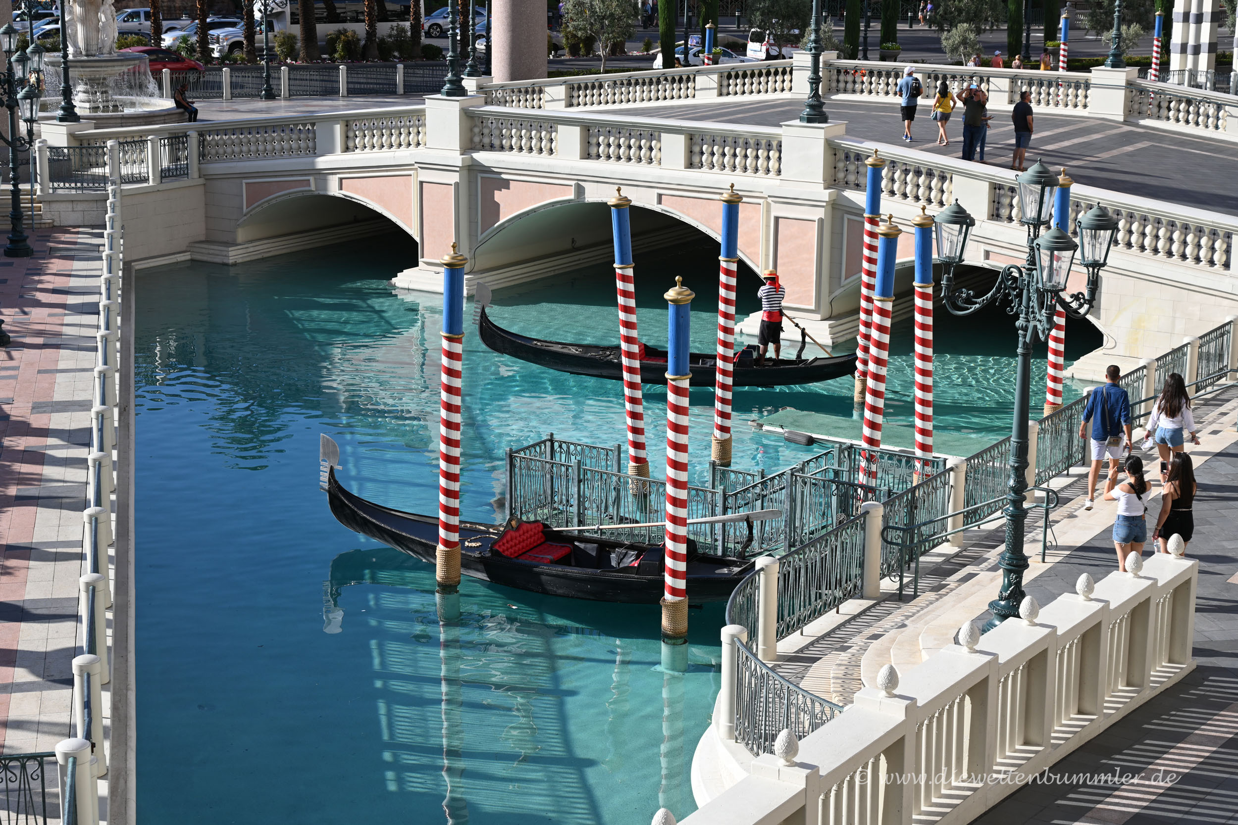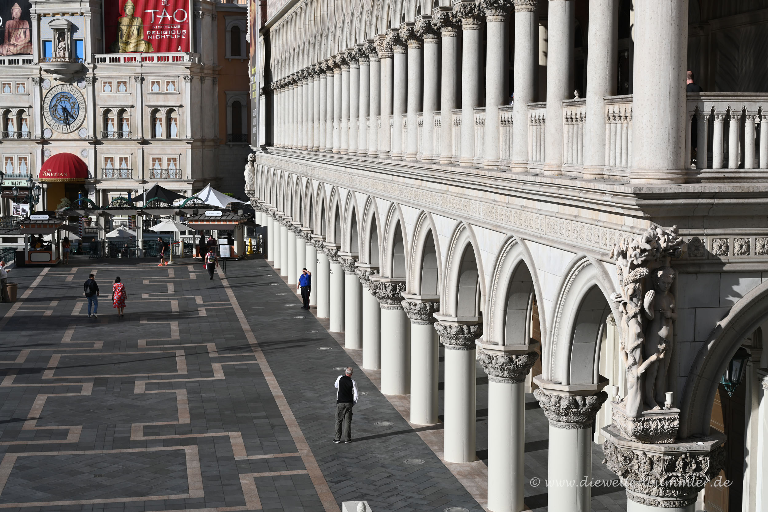 Der Brücke folgt sogleich ein weiteres bedeutendes Gebäude Venedigs – der Dogenpalast. Wie das Original ist auch die Fassade des Dogenpalastes im Venetian in Las Vegas mit einem Säulengang ausgestattet. Zwischen diesen Säulen blickt man auf den Vorplatz, der aus einem großen Wasserbecken besteht. Keine Frage, dass hier auch Gondoliere mit ihren Gondeln unterwegs sind – eben so wie sich die Amerikaner Venedig vorstellen.