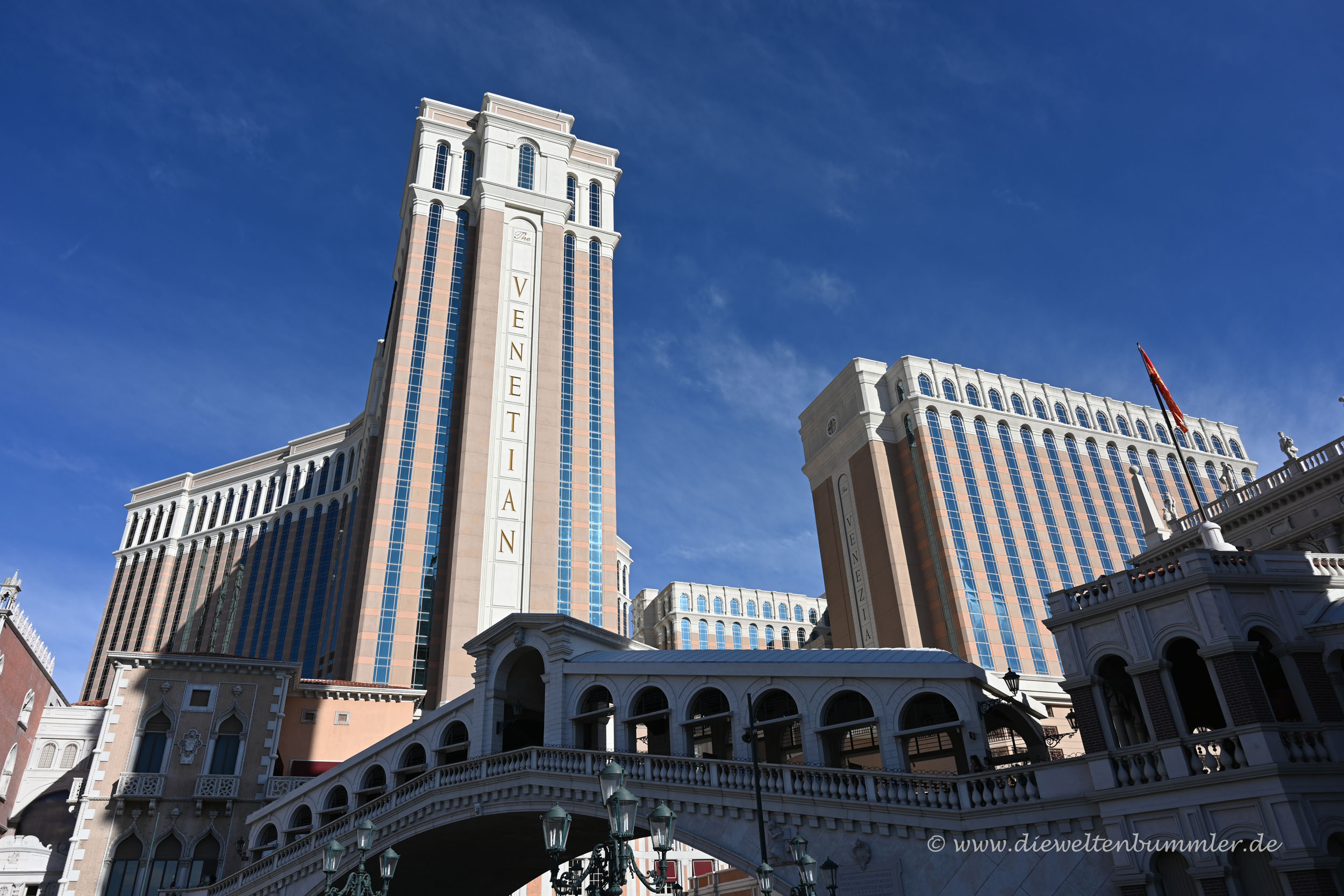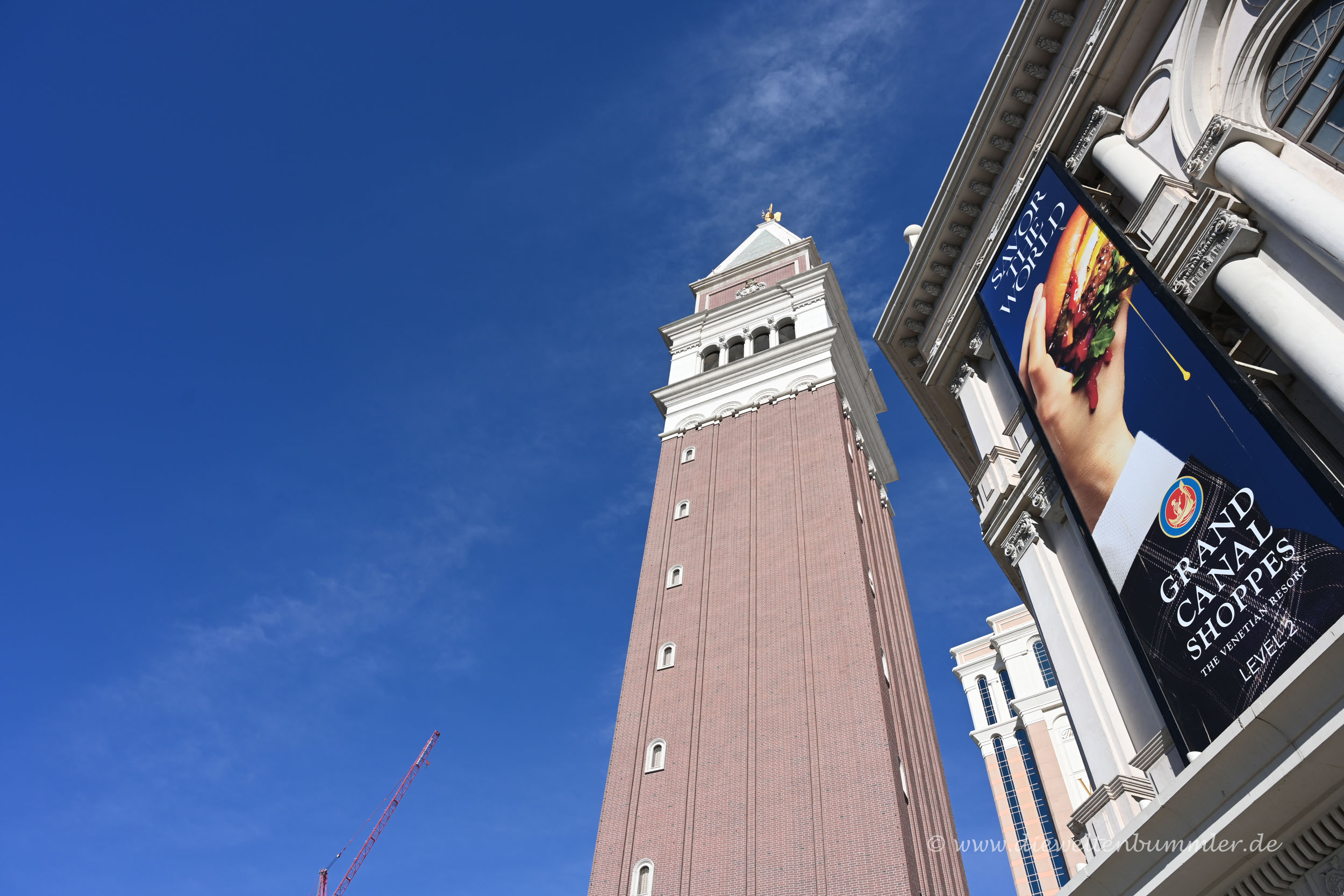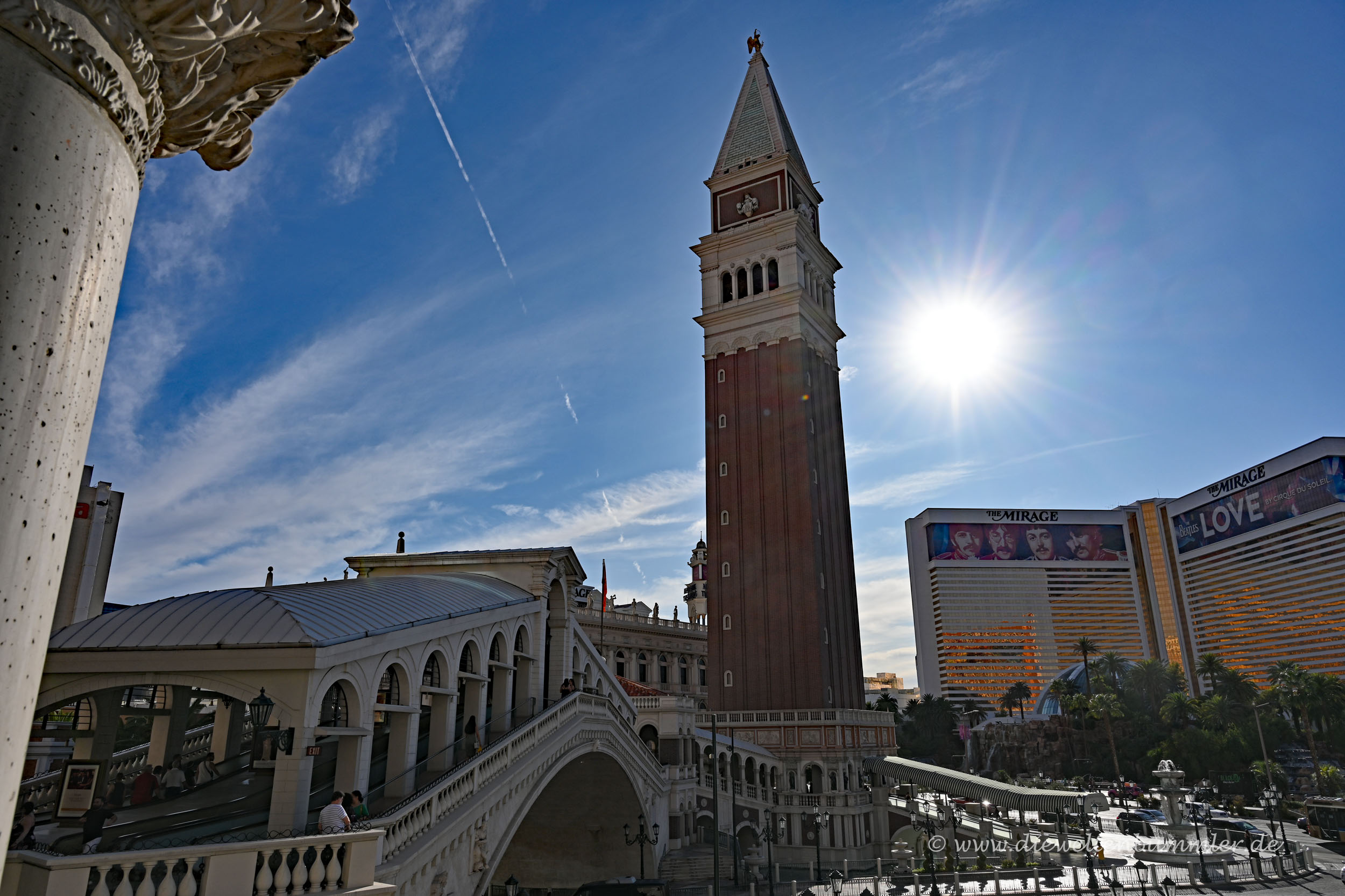 Beim Venetian lautet das Motto natürlich Venedig. Schon von Weitem sieht man den Nachbau des berühmten Markusturms. Der Campanile erhebt sich stolz neben dem Nachbau der Rialtobrücke.