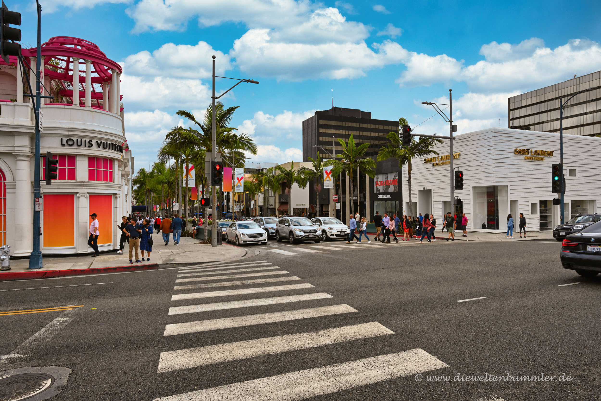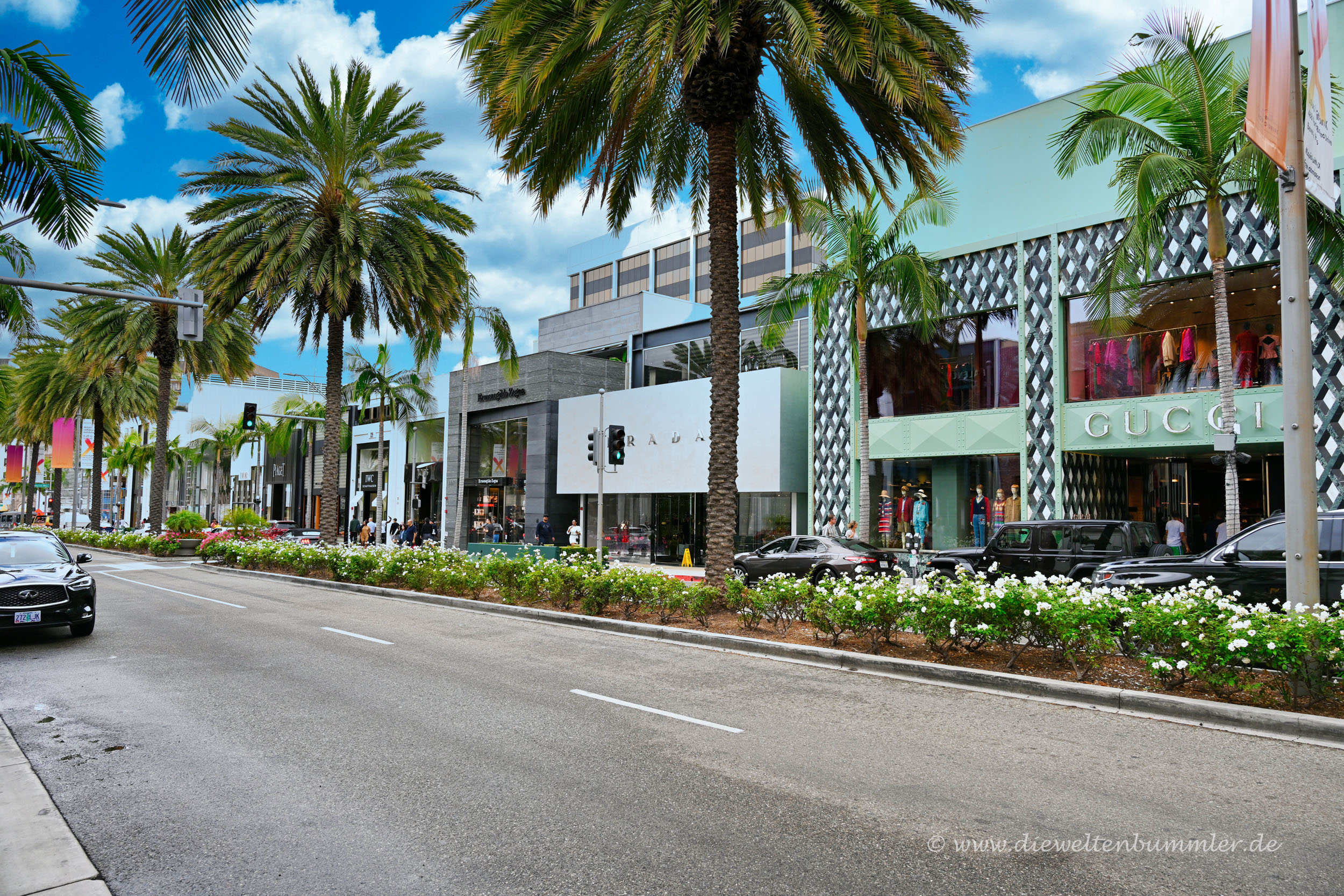 Nur einen Block weiter überquert man den zweigeteilten Santa Monica Boulevard, um den Rodeo Drive zu erkunden. Auf einer Länge von gut 500 Metern gibt es hier wirklich alles, was in der Modebranche Rang und Namen hat. Wir waren in keinem der Läden drin. Erstens brauchten wir gerade keine neue Handtasche und zweitens war uns nicht ganz klar, ob wir überhaupt einfach so hineingehen könnten.