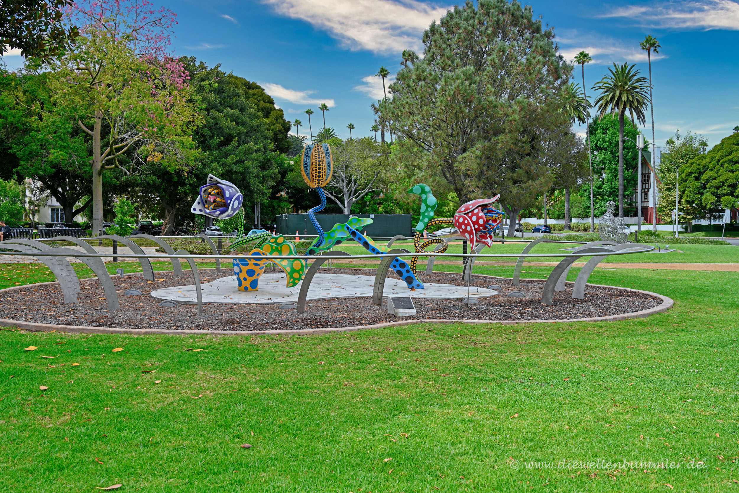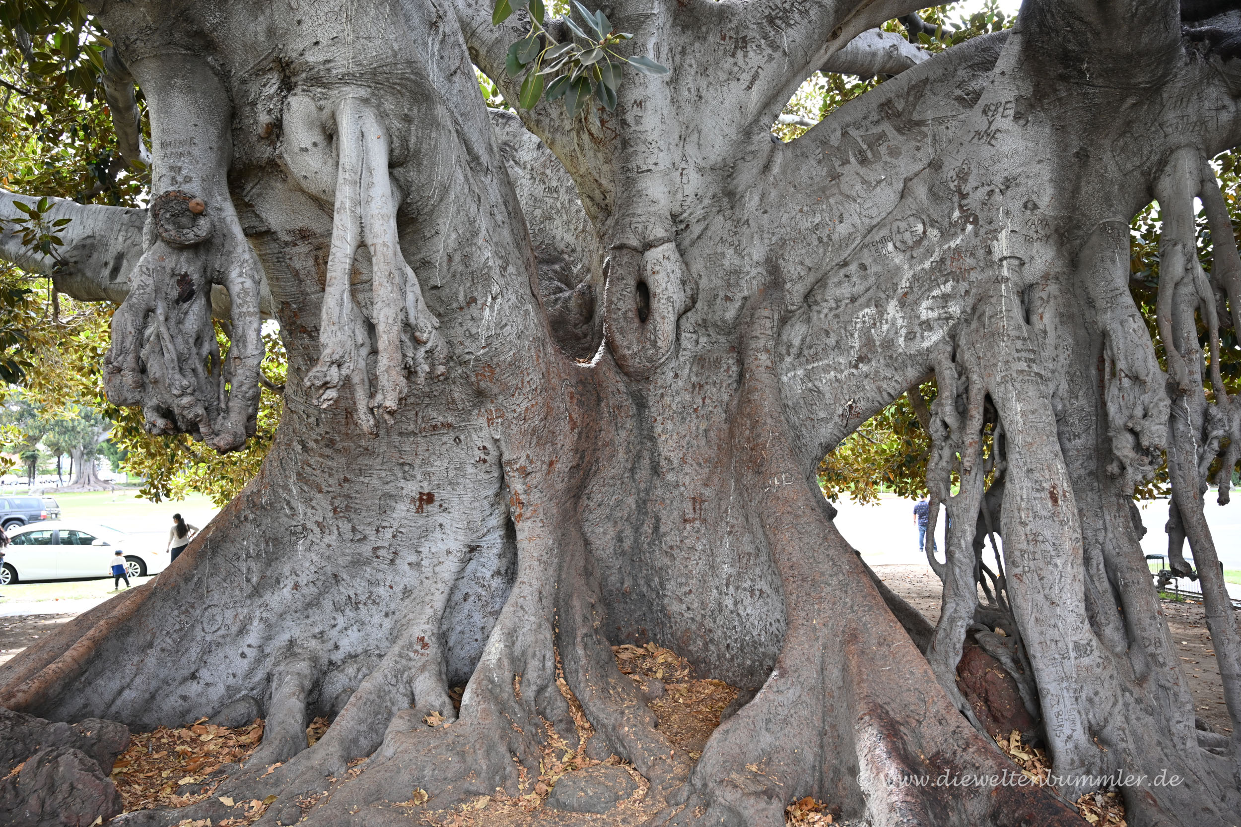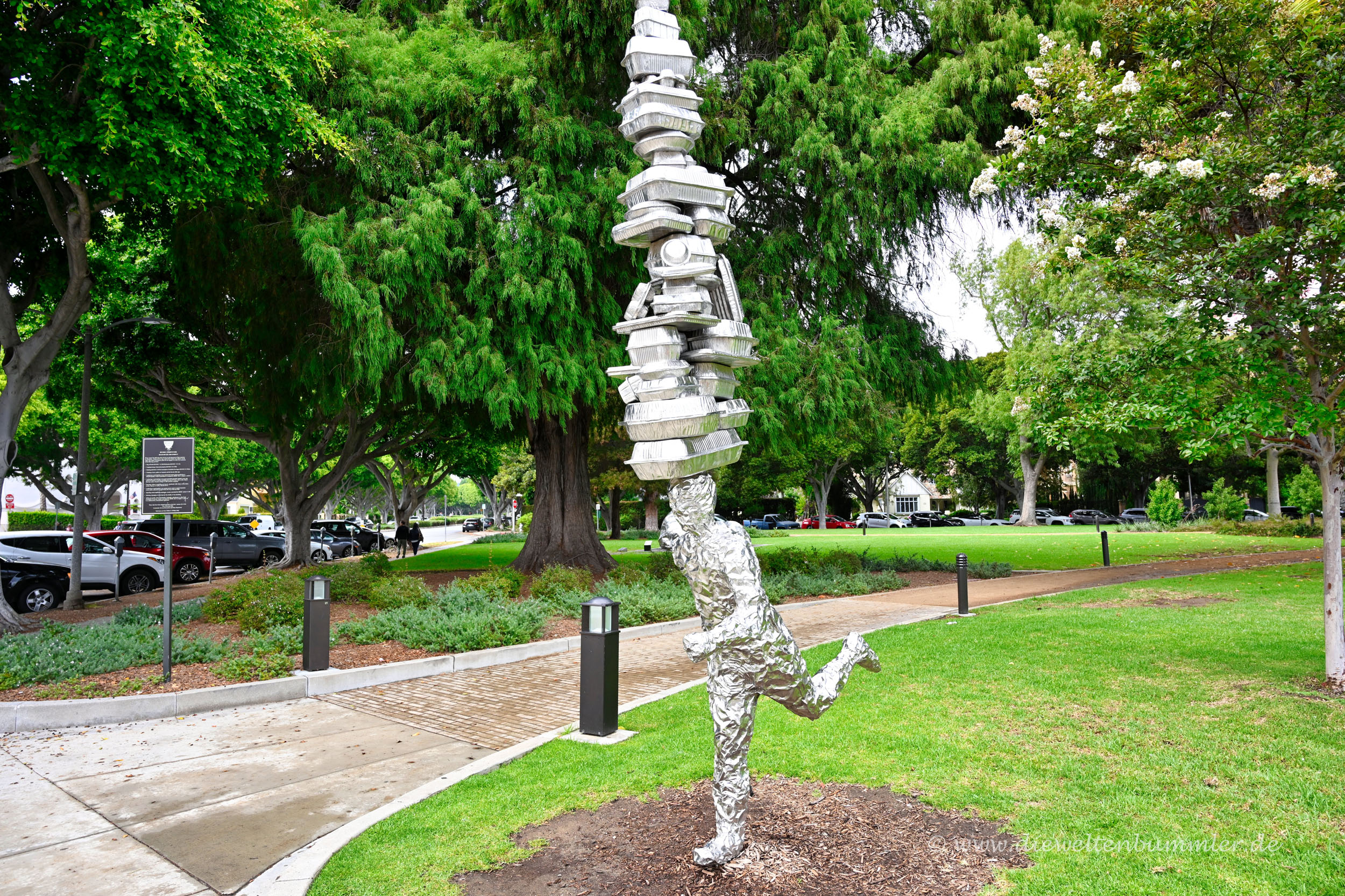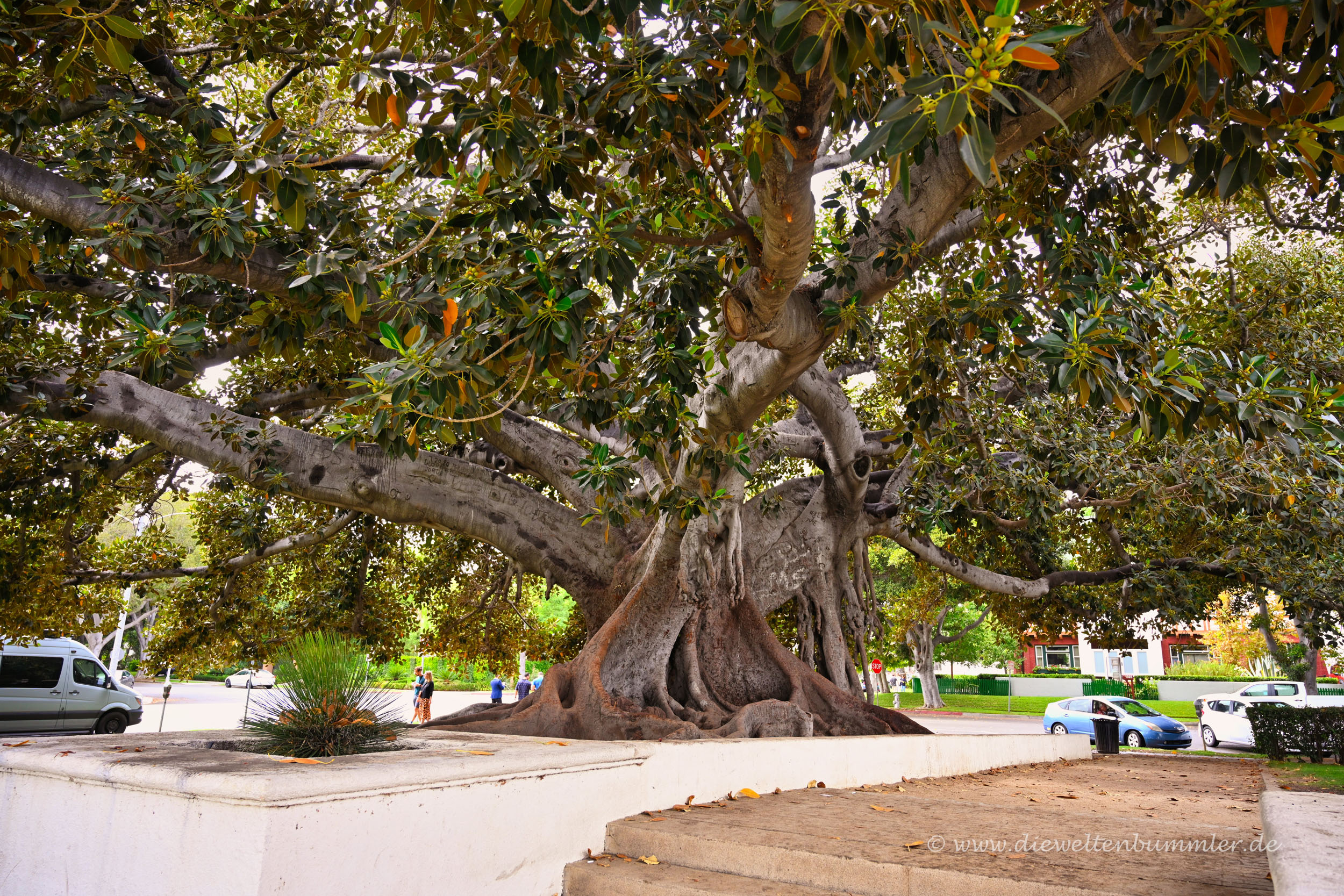 Gleichzeitig gab es in dieser Grünanlage einige Kunstobjekte und Skulpturen zu entdecken. Das war schon mal ganz nett. Doch noch mehr gefallen hat mir der imposante Baum links neben dem Beverly Hills-Schild. Dieser Feigenbaum war mit seinem Baumstamm wirklich beeindruckend. Laut Internet handele es sich wohl um die Großblättrige Feige.