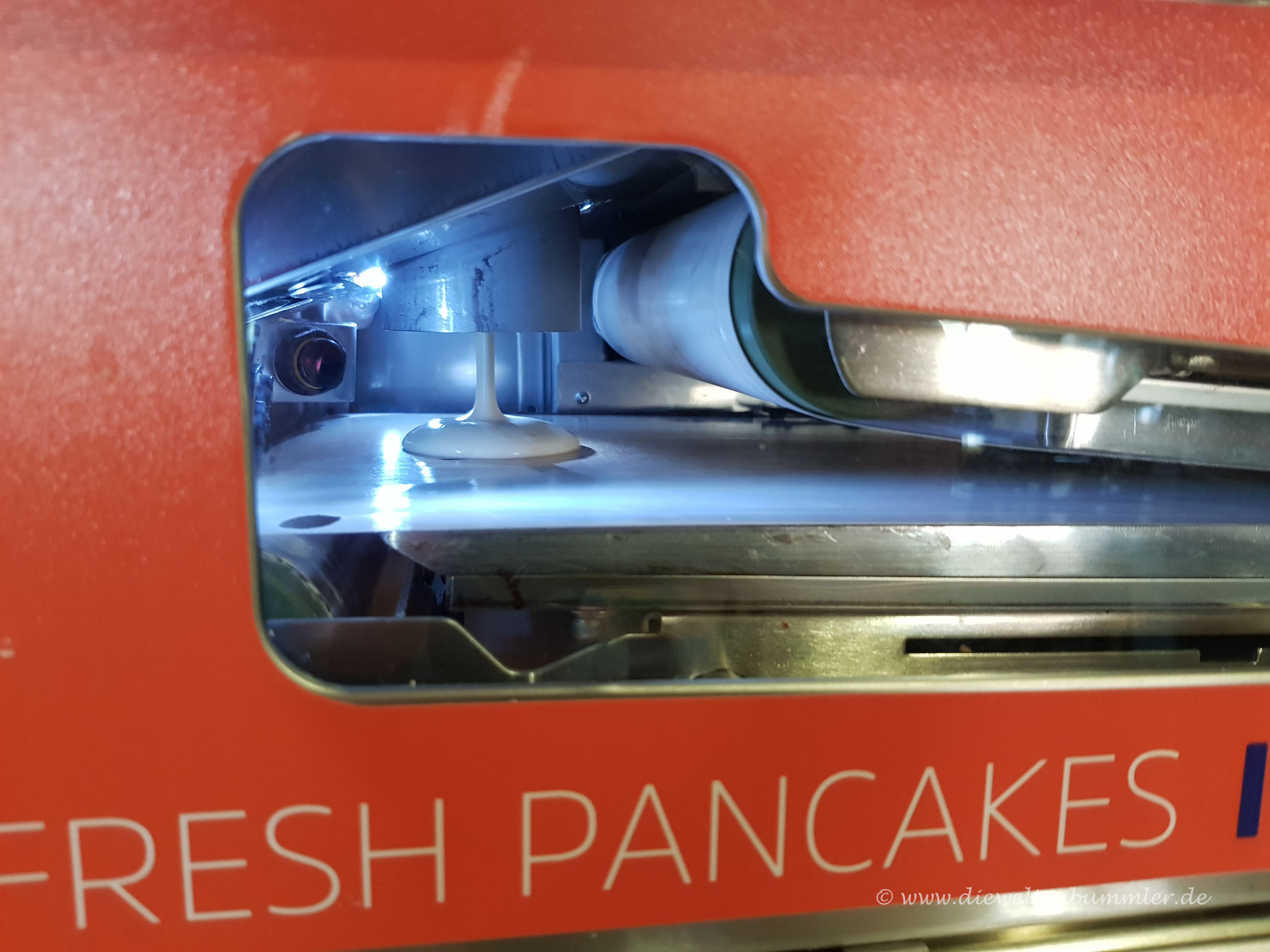 Kundenfreundlich ist das allerdings nicht. Wir hatten diesen Fall einmal, dass aus dem Automaten nur zwei sehr kleine Pancakes ausgeworfen wurden. Die waren kaum größer als holländische Poffertjes. Wir nahmen zunächst an, dass eventuell nicht mehr genug Teig im Beutel sein könnte und sprachen die Mitarbeiterin darauf an. Diese überprüfte aber den Beutelinhalt vor unseren Augen und in der Tat gab es noch genug Teig.
