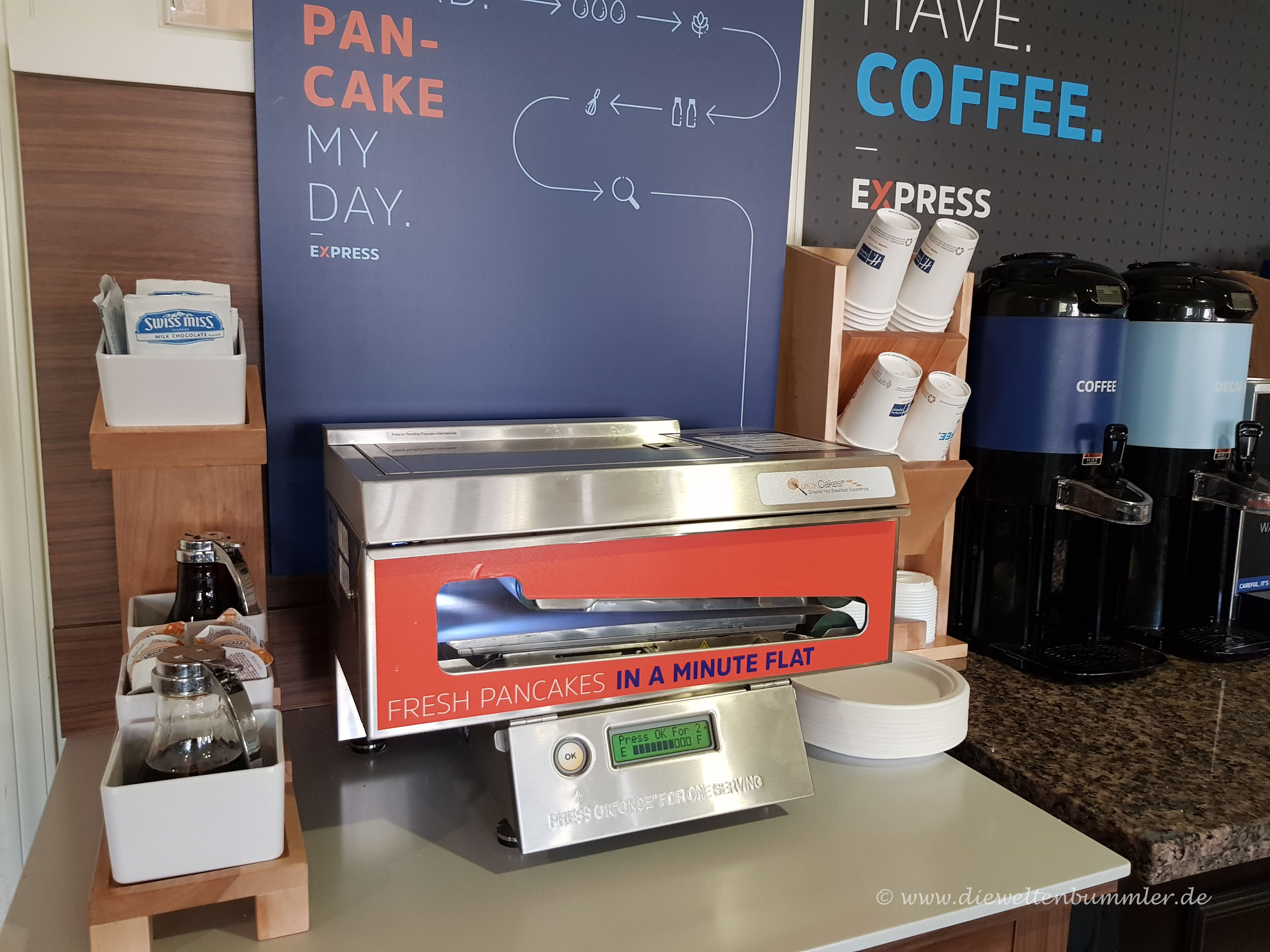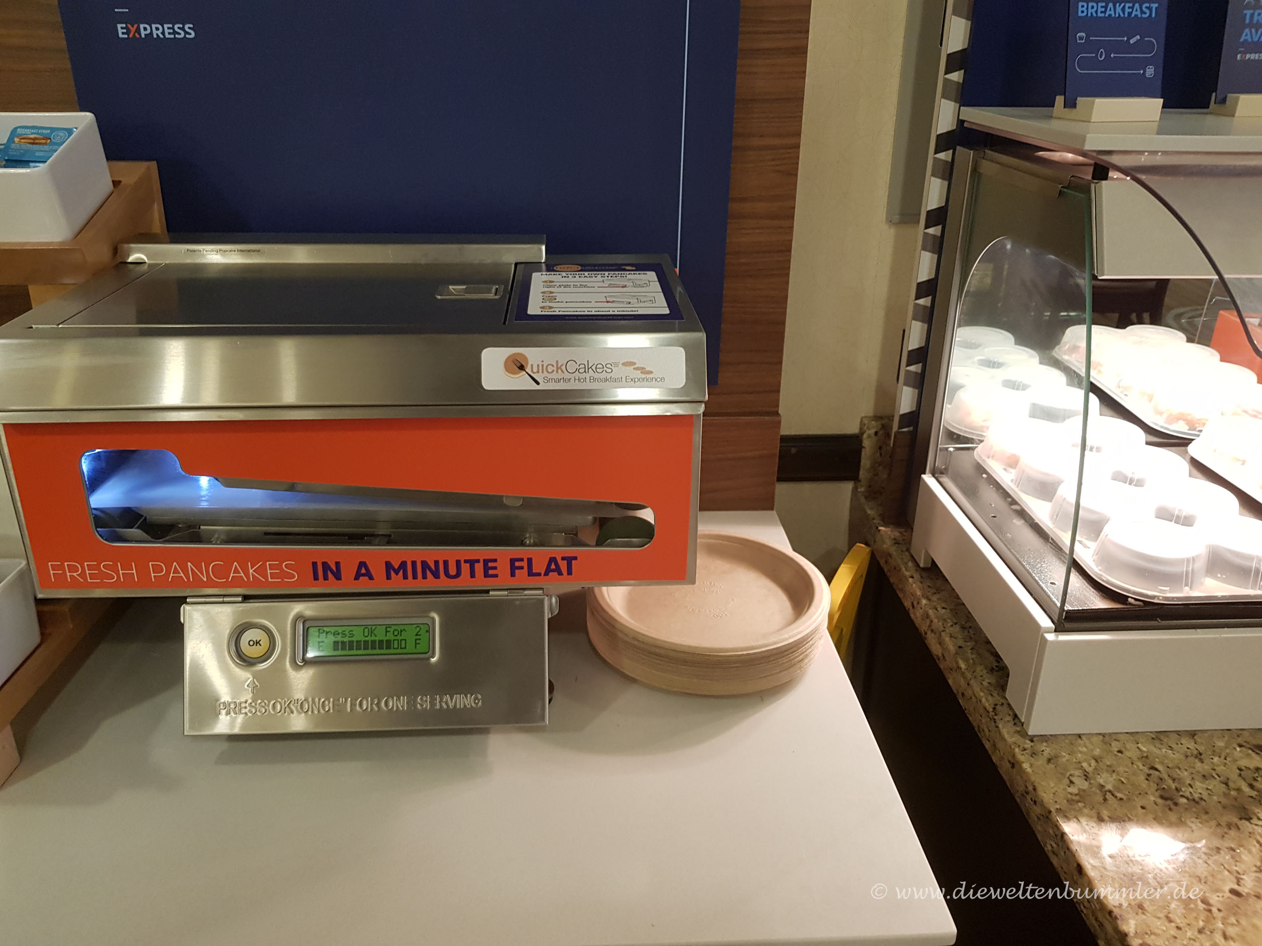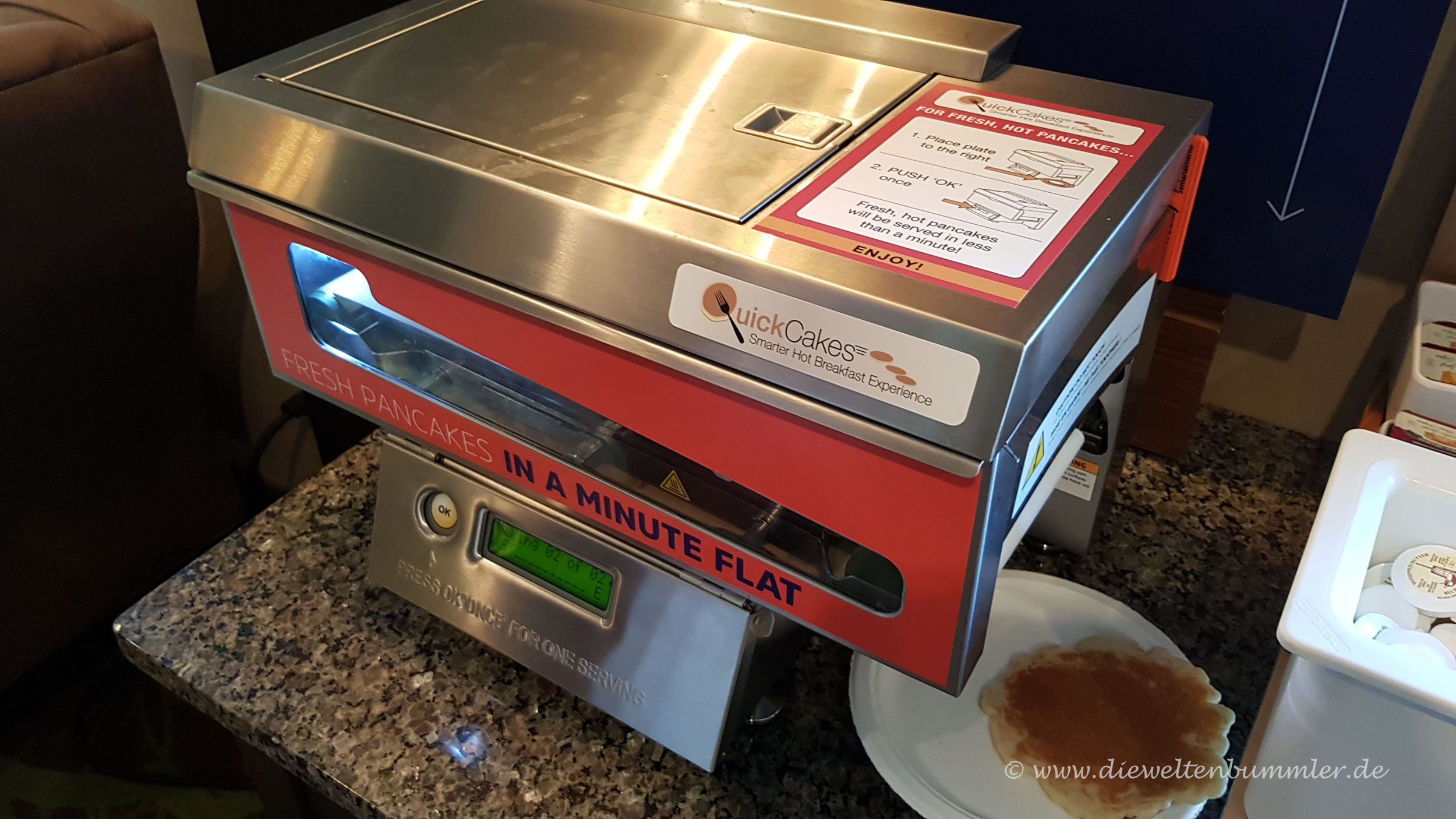 Ich esse sehr gerne süße Sachen zum Frühstück. Aber Fruit Loops mit Sirup und aufgetaute Muffins sind dann trotzdem nicht wirklich meine Favoriten hierfür. Klassiker sind in amerikanischen Hotel-Frühstücksräumen meist Waffelautomaten. Doch in einigen Fällen gibt es auch noch einen Pancake-Automaten.
