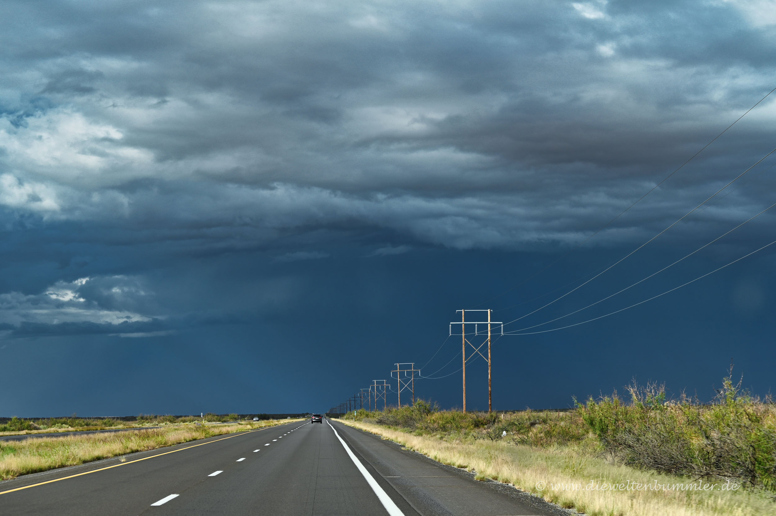 Schon auf dem Weg von Arizona, also von Westen kommend, zog sich der anfangs blaue Himmel langsam zu. Wir fuhren gemütlich auf der Interstate 10 auf Las Cruces in New Mexico zu. Dabei blickten wir auf die in einer weiten Senke liegende Stadt und auf die dahinter liegende Bergkette. Eine tolle Aussicht – normalerweise. Doch dieses Mal war der Blick teilweise durch tief hängende Wolken versperrt. Nicht nur, dass es überhaupt Wolken gab. Nein, sie hingen auch noch tief und über Teilen der Stadt entluden sie schon ihren wässrigen Inhalt. Deutlich konnten wir die Regenfelder über Las Cruces erkennen.