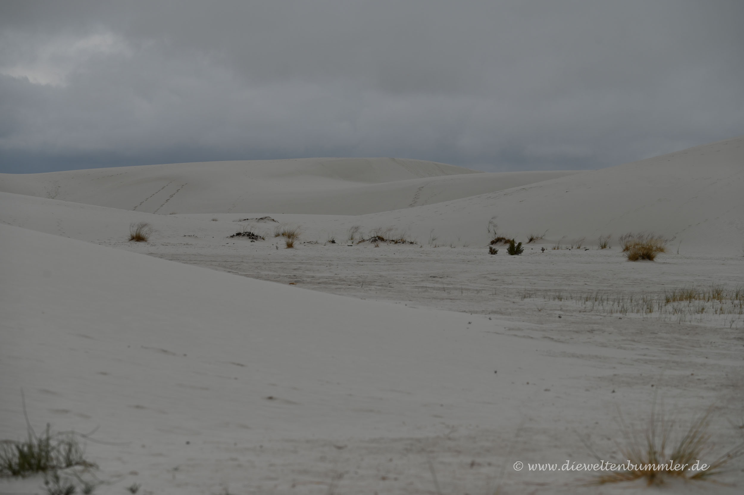 Eines der ungewöhnlichsten Phänomene in der Chihuahua-Wüste ist die darin befindliche Wüste White Sands. Wir kannten sie schon und zwar als wunderschöne weiße Landschaft aus Gipssand unter strahlend blauem Himmel. Und da wir später zur Trinity Test Site auf der White Sands Missile Range wollten, planten wir einen weiteren Besuch des White Sands Nationalparks. Wir ahnten nicht, wie unterschiedlich die Landschaft wirken kann, wenn es aus tiefdunklen Wolken regnet.