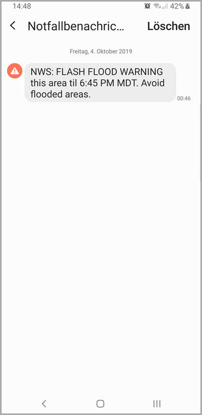 Das kannte ich noch nicht. Das war neu. Eine SMS erschien auf dem Bildschirm und zwar mit der Warnung vor einer Sturzflut. Jetzt hatten wir es auch noch amtlich. Sturzfluten sind nicht ungefährlich. Besonders in Wüstenregionen fällt irgendwo weit entfernt Regen in Massen, kann nicht versickern und fließt im rasanten Tempo durch ein ausgetrocknetes Flussbett. Schlecht, wenn man dann dort gerade sein Zelt aufgeschlagen hat oder entlang wandert. Insofern: Ertrinken in der Wüste ist möglich.