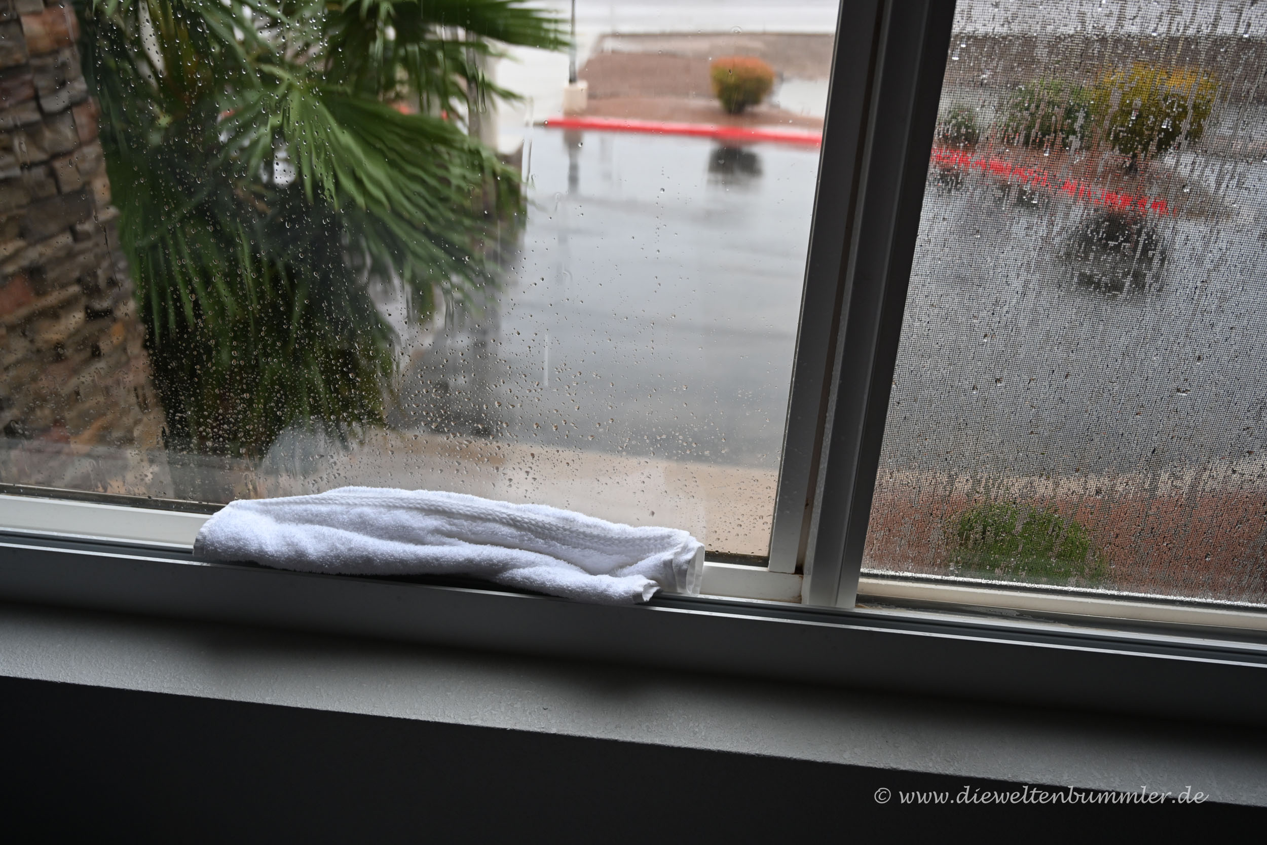 Wasser tropfte durch den Fensterrahmen in unser Hotelzimmer und zwar nicht zu knapp. Wir stoppten den Wasserlauf mit einem Handtuch und hielten für uns fest, dass die Häuser in der Region vermutlich nicht für Regen gebaut wurden. Das bestätigte sich auch, als wir einen abendlichen Einkauf im örtlichen Walmart durchführten. In einigen Gängen standen dort zahlreiche Eimer, scheinbar wahllos verteilt. Aber so wahllos war das gar nicht. Die Eimer dienten dazu, das Wasser aufzufangen, dass durch das Dach des Supermarktes tropfte. Irgendwie erstaunlich, die gesamte Halle – und aus mehr besteht so ein Supermarkt in Walmart-Größe ja eigentlich nicht – war undicht.