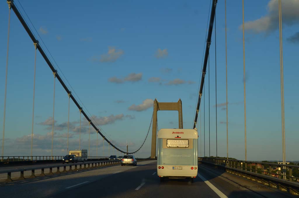 Also wird der Rest der Packerei, der noch übrig war, auf heute Morgen verschoben. Und auch einige private Mails, die schon länger auf Antwort warten mussten, sind noch am Morgen dran. So kommt es, dass wir erst gegen 13 Uhr aufbrechen. Viel später als wir es sonst gewohnt sind. Vollgepackt und gut gelaunt geht es auf die Autobahn 40, auf die Autobahn 43 und schon bald lassen wir das Ruhrgebiet hinter uns. Es folgt das Münsterland, Osnabrück und eine sich ewig ziehende Autobahn 1 bis Bremen.