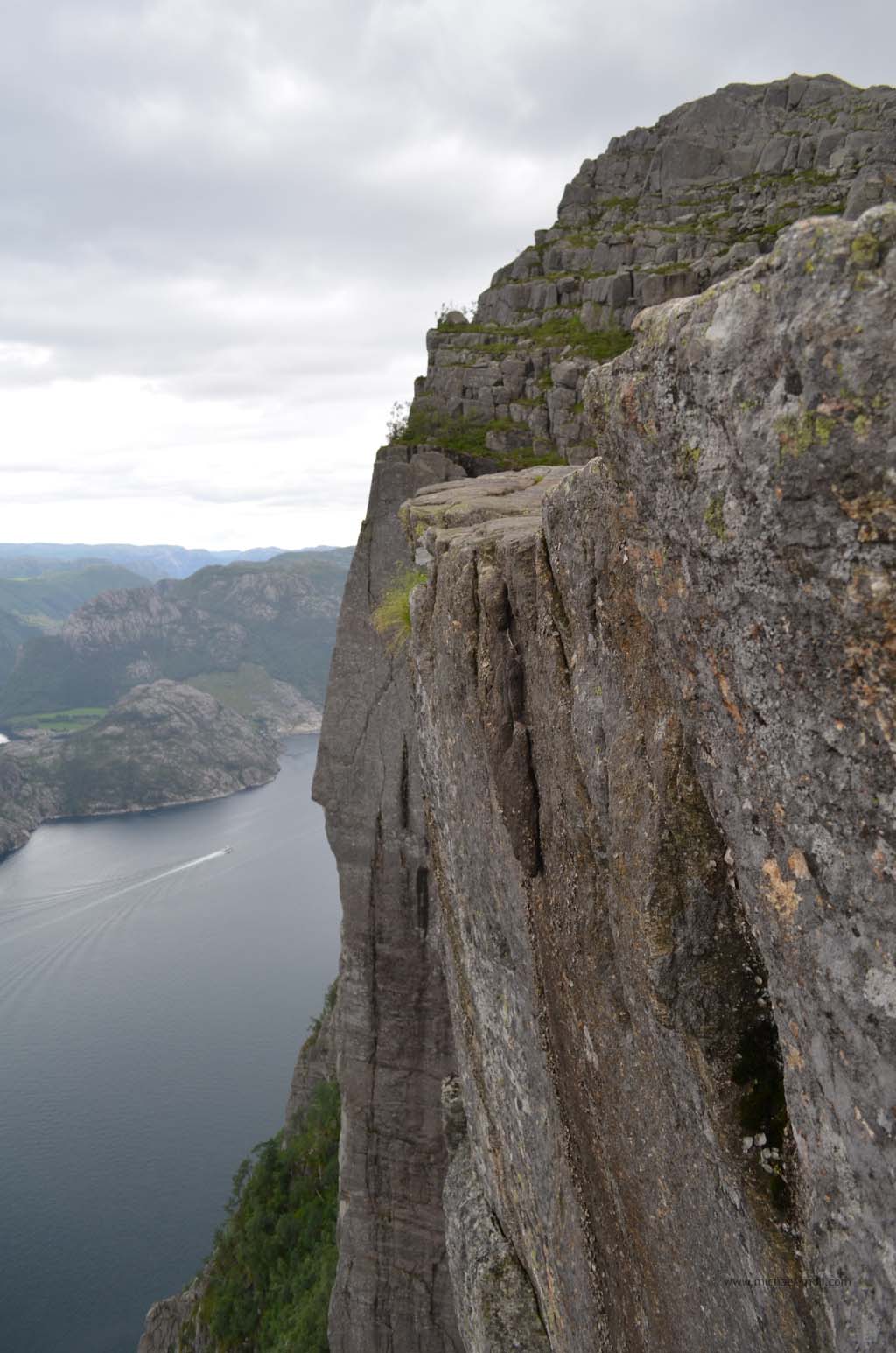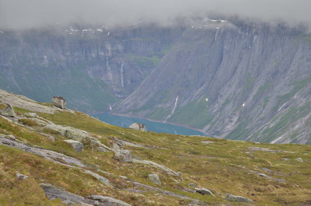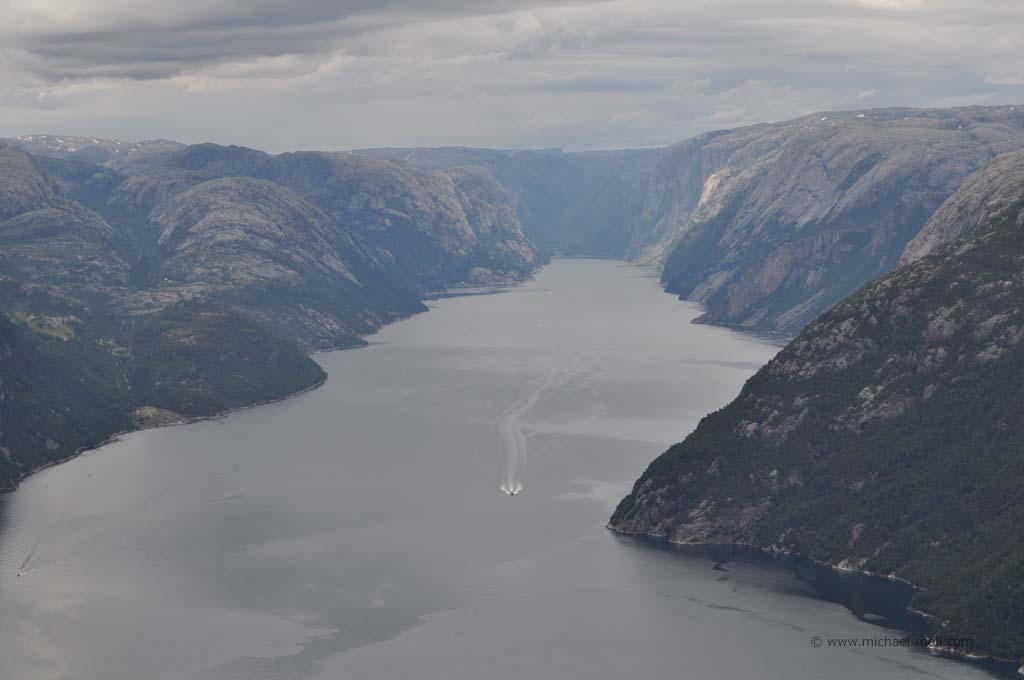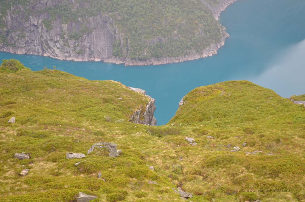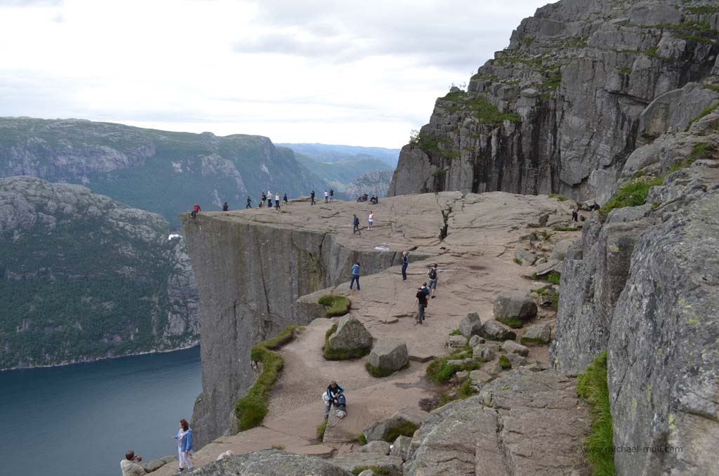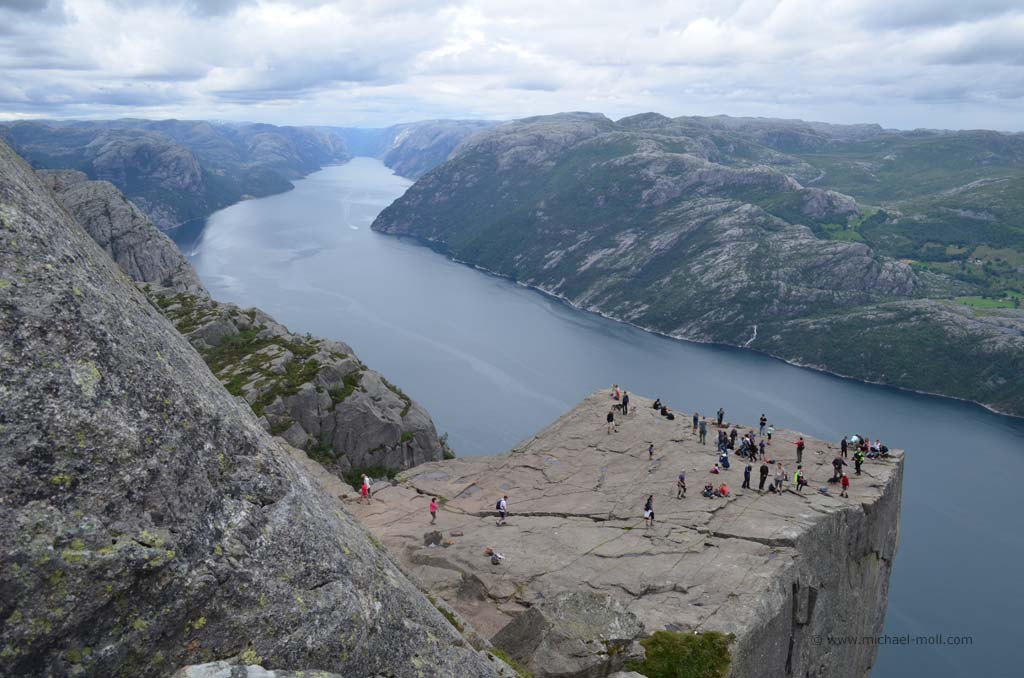 Ansonsten wurden wir aber vielfach auch überholt. Und zwar in einem Tempo als gäbe es am Ziel etwas umsonst. Man muss wissen, dass der Kjeragbolten ein kleiner Felsbrocken ist, der sich zwischen zwei hohen Felswänden verkeilt hat. Unter dem Kjeragbolten geht es 1.000 Meter in die Tiefe und man blickt auf den Lysefjord. Ein beliebtes Fotomotiv ist es daher, sich auf den Felsen zu stellen, was ich bei letzten Reise auch tat. Heute hatte ich weniger Lust dazu – ganz einfach, weil es schlicht zu voll war.
