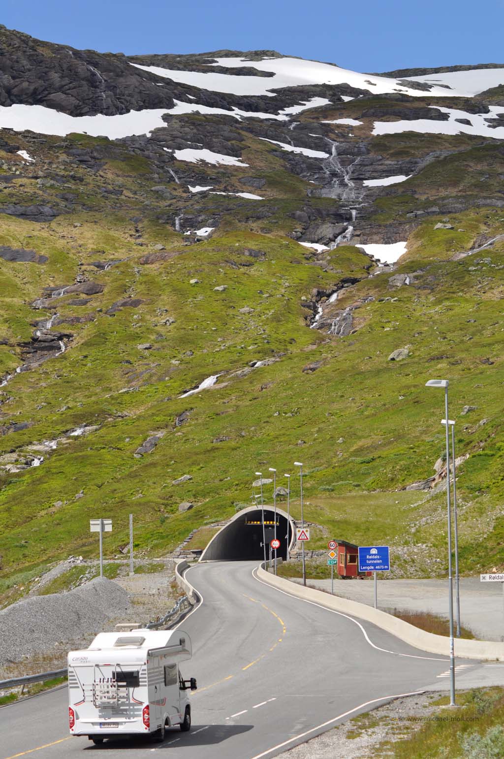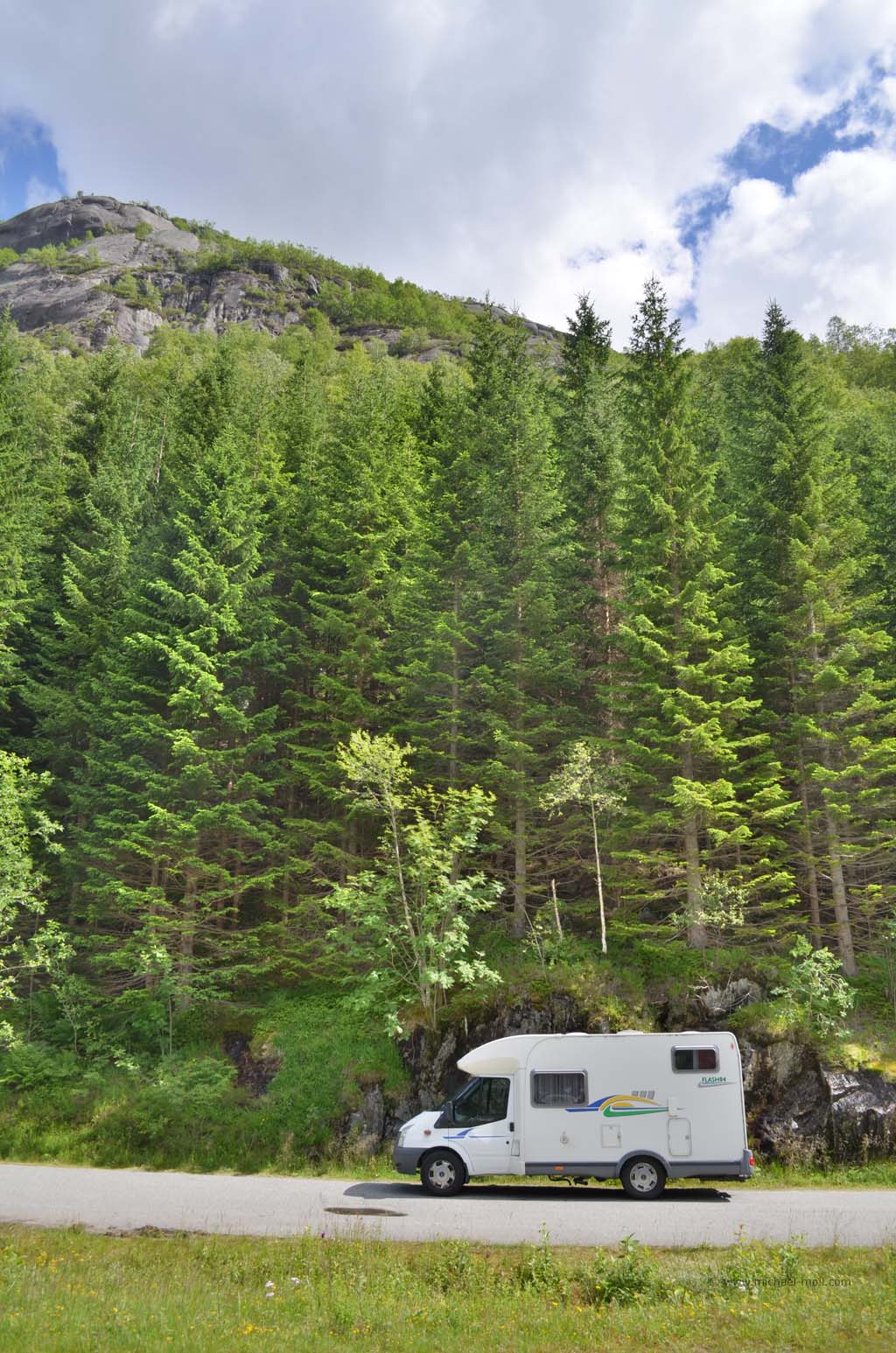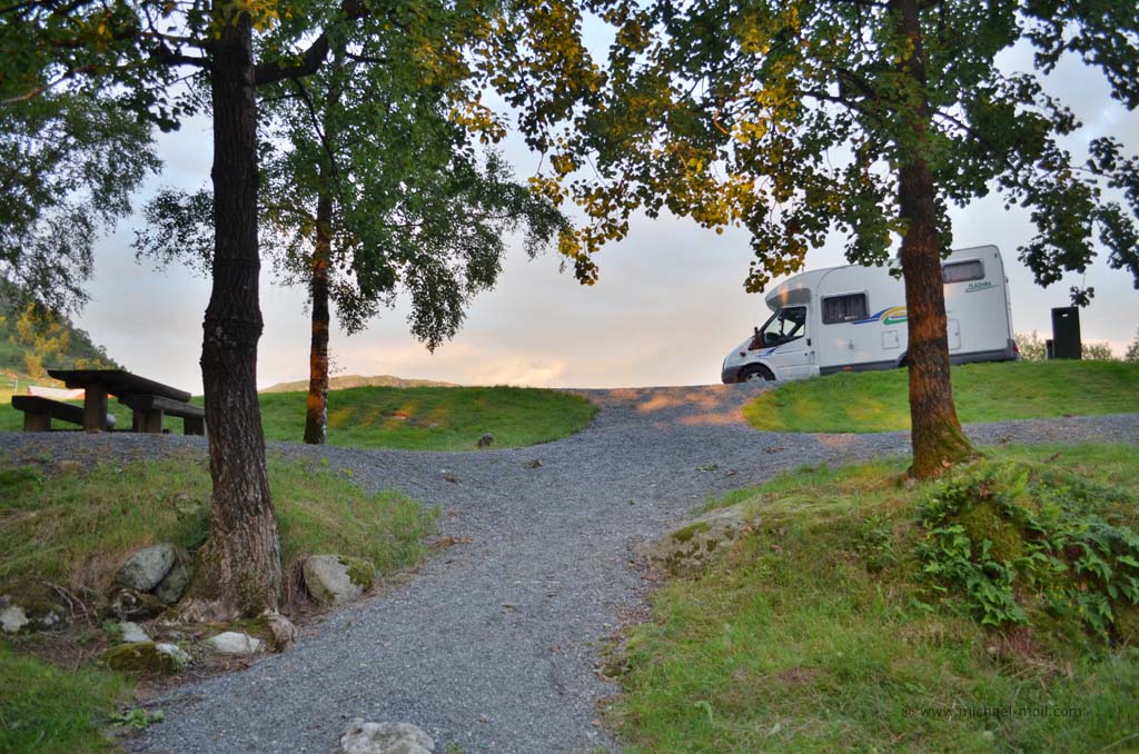 Wir tranken etwas, stärkten uns und machten uns auf den weiteren Weg mit dem Auto. Es ist ja noch lange hell und so können wir noch eine Zeit lang fahren. Auf der schönen Straße, auf der wir gekommen sind, fahren wir lange Zeit zurück, biegen rechts ab und fahren durch wunderbare Landschaften bis zum erstbesten Campingplatz. Für 200 Kronen bekamen wir einen ruhigen Rasenplatz, eine heiße Dusche und konnten unseren Wasservorrat auffüllen bzw. unser Abwasser entsorgen.