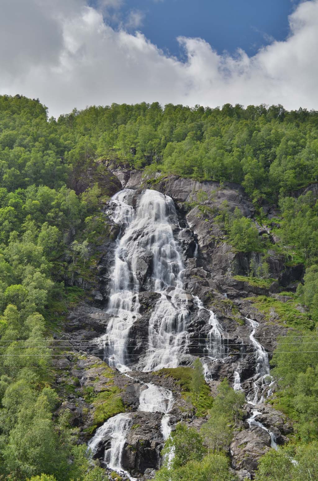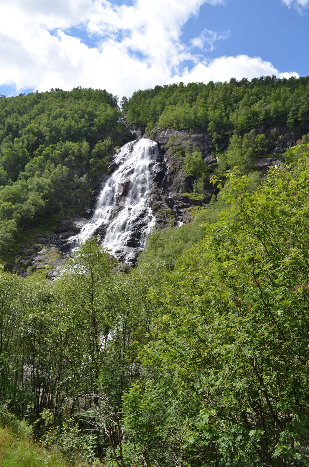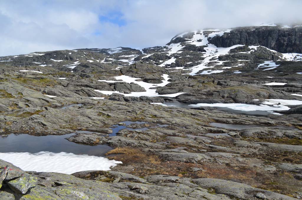 Der tosende Wasserfall rauscht nicht nur die ganze Nacht in unseren Ohren, sondern auch noch lange dem Aufstehen, obwohl wir schon zu Fuß auf dem Weg zu unserer ersten Wanderung sind. Wir lassen den Wagen auf dem Schotterparkplatz stehen und gehen die 300 Höhenmeter auf der kurvigen Serpentinenstraße hinauf bis zum Restaurant und zum dort kostenpflichtigen Parkplatz. Er kostet 100 Kronen, also umgerechnet rund 13 Euro. Die sparen wir uns, und nicht nur die. Denn es wird angedroht, dass es das Dreifache kosten wird, wenn man kein Ticket zieht. Nun, das könnten wir auch gar nicht, denn wir haben weder Münzen noch überhaupt norwegische Kronen bei uns. Und einen Bankautomaten gibt es dort nicht. Eben nur ein Restaurant und Toiletten. An letzteren gehen wir vorbei und beginnen den Aufstieg zum Kjeragbolten. Der Kjerag ist ein Hochplateau am südlichen Rand des Lysefjords.