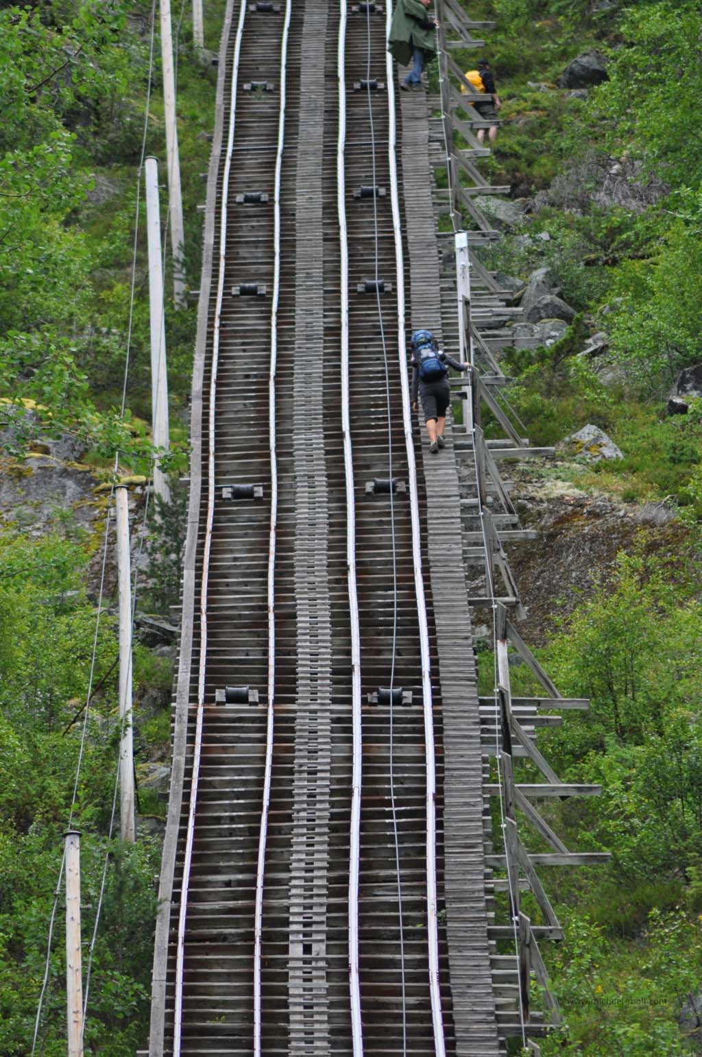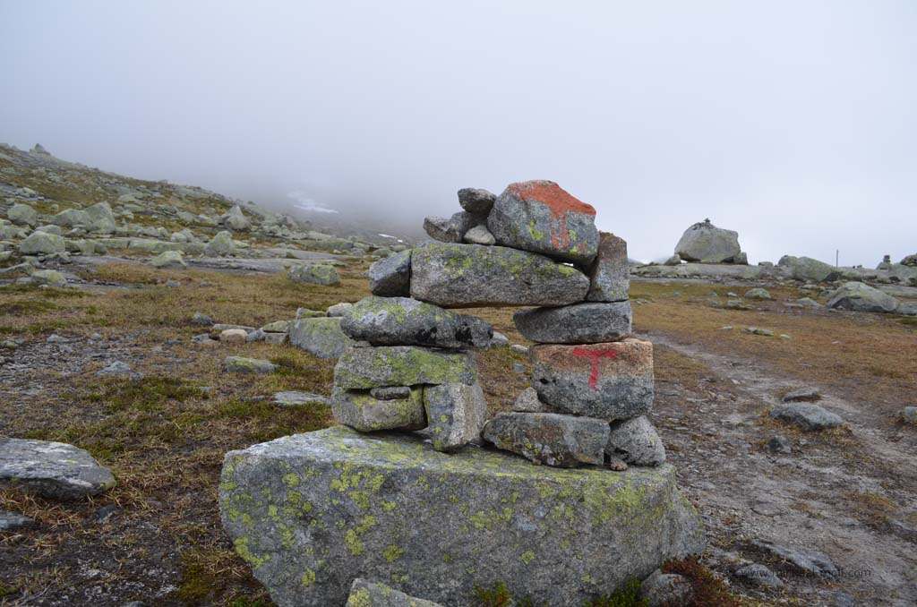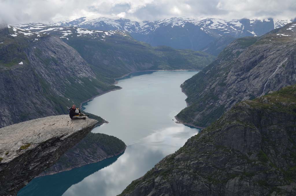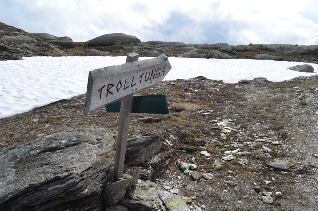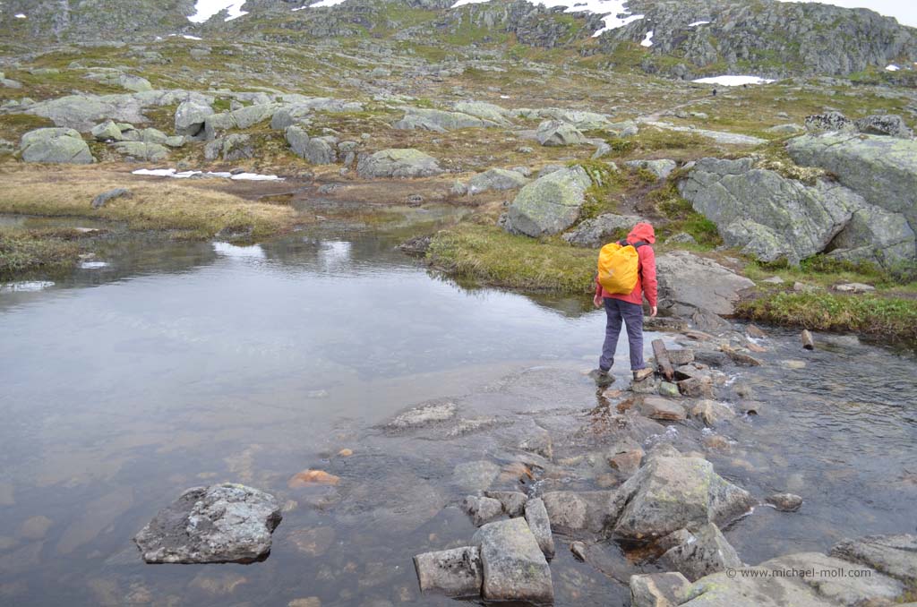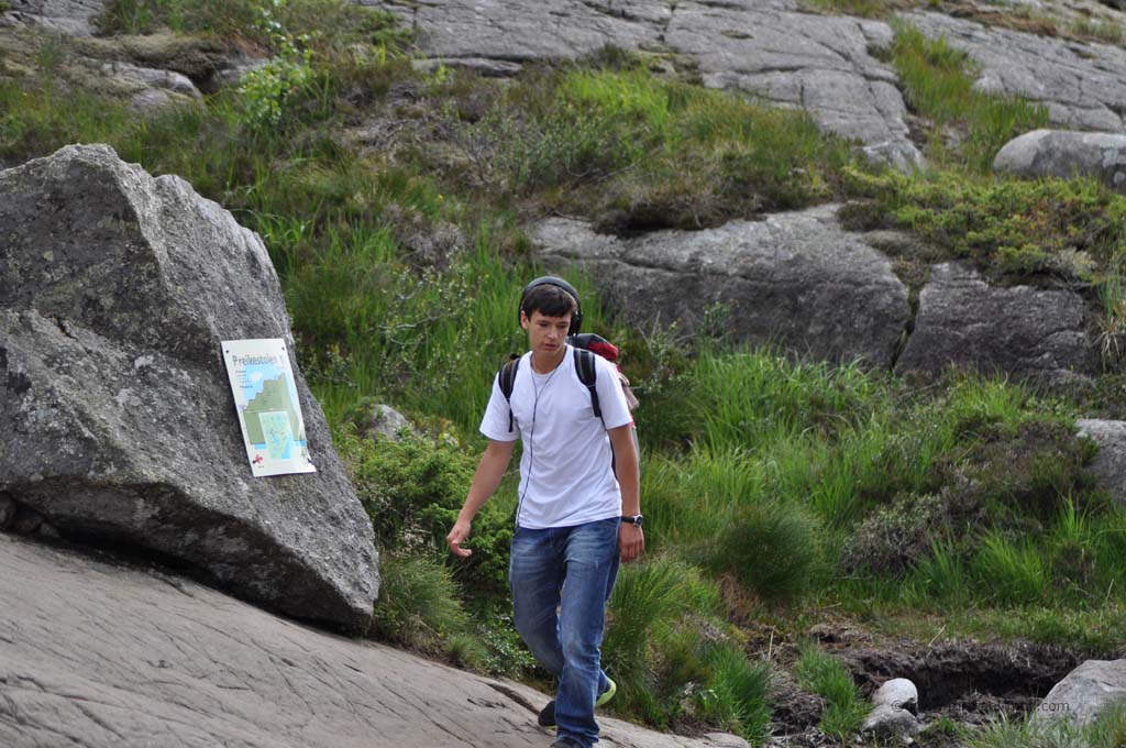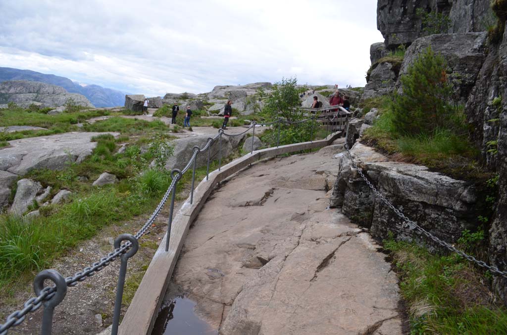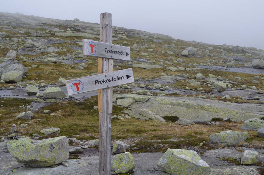 Ich habe den Weg zwar schon auf molls-reiseblog.de erähnt. Aber hier kann es auch nicht schaden. Der Weg besteht aus drei Anstiegen. Der erste Anstieg geht steil aber relativ kurz hinauf. Anschließend wandert man in eine Senke hinab, um den zweiten Anstieg in Angriff zu nehmen. Zu guter Letzt überquert man nach einem weiteren kurzen Abstieg einen Bach und steigt ein letztes Mal hinauf. An allen Aufstiegen und Abstiegen befinden sich auch in das Massiv verankerte Ketten, die dem Wanderer Sicherheit geben. Und nicht selten muss man auch die Hände zum Klettern nutzen oder sich auf den Hosenboden setzen, um ein paar Höhenmeter zu verlieren. Nach dem dritten Aufstieg hat man das Hochplateau erreicht, wo man beinahe eben über das imposante, steinerne Massiv wandert und zum Schluss den Kjeragbolten erreicht. Auf dem Weg dorthin ist die grobe Richtung mit einem roten T markiert und ein Verlaufen ist kaum möglich. Aber man kann auf einer ziemlich breiten Fläche wandern, so dass man auch schon mal 50 oder 100 Meter parallel zur Markierung läuft. So ist es uns ergangen und witzigerweise allen Wanderern, die hinter uns herliefen. Als wir den Fehler bemerkten und uns wieder zur Beschilderung begaben, vollzogen wir dabei beinahe eine 90°-Kurve, um kurz darauf wieder in die ursprüngliche Richtung einzuschwenken. Man stelle es sich so vor, als würden wir auf der Seitenlinie eines Fußballfeldes wandern und an der Mittellinie über den Anstoßpunkt die Seite wechseln. Brav wie die Lemminge sind uns die Wanderer auf diesem gezackten Weg gefolgt – niedlich.