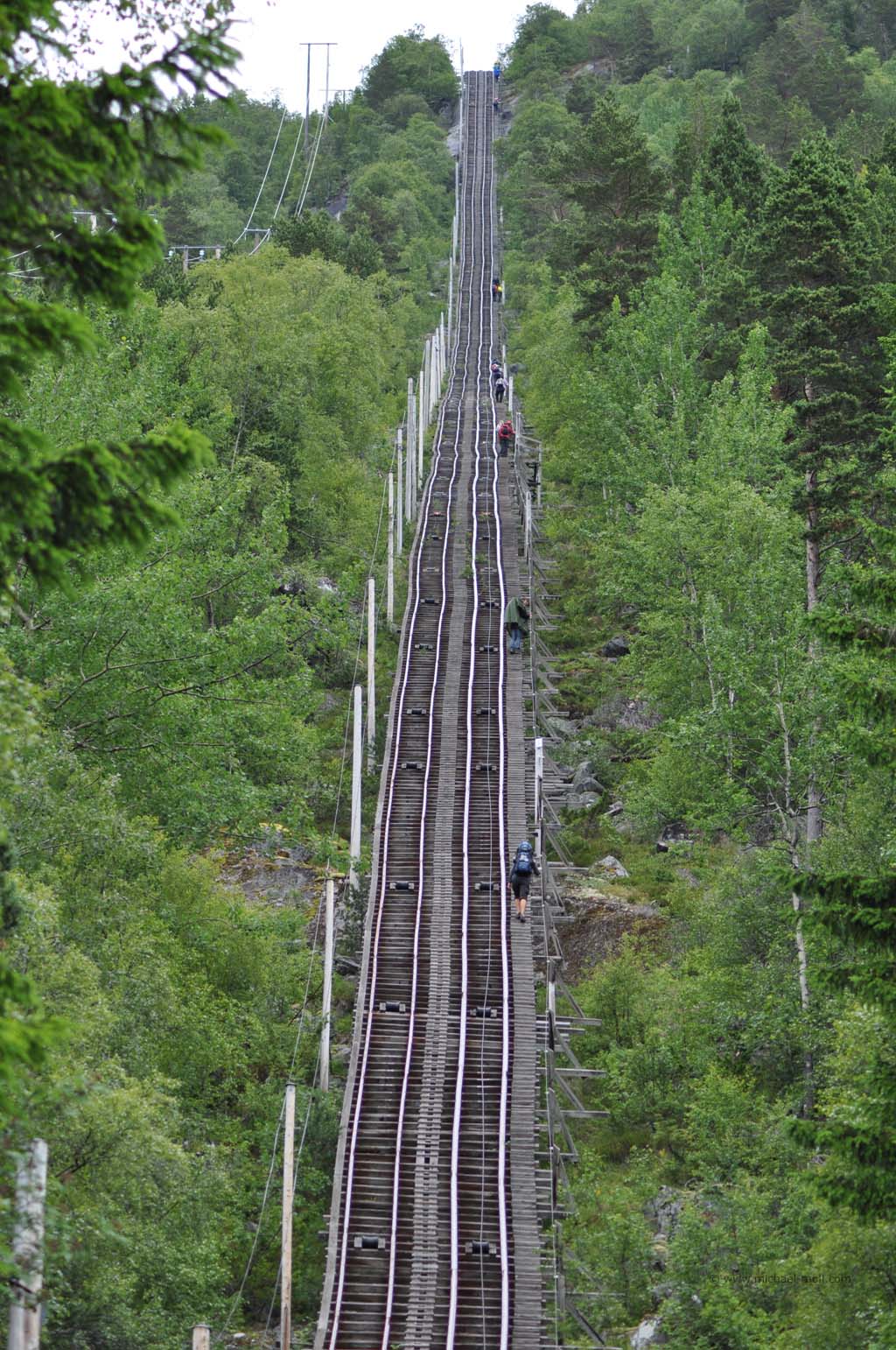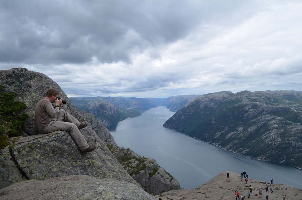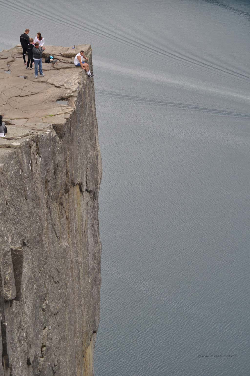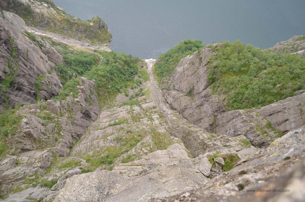 Seit tausenden von Jahren klemmt dieser Fels zwischen den Wänden aber alle rannten auf ihn zu als würde er in den nächsten 20 Minuten hinab stürzen. Um ehrlich zu sein, hat mich diese Hetzerei und auch Drängelei ein wenig genervt. Wer sich in Norwegen Einsamkeit erhofft, ist hier definitiv falsch. Außerdem sollte man gar nicht näher auf das blicken, was die Ausflügler an ihren Schuhen tragen. Obwohl am Einstieg in drei Sprachen ausdrücklich darauf hingewiesen wird, festes Schuhwerk zu tragen, scheint es nur die wenigstens zu interessieren. Die überwiegend jungen Leute im Alter um die 20 Jahre scheinen den Weg als sportliches Highlight des Jahres wahr zu nehmen. Zum einen kann es ihnen nicht schnell genug gehen, zum anderen sind das Beste noch Turnschuhe mit festem Profil gewesen. Einfache Stoffschuhe, Sandalen und sogar Stöckelschuhe konnten wir sehen und es war auch nur eine Frage der Zeit, bis der Rettungshubschrauber über unseren Köpfen kreiste. Eine Touristin hat es erwischt und sich den Fuß oder Knöchel verletzt. War es die Hetze, war es das falsche Schuhwerk? Wir wissen es nicht, auf jeden Fall konnten wir es aus nächster Nähe der Rettung aus der Luft beiwohnen. Doch mein Mitleid galt eher den Piloten und Sanitätern, die vermutlich jeden Tag hier hin ausrücken müssen, weil zahlreiche leichtsinnige Möchtegern-Wanderer unterwegs sind.