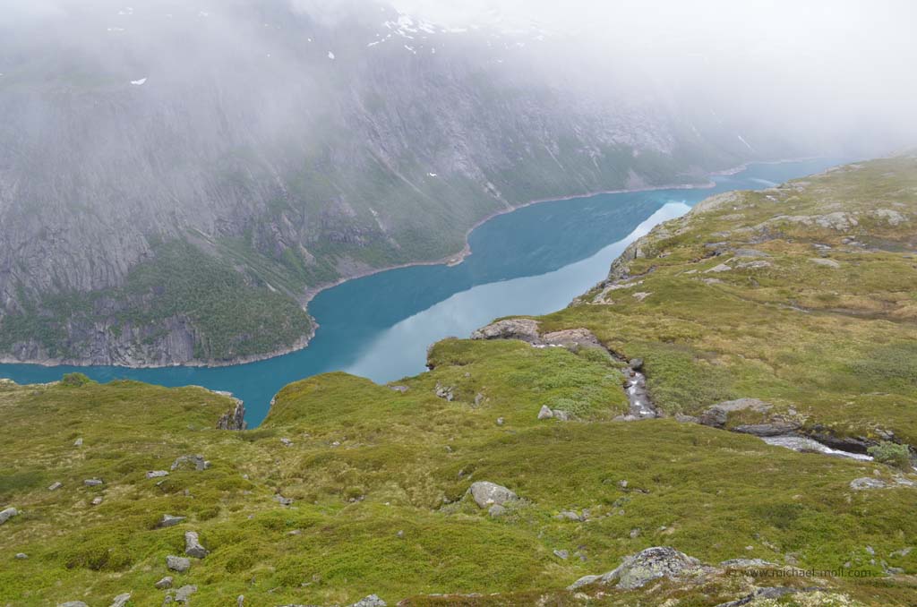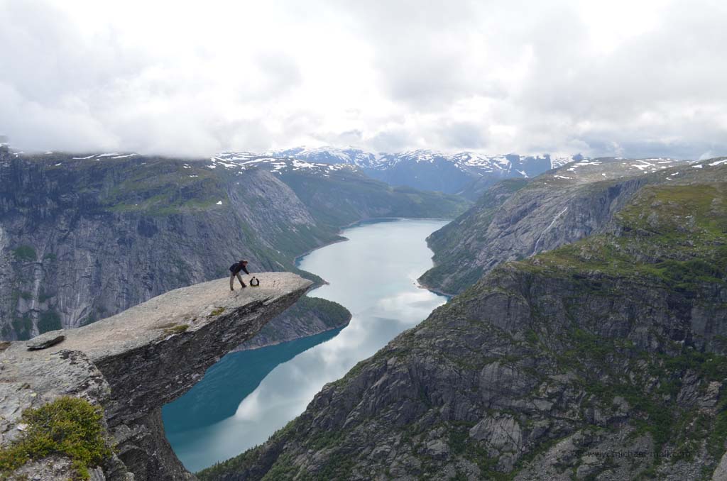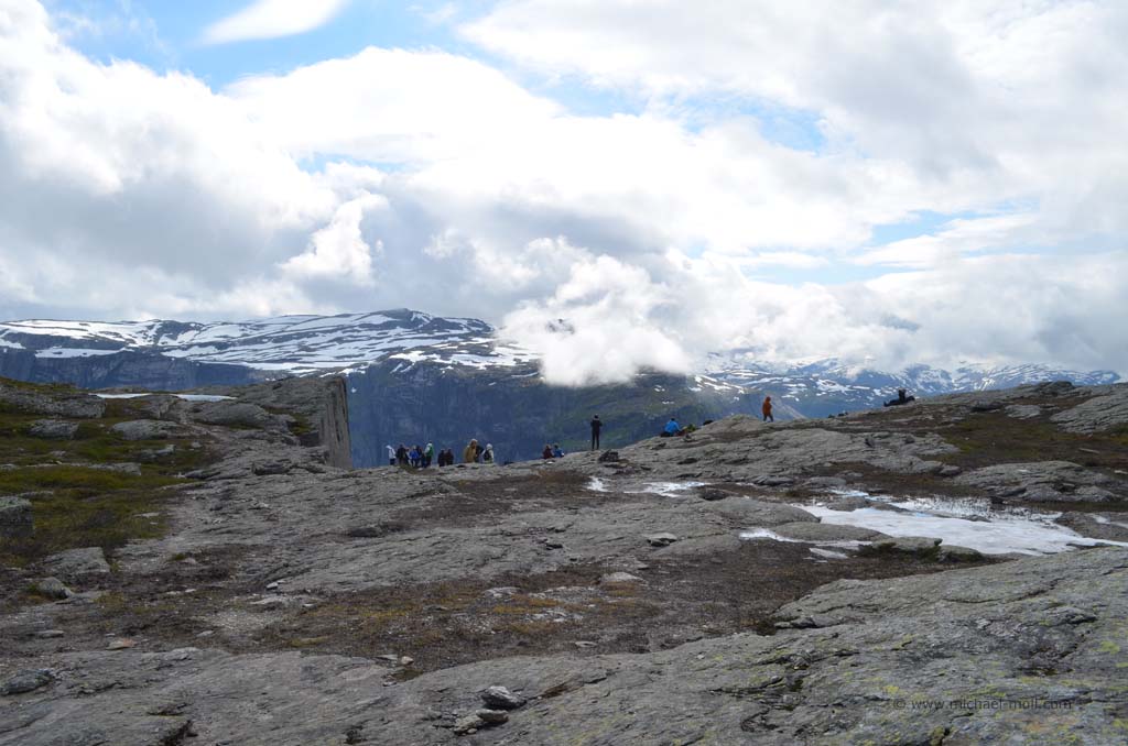 Und am Kjeragbolten selbst war natürlich das Gedränge ganz besonders groß. Jeder wollte mal auf dem Stein stehen und wenn man sich auf den Felsvorsprüngen etwas weiter oberhalb dem Kjeragbolten näherte, erhielt die eigentlich ruhige norwegische Weite den Charakter eines Freibads. Das Stimmengewirr wurde zu einem Gröhlen, Schreien und Gekreische und spätestens jetzt wussten wir, dass wir beim nächsten Mal wieder entweder deutlich früher oder deutlich später unterwegs sein würden.