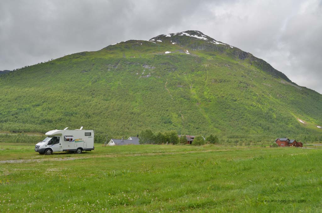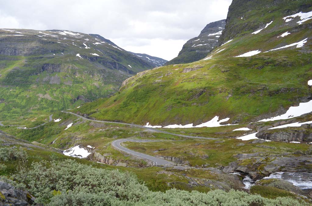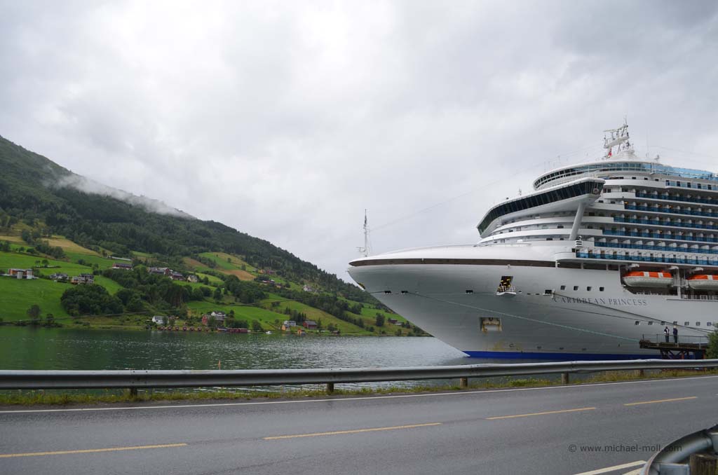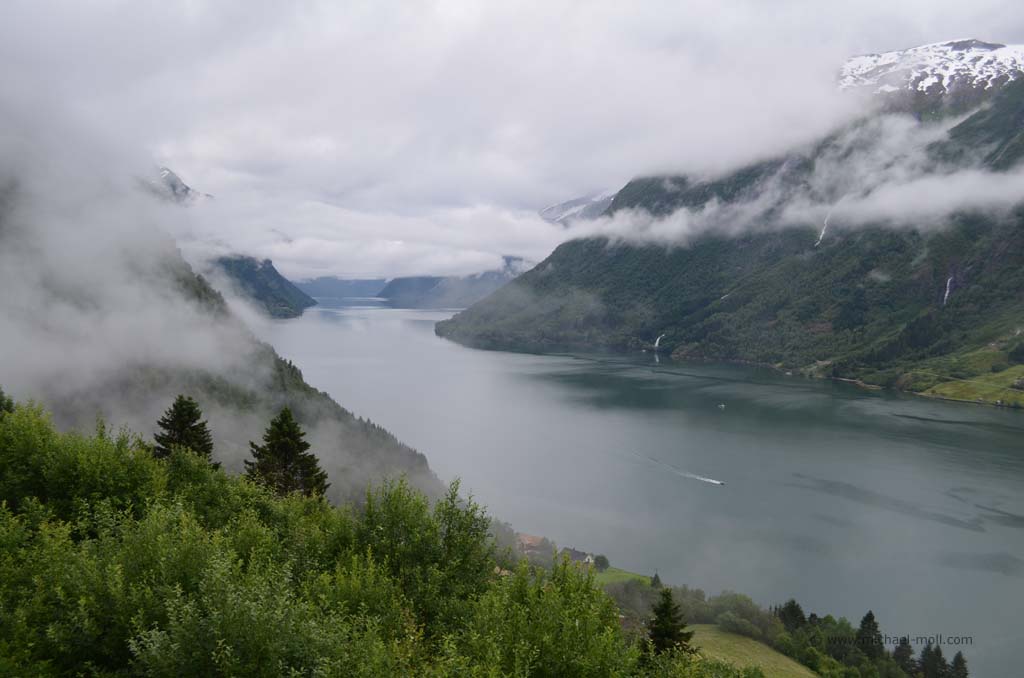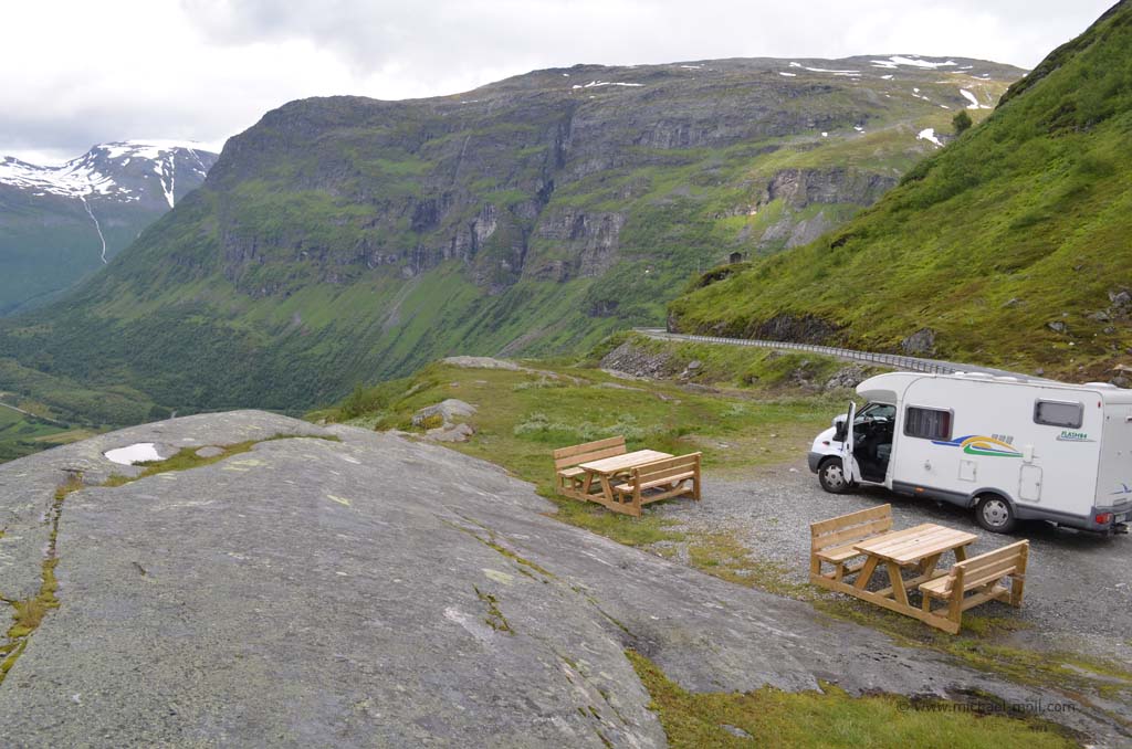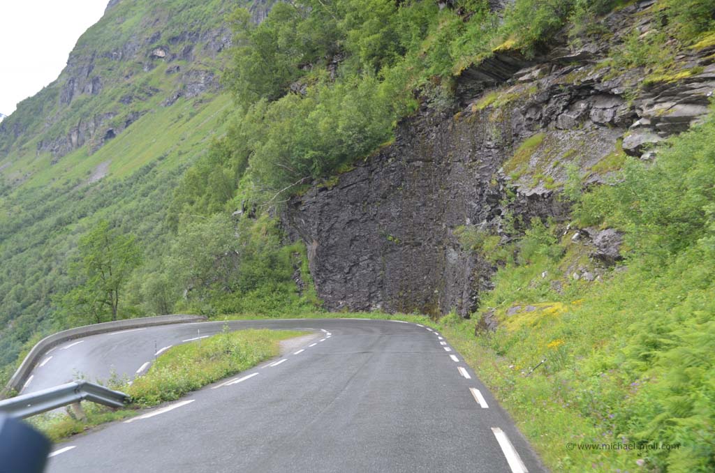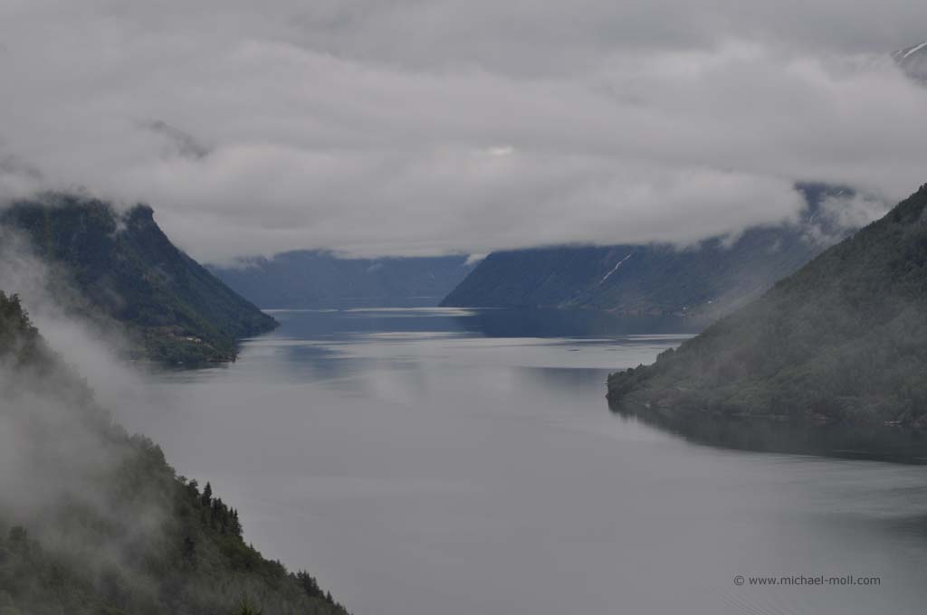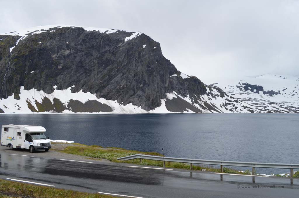 Der Wasserfall war deutlich ruhiger als am Kjeragmassiv und so schliefen wir in Ruhe aus, frühstückten gemütlich und machten uns auf den weiteren Weg gen Norden. Schon nach kurzer Zeit hörten wir unser Navi ganz neue Töne sagen: „An Bord fahren“ und „Fähre verlassen“. Warum sie das nicht schon gestern sagte, wissen wir nicht, aber heute tat sie es und wir taten wie befohlen. Ganz in Ruhe fuhren wir auf der Straße 13 und auf der Straße 600 an Fjorden vorbei, über Höhenzüge, durch enge Haarnadelkurven und hielten immer wieder an, um Aussichten zu genießen und Fotos zu machen. An einem Wasserfall, den wir allerdings schon kannten, war es jedoch so voll, dass ein Parken nicht mehr möglich war. Aber nicht schlimm, wir fuhren weiter nach Odda, parkten neben einigen anderen Wohnmobilen am Ufer eines Fjordes und schlenderten gemütlich durch die Ortschaft. Zum ersten Mal seit unserer Frachtschiffreise über den Atlantik aßen wir heute wieder Fisch, die Fischstäbchen in letzter Zeit mal ausgenommen. Da wir für den morgigen Tag schon wieder eine Wanderung vorhatten, genossen wir den Nachmittag und Abend mit Lesen, Ausruhen und einfach nur mal in der Sonne sitzen.