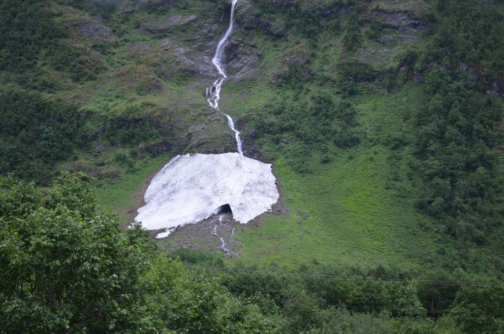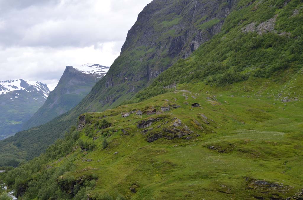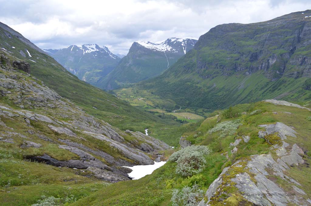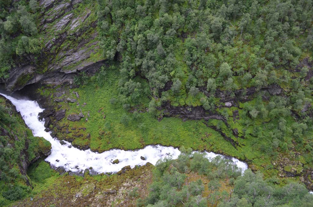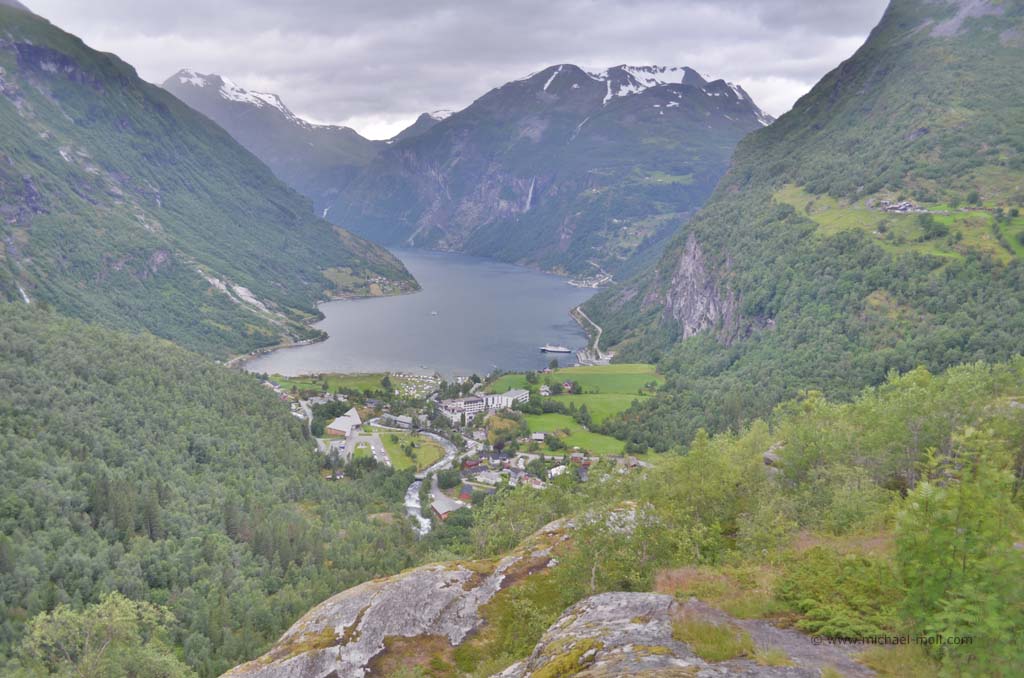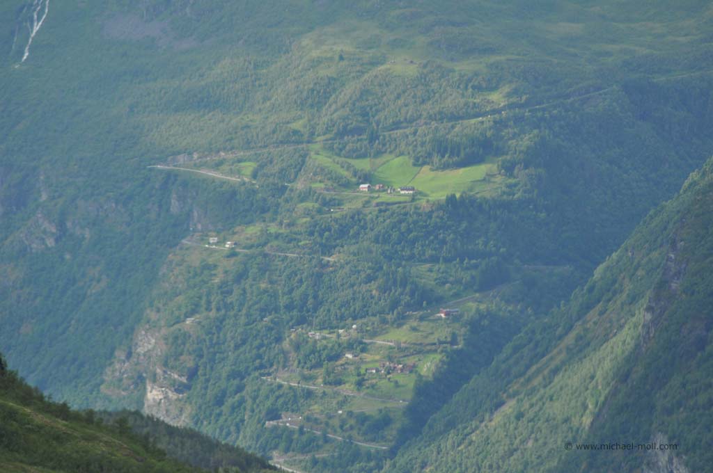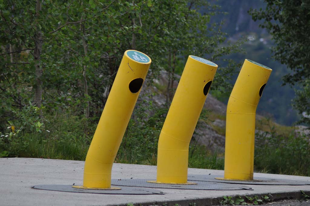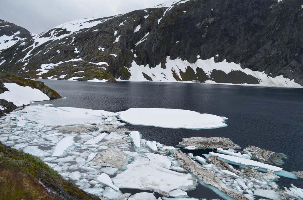 Der Wasserfall war deutlich ruhiger als am Kjeragmassiv und so schliefen wir in Ruhe aus, frühstückten gemütlich und machten uns auf den weiteren Weg gen Norden. Schon nach kurzer Zeit hörten wir unser Navi ganz neue Töne sagen: „An Bord fahren“ und „Fähre verlassen“. Warum sie das nicht schon gestern sagte, wissen wir nicht, aber heute tat sie es und wir taten wie befohlen. Ganz in Ruhe fuhren wir auf der Straße 13 und auf der Straße 600 an Fjorden vorbei, über Höhenzüge, durch enge Haarnadelkurven und hielten immer wieder an, um Aussichten zu genießen und Fotos zu machen. An einem Wasserfall, den wir allerdings schon kannten, war es jedoch so voll, dass ein Parken nicht mehr möglich war. Aber nicht schlimm, wir fuhren weiter nach Odda, parkten neben einigen anderen Wohnmobilen am Ufer eines Fjordes und schlenderten gemütlich durch die Ortschaft. Zum ersten Mal seit unserer Frachtschiffreise über den Atlantik aßen wir heute wieder Fisch, die Fischstäbchen in letzter Zeit mal ausgenommen. Da wir für den morgigen Tag schon wieder eine Wanderung vorhatten, genossen wir den Nachmittag und Abend mit Lesen, Ausruhen und einfach nur mal in der Sonne sitzen.
