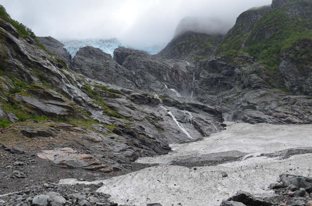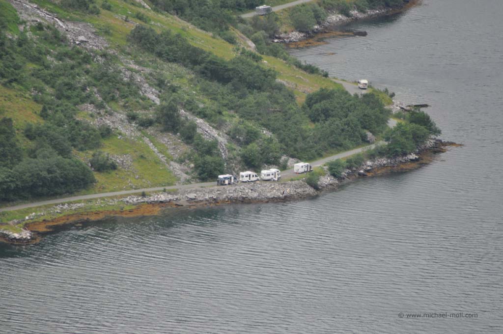 Viele der Personen machten zudem den Eindruck, dass sie annehmen, neue und gesunde Knie könnte man nach der Reise in einem Onlineshop bestellen. Dass wir auch hier wieder einen Sturz mit ansehen mussten, versteht sich daher von selbst. Zwar war kein Rettungshubschrauber notwendig, doch schön sah die Verletzung der Wanderin trotzdem nicht aus. Wenn man in Norwegen von Massentourismus sprechen sollte, dann muss man Preikestolen einfach erwähnen. Auf dem Parkplatz ist ganz Europa zu sehen. Der Reisebus aus Spanien steht neben dem Motorrad aus Griechenland und das Wohnmobil aus Italien parkt neben dem Auto aus Ungarn. Und manche Reisegruppen stammen sogar aus anderen Erdteilen, wie Moni feststellen musste, als sie beim Aufstieg von einer Asiatin zur Seite geschubst wurde. Mein Kommentar, dass das in China (englisch ausgesprochen) doch üblich sei, wie wir in Peking gelernt hatten, wurde von den Begleitern der Asiatin mit den Worten: „Yes, China“ beantwortet. Auch mein Kommentar wenig später, dass da jemand mit Flip-Flops auf dem Wanderweg unterwegs ist, wurde von dem Träger eben dieser Flip-Flops mit einem höhnischen Lachen bestätigt. Na ja, ich kann eben meine Klappe nicht halten, wenn ich so viel Dummheit sehe. Wie auch immer, die Menge an Menschen, die uns entgegenkam, ließ uns nur erahnen, wie voll es oben auf Preikestolen gewesen sein muss.