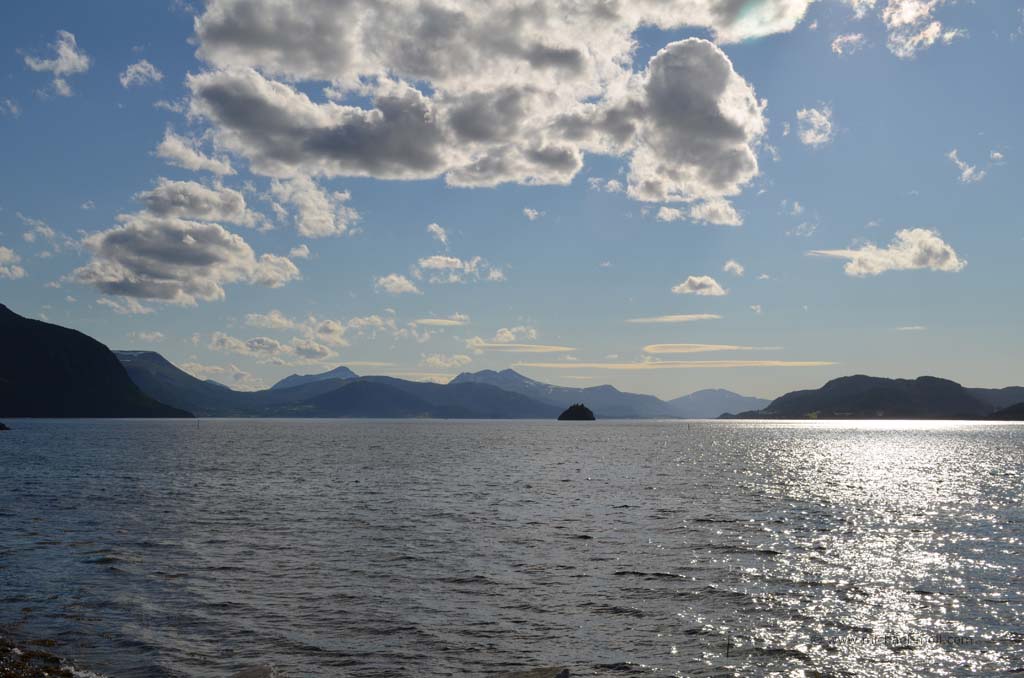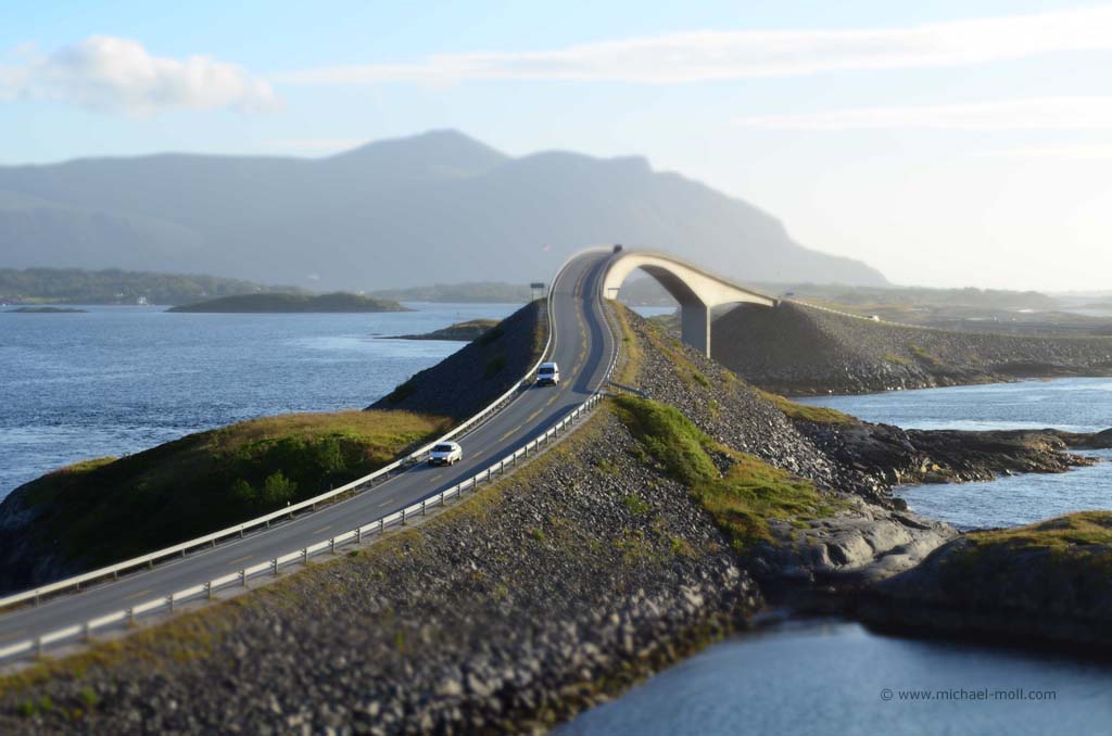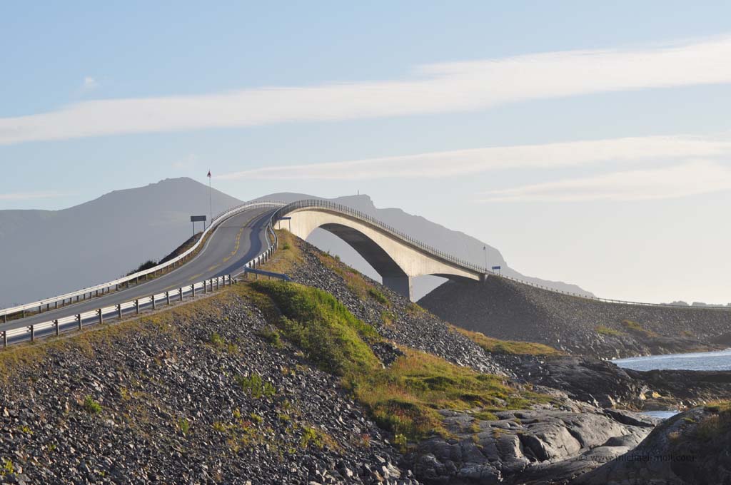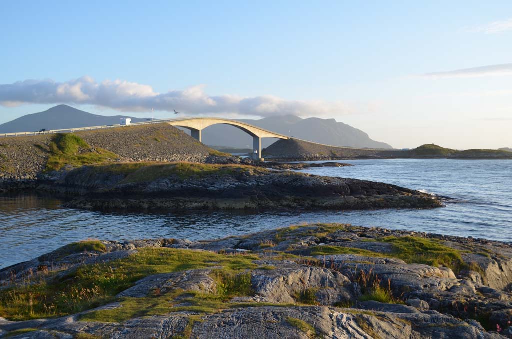 Unser weiterer Weg am späten Nachmittag brachte uns durch wunderbare Fjordlandschaft und es war natürlich auch mal wieder eine Fähre zu benutzen. Am frühen Abend erreichten wir dann unser Wunschziel für den heutigen Tag, die ebenfalls sehenswerte Atlantikstraße, die nicht nur direkt an der Küste verläuft, sondern auch mit mehreren Brücken einige kleine Schäreninseln miteinander verbindet. An der spektakulärsten Brücke, die scheinbar am Himmel endet, schlugen wir unser Nachtlager auf, gingen noch ein wenig spazieren und ließen den Tag zu Ende gehen.