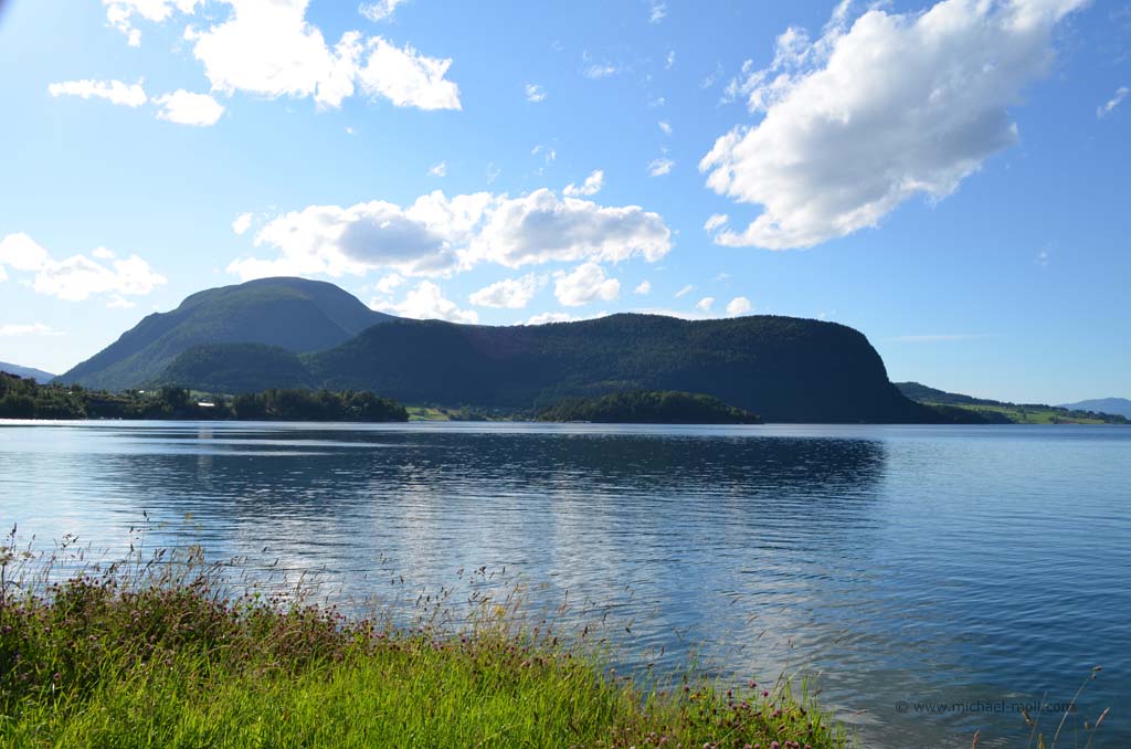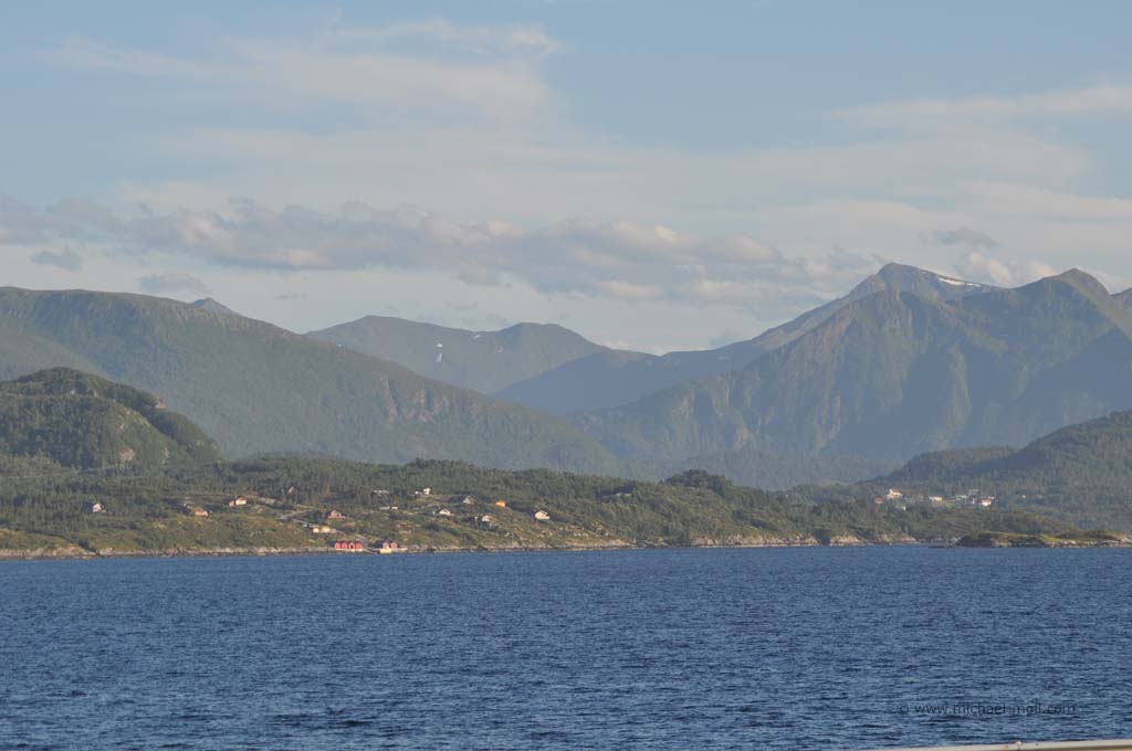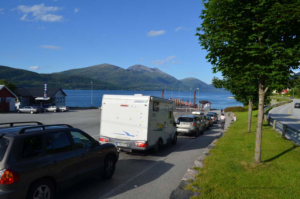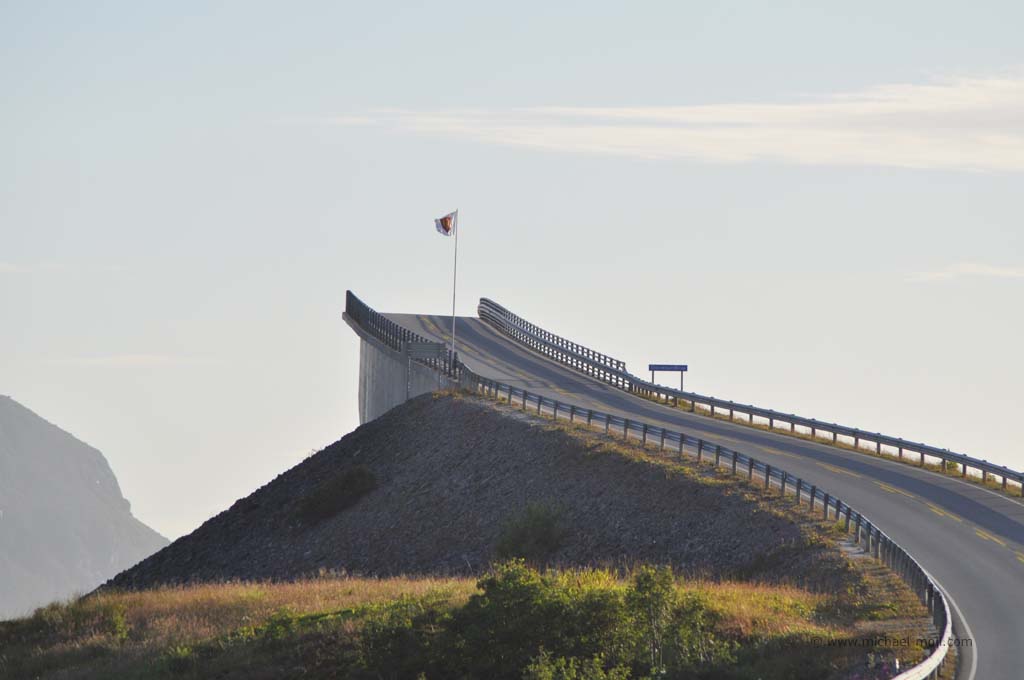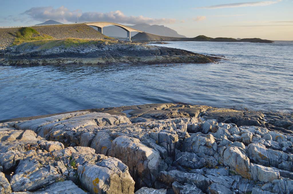 Unser weiterer Weg am späten Nachmittag brachte uns durch wunderbare Fjordlandschaft und es war natürlich auch mal wieder eine Fähre zu benutzen. Am frühen Abend erreichten wir dann unser Wunschziel für den heutigen Tag, die ebenfalls sehenswerte Atlantikstraße, die nicht nur direkt an der Küste verläuft, sondern auch mit mehreren Brücken einige kleine Schäreninseln miteinander verbindet. An der spektakulärsten Brücke, die scheinbar am Himmel endet, schlugen wir unser Nachtlager auf, gingen noch ein wenig spazieren und ließen den Tag zu Ende gehen.