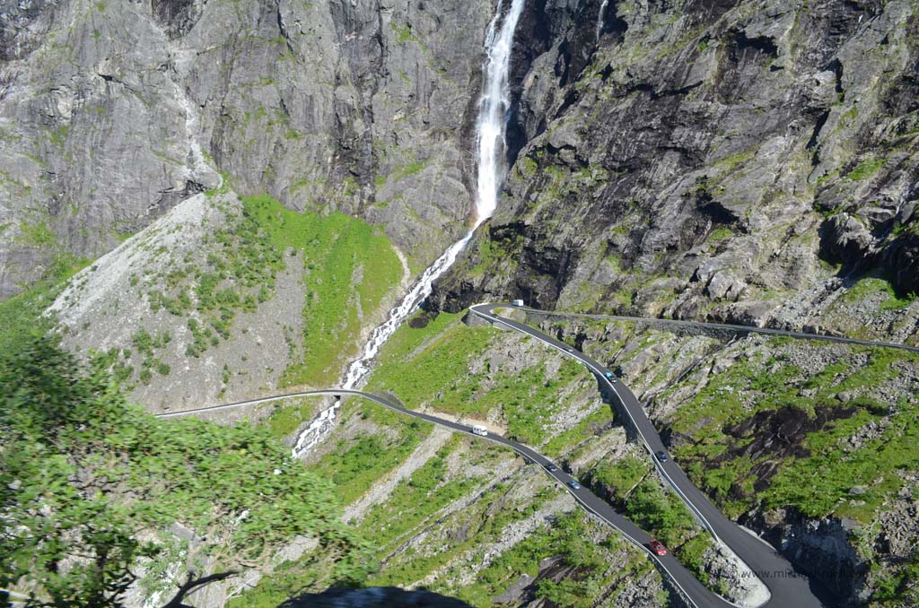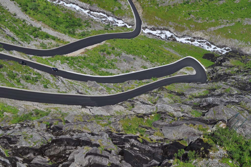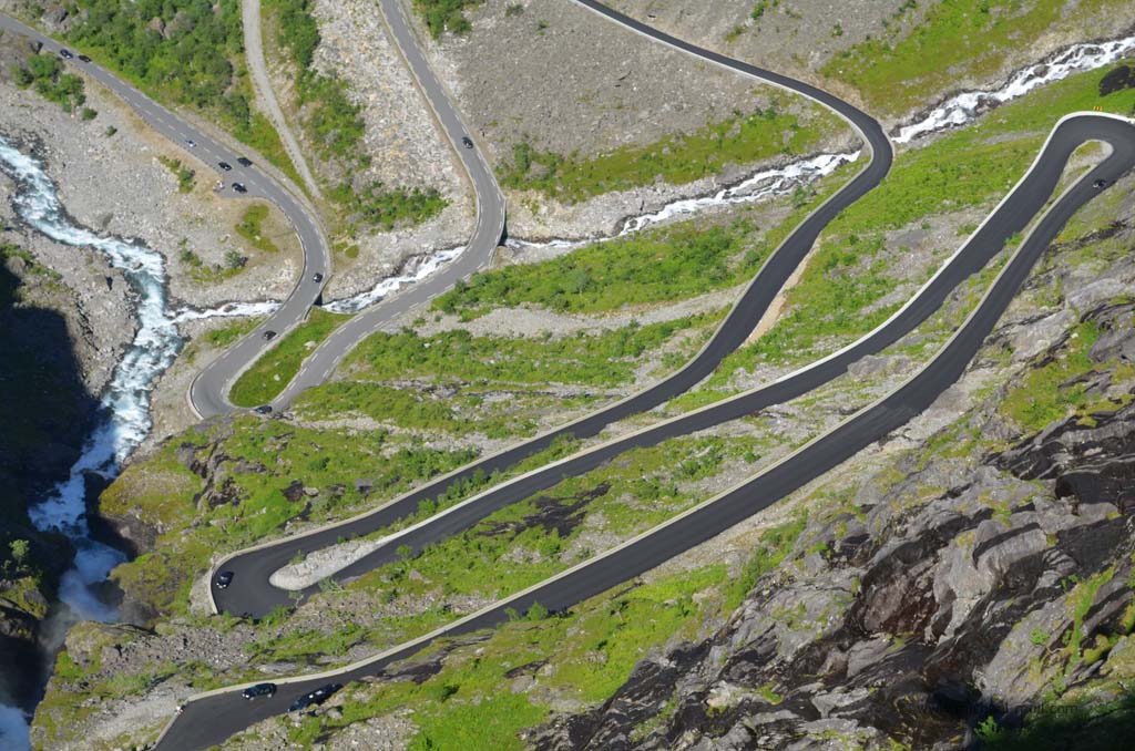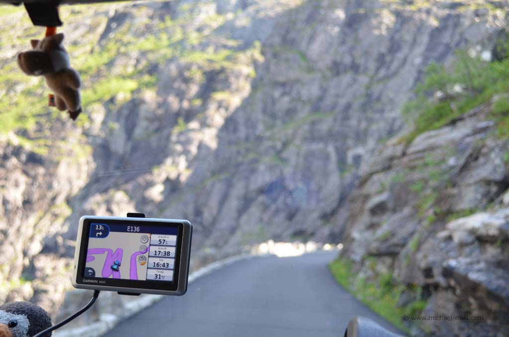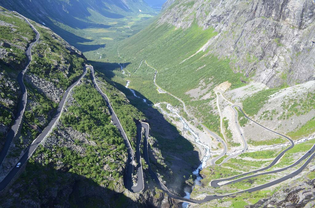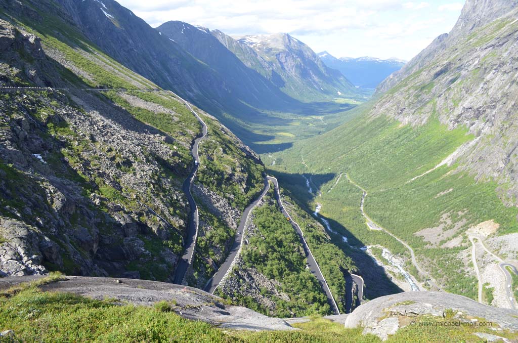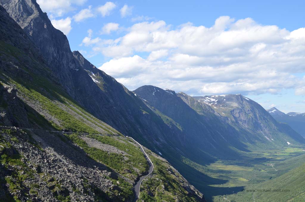 Wieder an Land bogen wir nach links ab und erreichten nach kurzer Zeit und mal drei längeren Tunneln die sogenannte Rosenkirche. Diese komplett aus Holz bestehende Kirche ist mit zahlreichen Motiven aus dem 17. Jahrhundert bemalt und einfach sehenswert. Nach der Kirchenbesichtigung fuhren wir das Stück zum Fähranleger zurück und daran vorbei, weil unser nächstes Ziel der berühmte Trollstigen sein sollte. Schon auf dem Weg dorthin fuhren wir mal wieder an spektakulären und grandiosen Landschaften vorbei und durch ein langgestrecktes Tal, in dem wir langsam aber sicher an Höhe gewannen. Immer wieder hielten wir zwischendurch an, machten Bilder und genossen die Aussichten. Nach einiger Zeit sahen wir schließlich den Parkplatz, der den höchsten Punkt des Trollstigens markiert. Wir steuerten unser Wohnmobil zwischen die anderen Fahrzeuge und Campingwagen und gingen zu den beiden Aussichtsplattformen, die zu einem wunderbaren Ausblick verhalfen. Nicht nur verschiedene Wasserfälle waren zu sehen, sondern auch das enge Tal und natürlich die zahlreichen Serpentinen der Straße, die uns nach dem tollen Ausblick in das Tal hinab führte. Es ist einfach unglaublich, wie Menschen auf die Idee kommen können, so eine Straße zu bauen aber es macht Spaß, sie im kleinen Gang hinab zu fahren.
