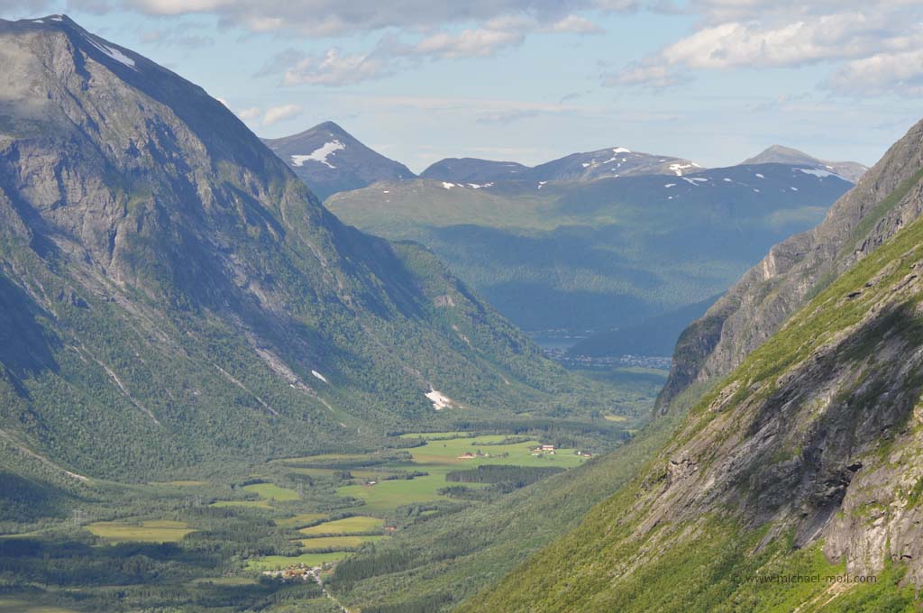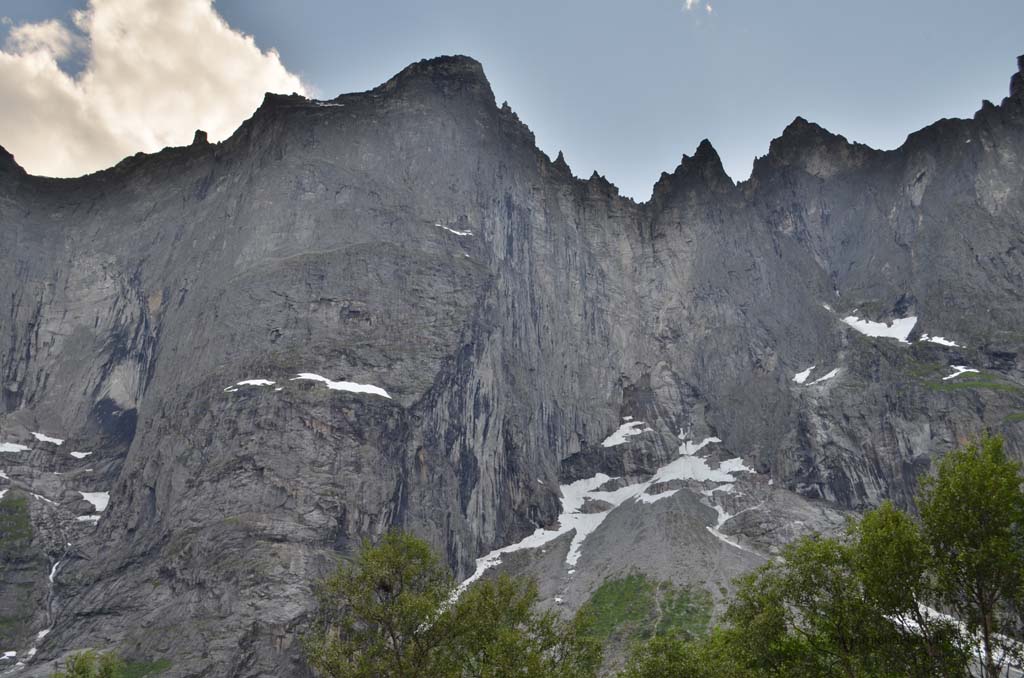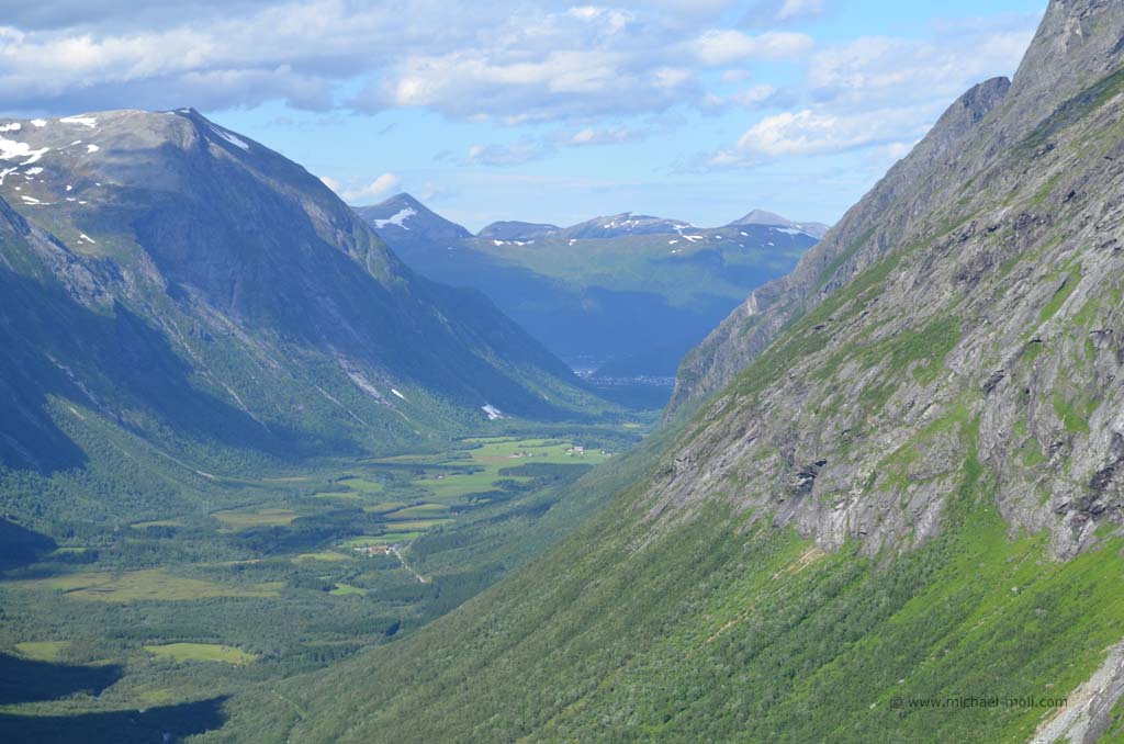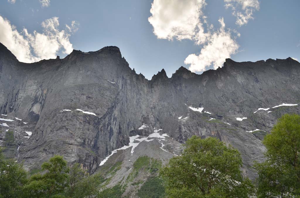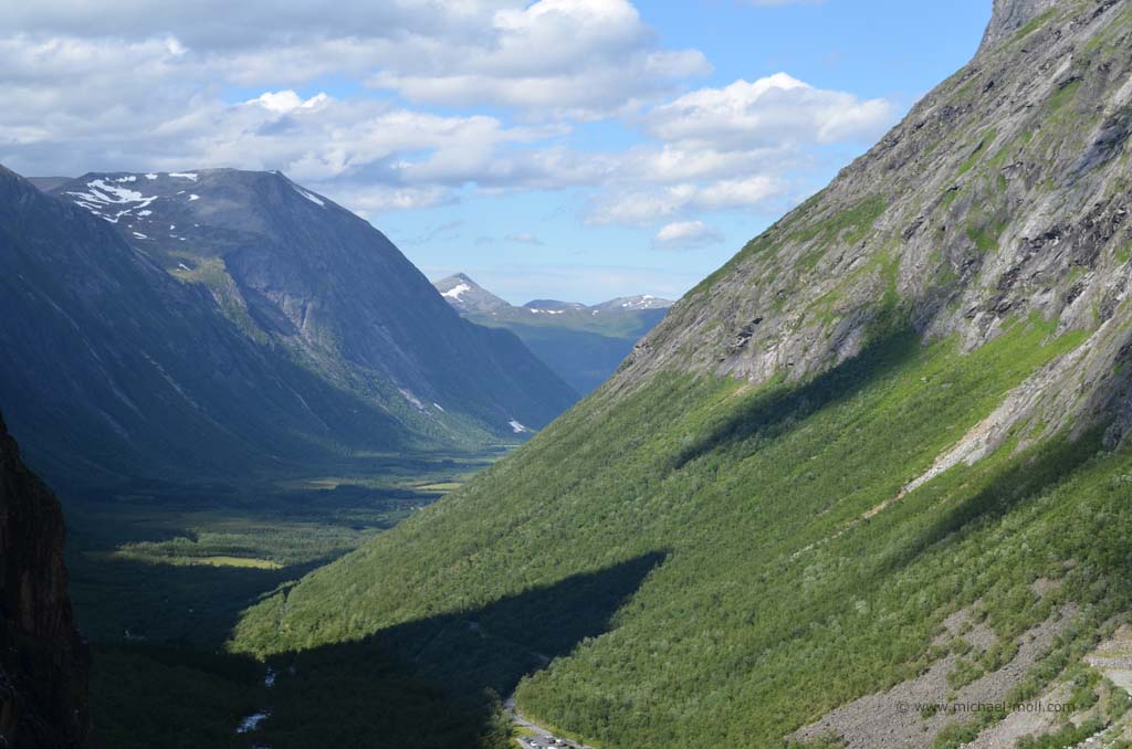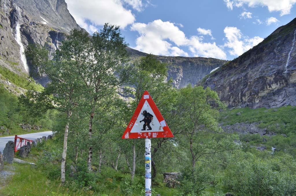 Am Ende des Tals bogen wir zunächst rechts ab, weil wir uns die sogenannten Trollwände anschauen wollten. Schon bald zeigte uns ein Schild mit der Aufschrift Trollveggen an, dass wir richtig sind. Es handelt sich dabei um die steilsten und höchsten Felswände Europas, auch Trolltindene genannt, wo es bis zu 1.700 Meter steil bergauf- bzw. bergab geht. Von unten sah es gar nicht so schlimm aus, aber eine Infotafel mit einem Vergleichsbild des Eiffelturms verdeutlichte, wie hoch die Wände wirklich sind.