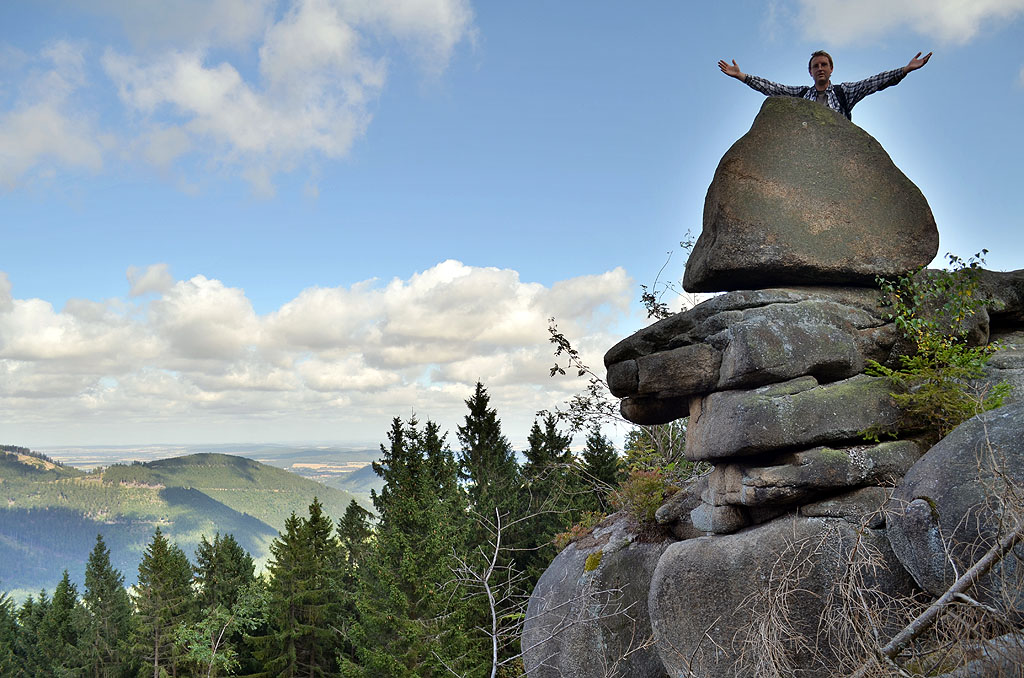 Nicht weit von dort entfernt, befindet sich unter anderem die Achtermannshöhe. Natürlich auch mit der Möglichkeit, einen Stempel in seinen Pass zu stempeln. Aber von dort hat man auch einen wunderbaren Ausblick auf den höchsten Berg des Harzes – den Brocken. Mit etwas Geduld kann man sogar von dort sehen, wie am Hang des Brockens sich zwei Züge der Brockenbahn begegnen. Bessere Möglichkeit, die Brockenbahn im Doppelpack zu erleben, hat man aber an der Drei Annen Hohne. Die Brockenbahn ist zwar nett, aber mich persönlich hat es ein wenig gestört, wenn beim Wandern im Wald ständig das Pfeifen der Bahn zu hören ist. Und wenn sie dann noch nah ist, verschreckt sie doch alle Tiere. Finde ich für einen Nationalpark etwas seltsam. Oder sehe ich das falsch?