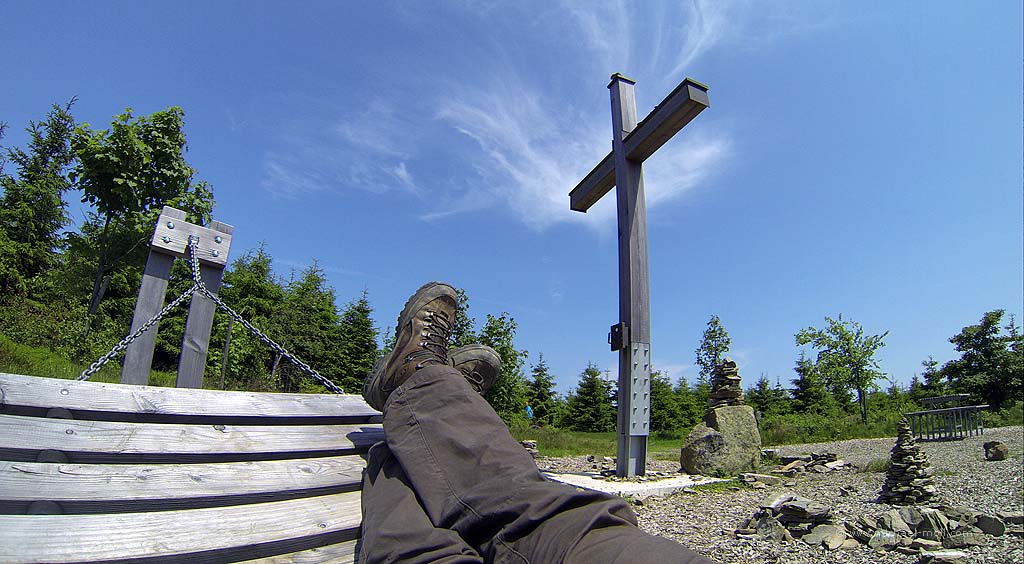 Außerdem hatte ich endlich mal Gelegenheit, den höchsten Berg von Nordrhein-Westfalen zu erobern. Dieser ist natürlich nicht der Kahle Asten, auch wenn das viele falsch annehmen. Vielmehr ist der Langenberg der höchste Punkt von NRW. Allerdings ist dieser weniger gut erreichbar und hat leider auch gar keine Aussichtsmöglichkeit. Dafür jedoch einen netten Rastplatz am Gipfelkreuz.
