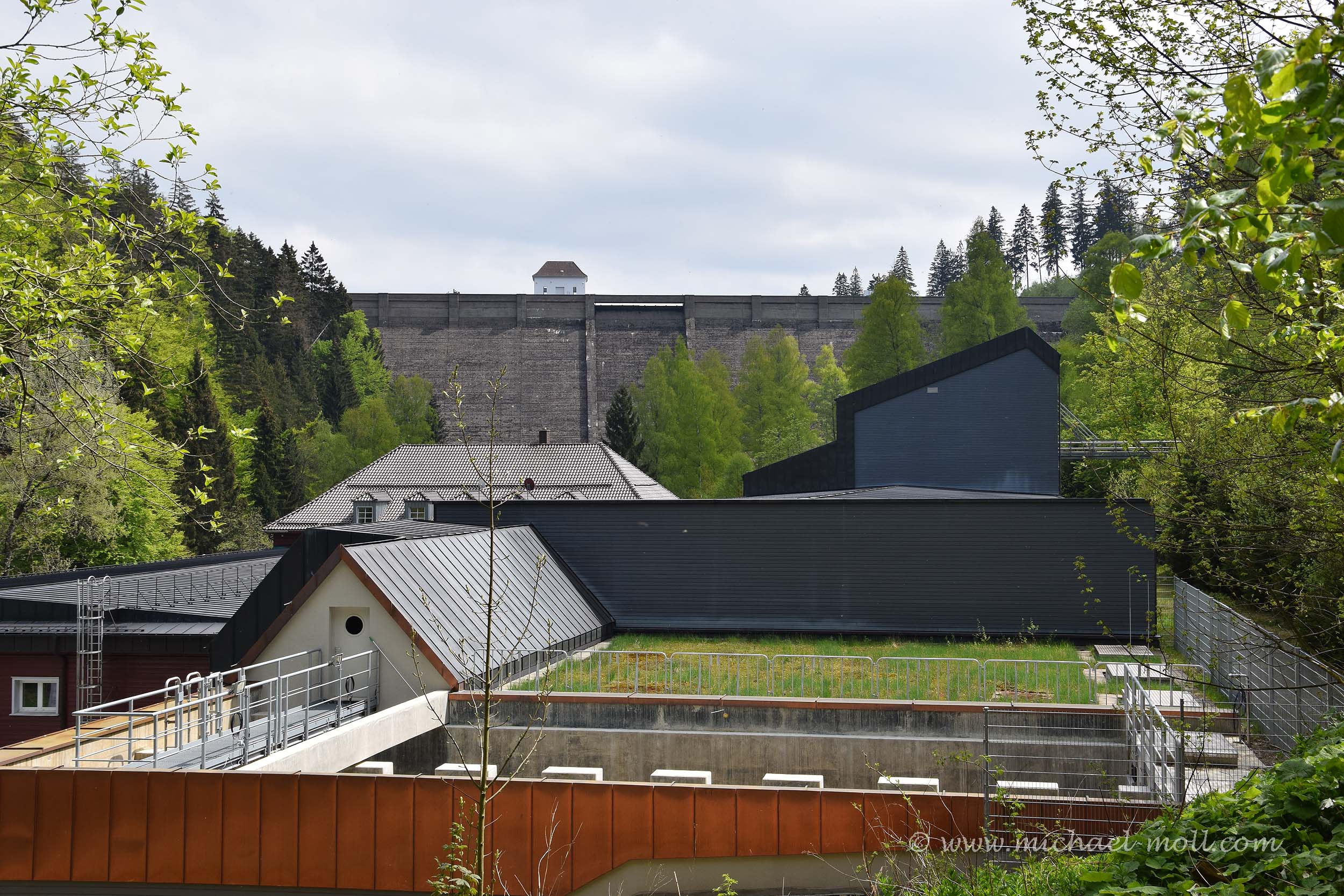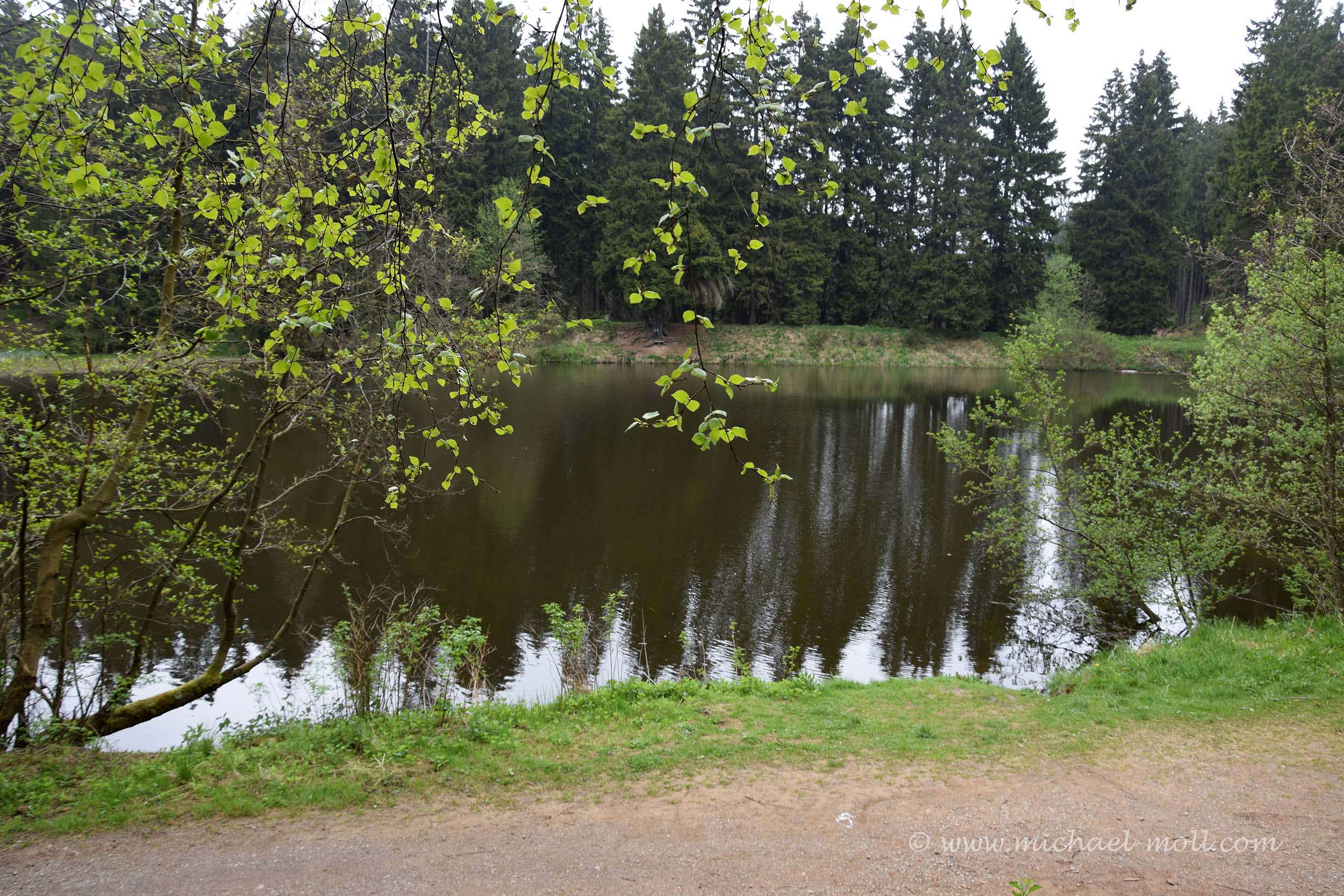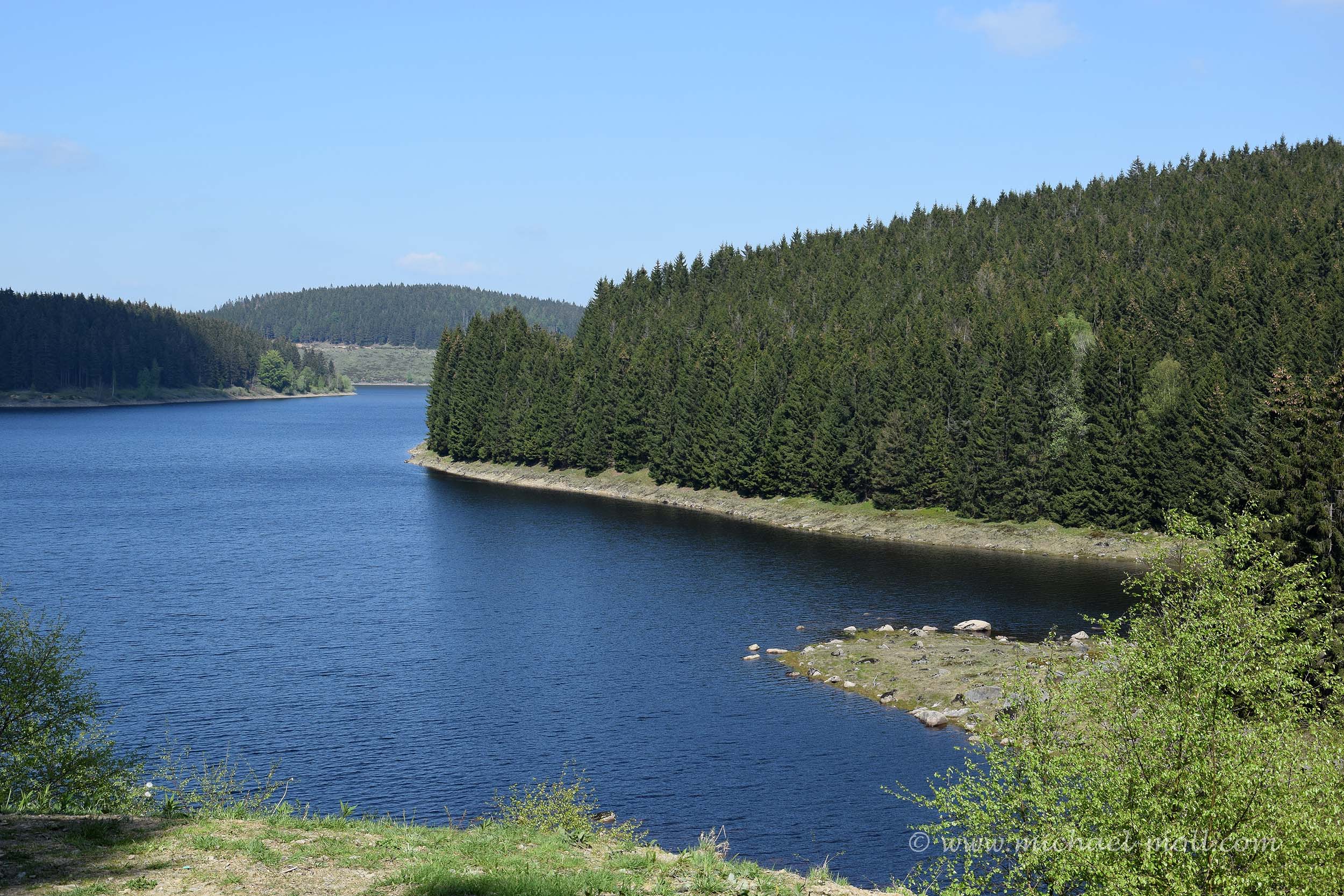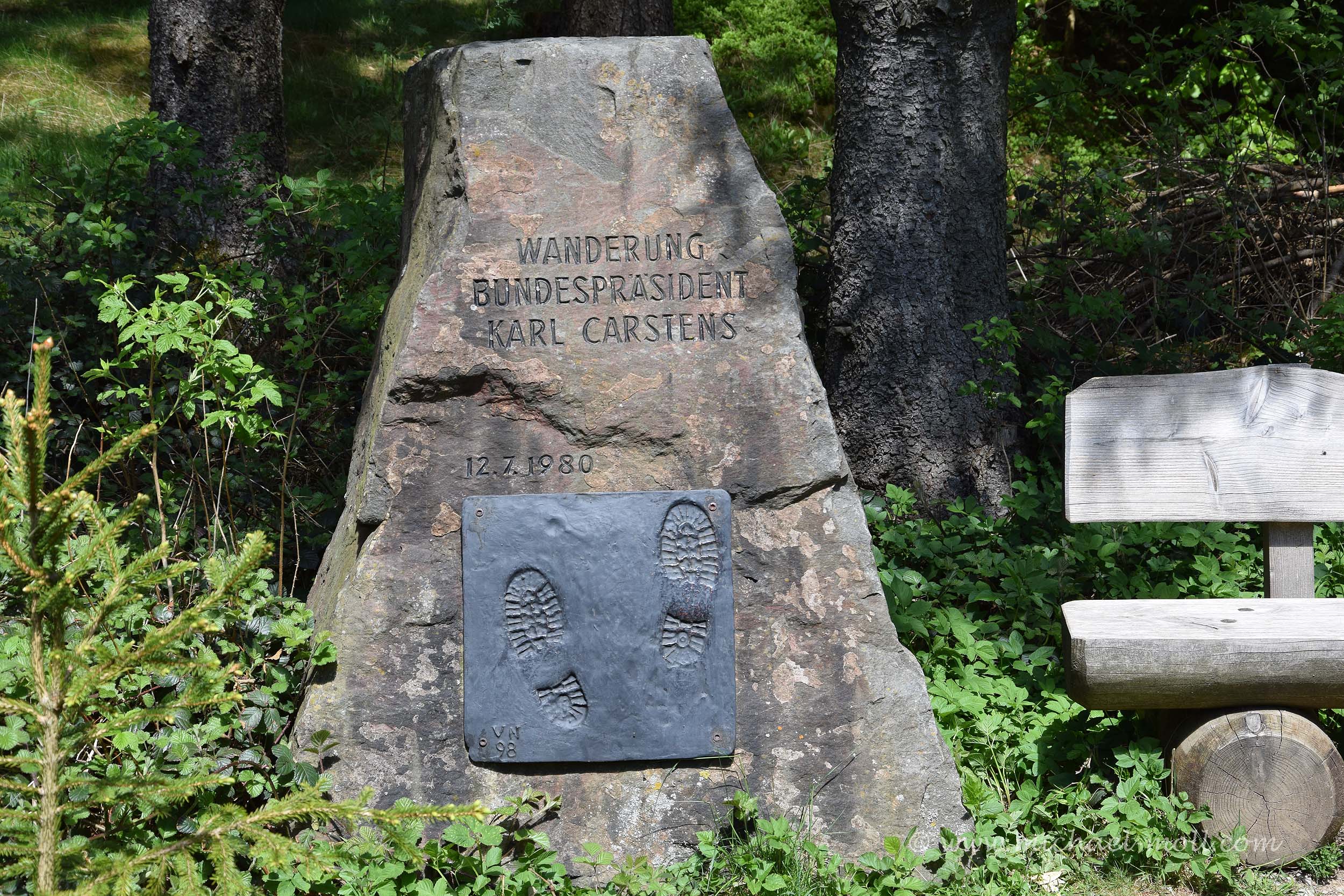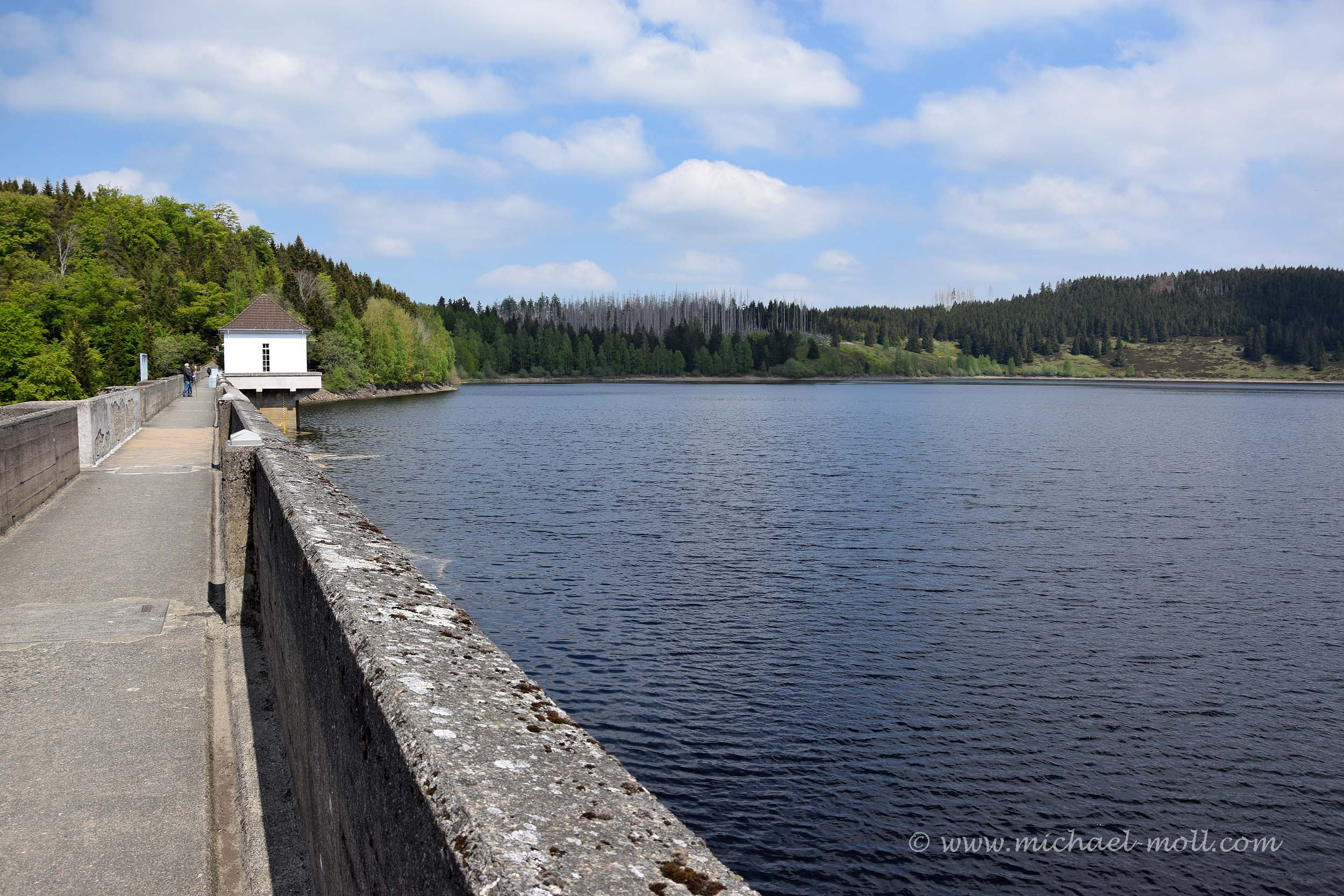 Hier legten wir aber dann auch endlich mal eine Pause ein, immerhin waren wir jetzt rund 10 Kilometer unterwegs. Außerdem überlegten wir, ob wir nun den direkten Weg nach Bad Harzburg nehmen wollten oder ob wir noch zwei weitere Stempel einholen. Wir entschieden uns für Letzteres und machten uns auf den Weg zur Eckertalsperre. Unterhalb des Kaiserwegs wanderten wir durch ein wirklich schönes Tal bis zur Staumauer, wo es natürlich wieder hinauf ging. Das Besondere an der Eckertalsperre ist der ehemalige Grenzpfahl zwischen Westdeutschland und der DDR, denn die Grenze und damit der Eiserne Vorhang verlief genau durch den See und über die Staumauer – heutzutage kaum noch vorstellbar.