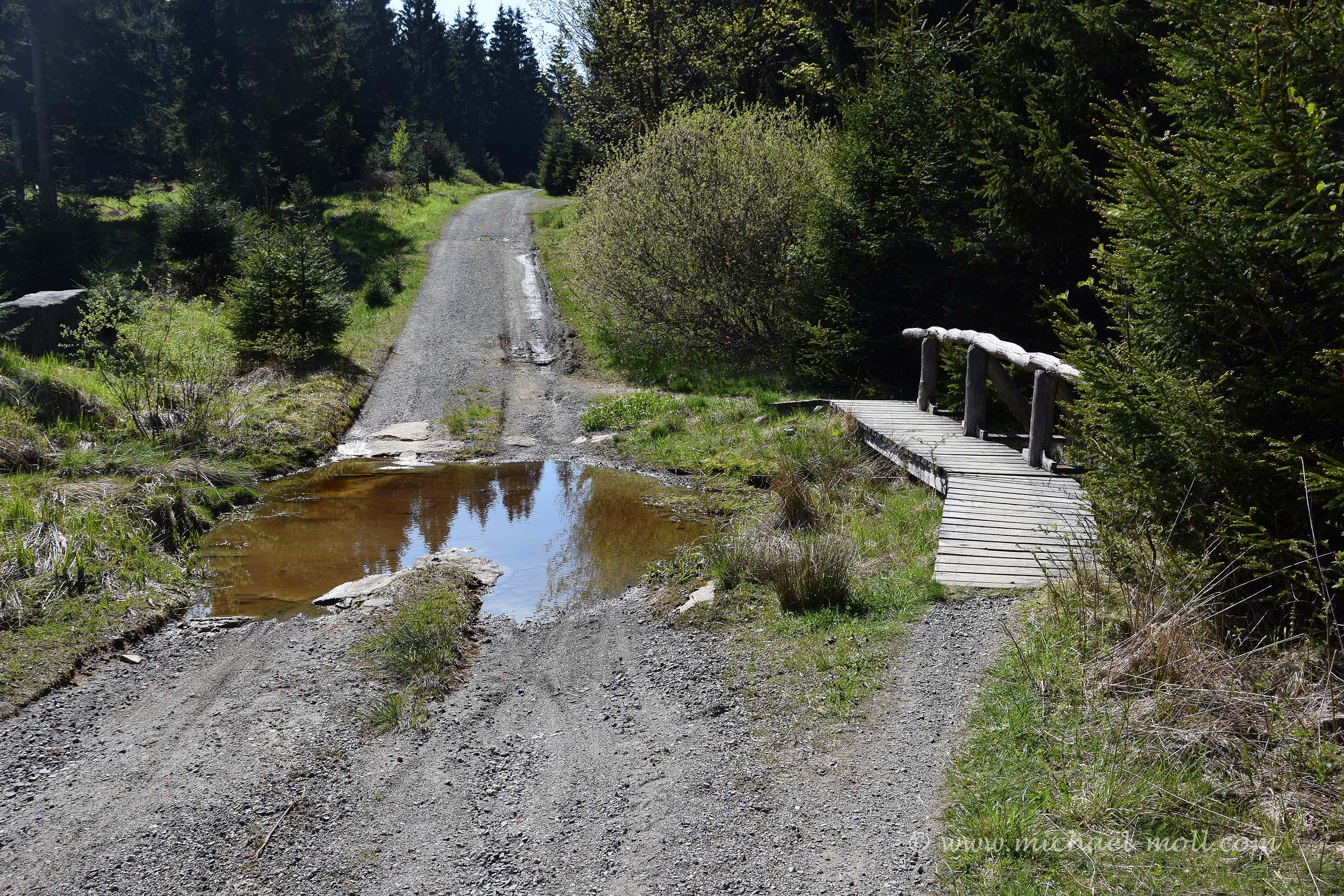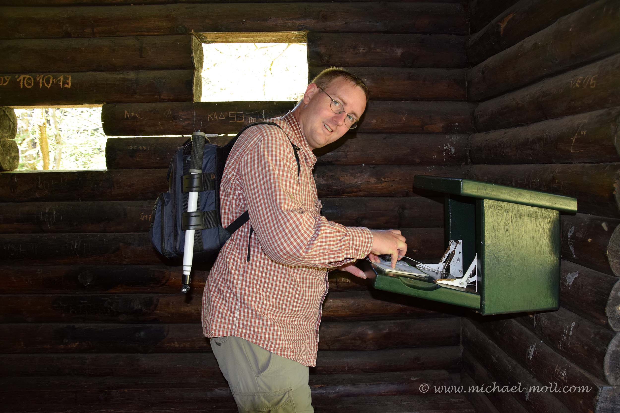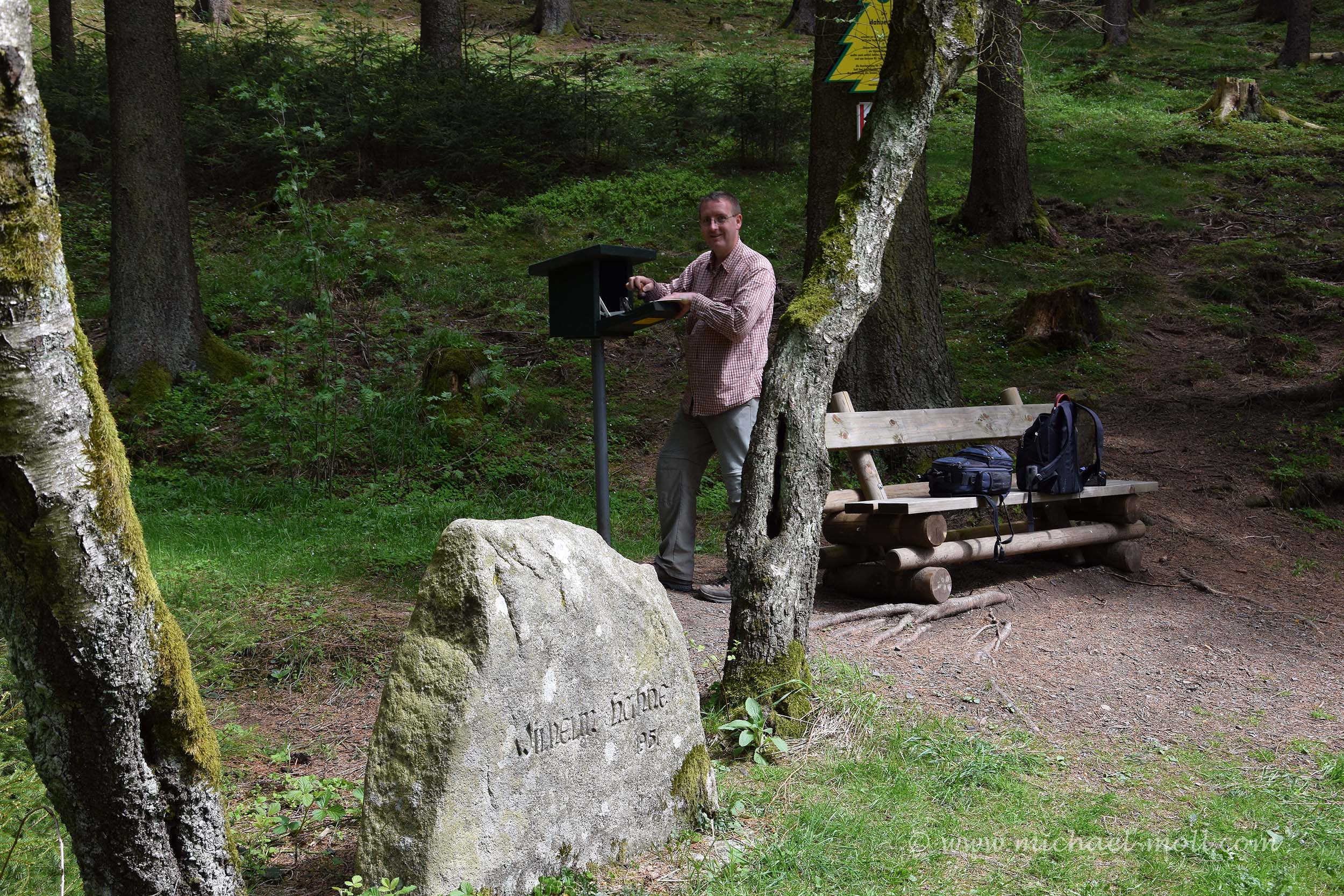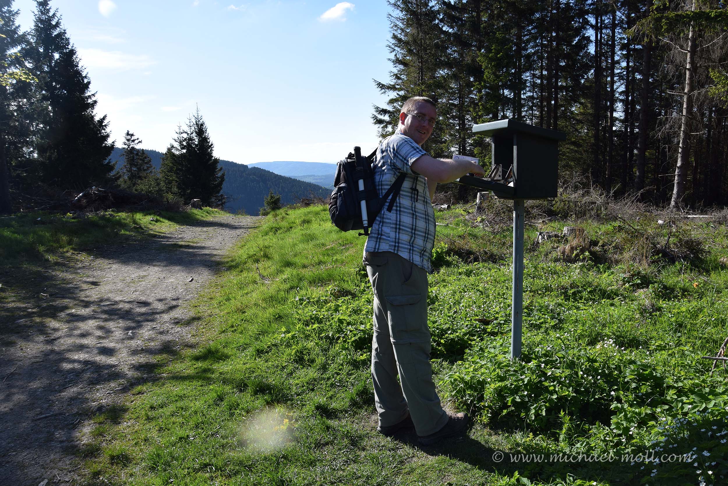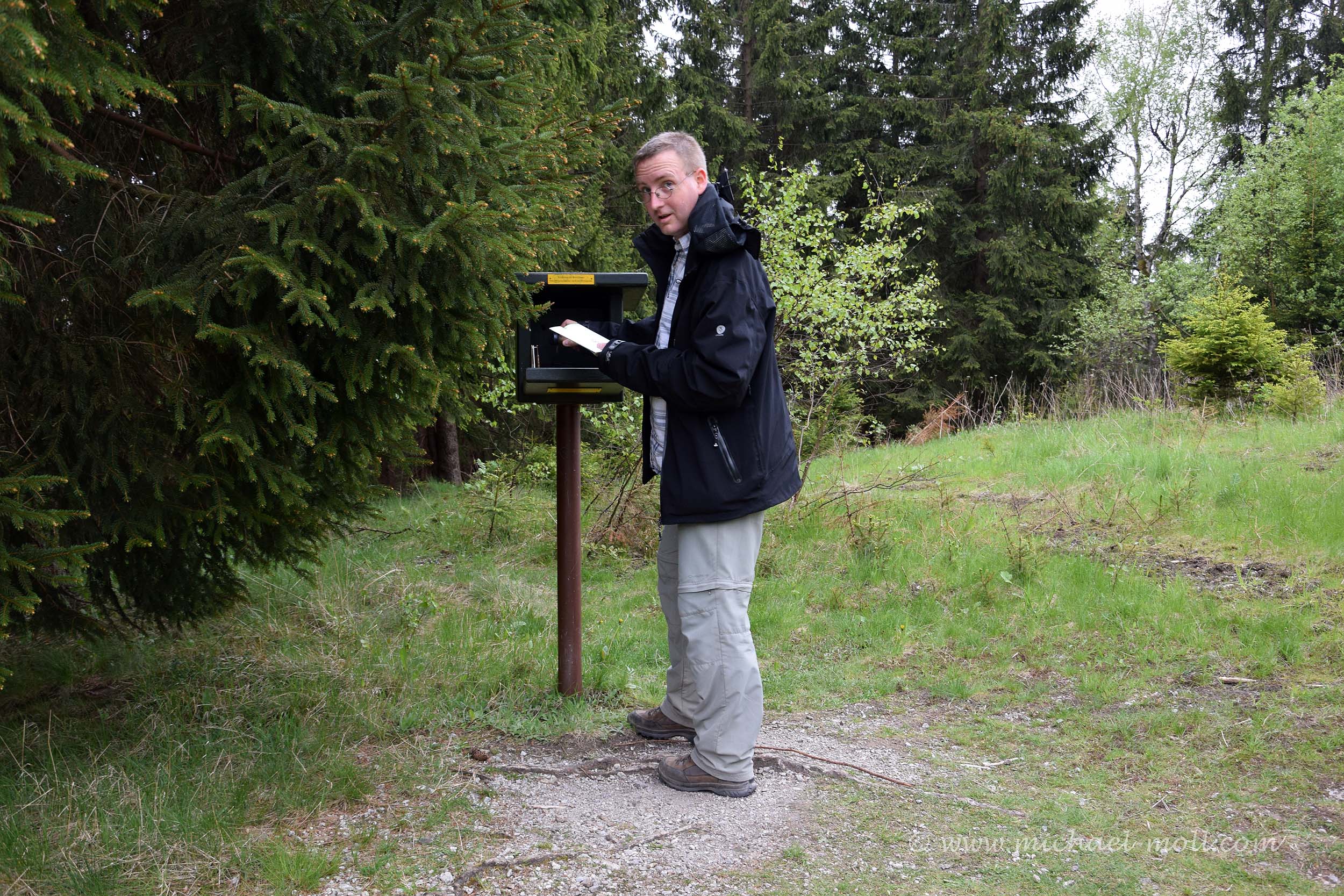 Für den Tag sollten aber Stempelstellen anstehen, für die man nicht ganz so weit wandern müsste. Unsere erste Fahrt brachte uns südwestlich von Braunlage zur Bundesstraße 27, wo wir auf fast ebener Strecke zum Stempelkasten 157 (Kapellenfleck) gelangten.