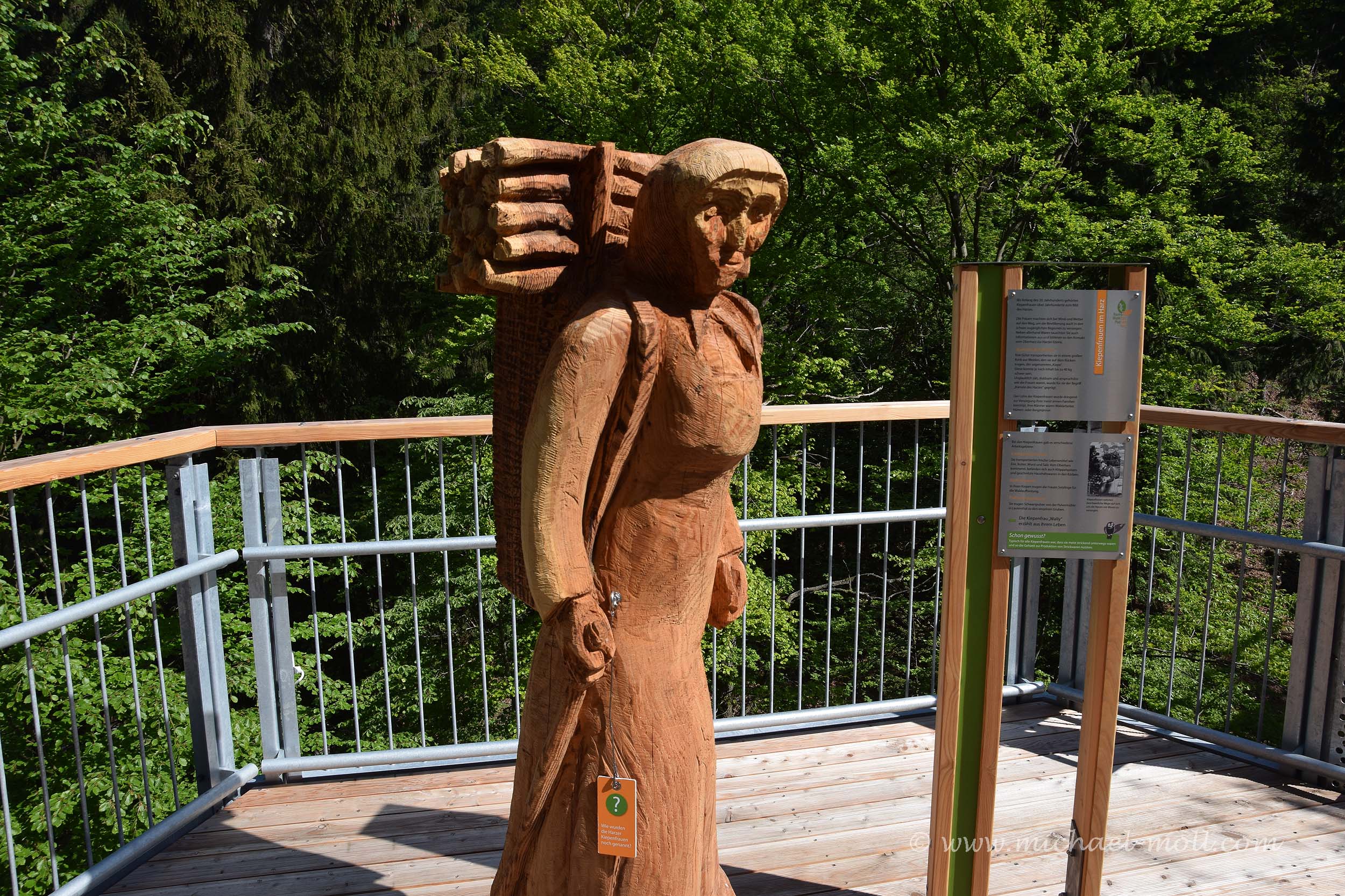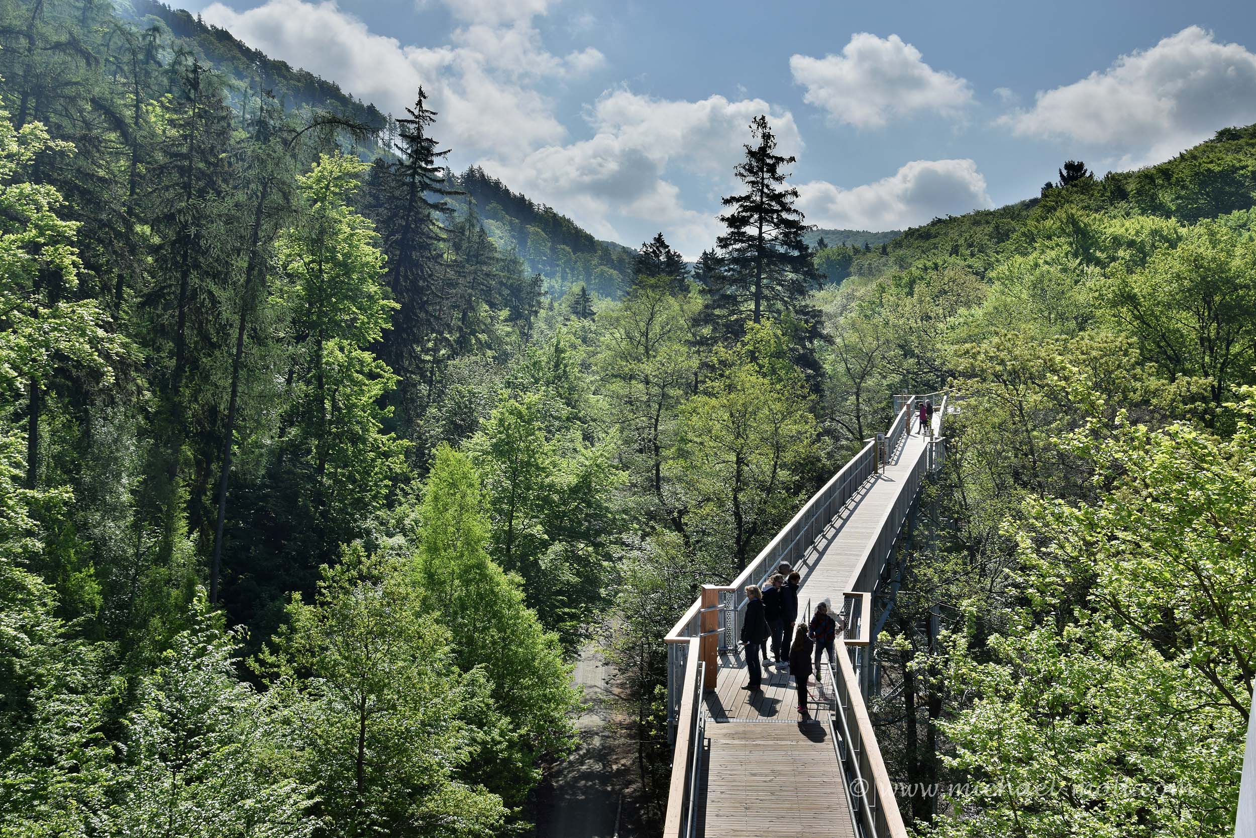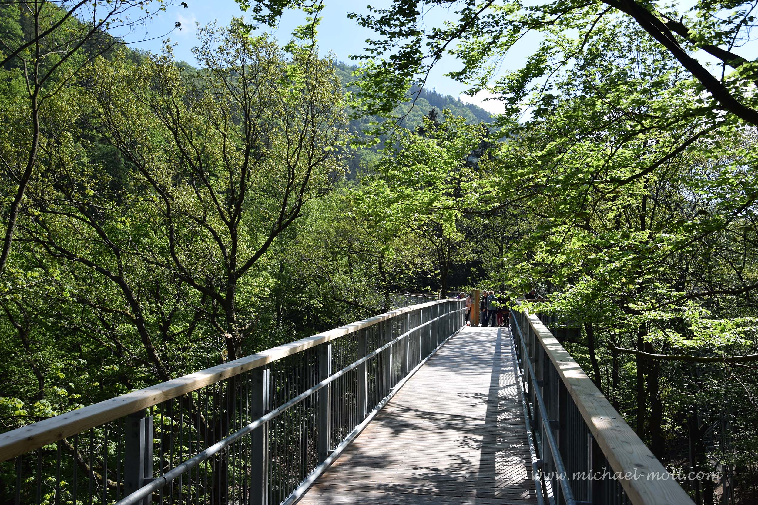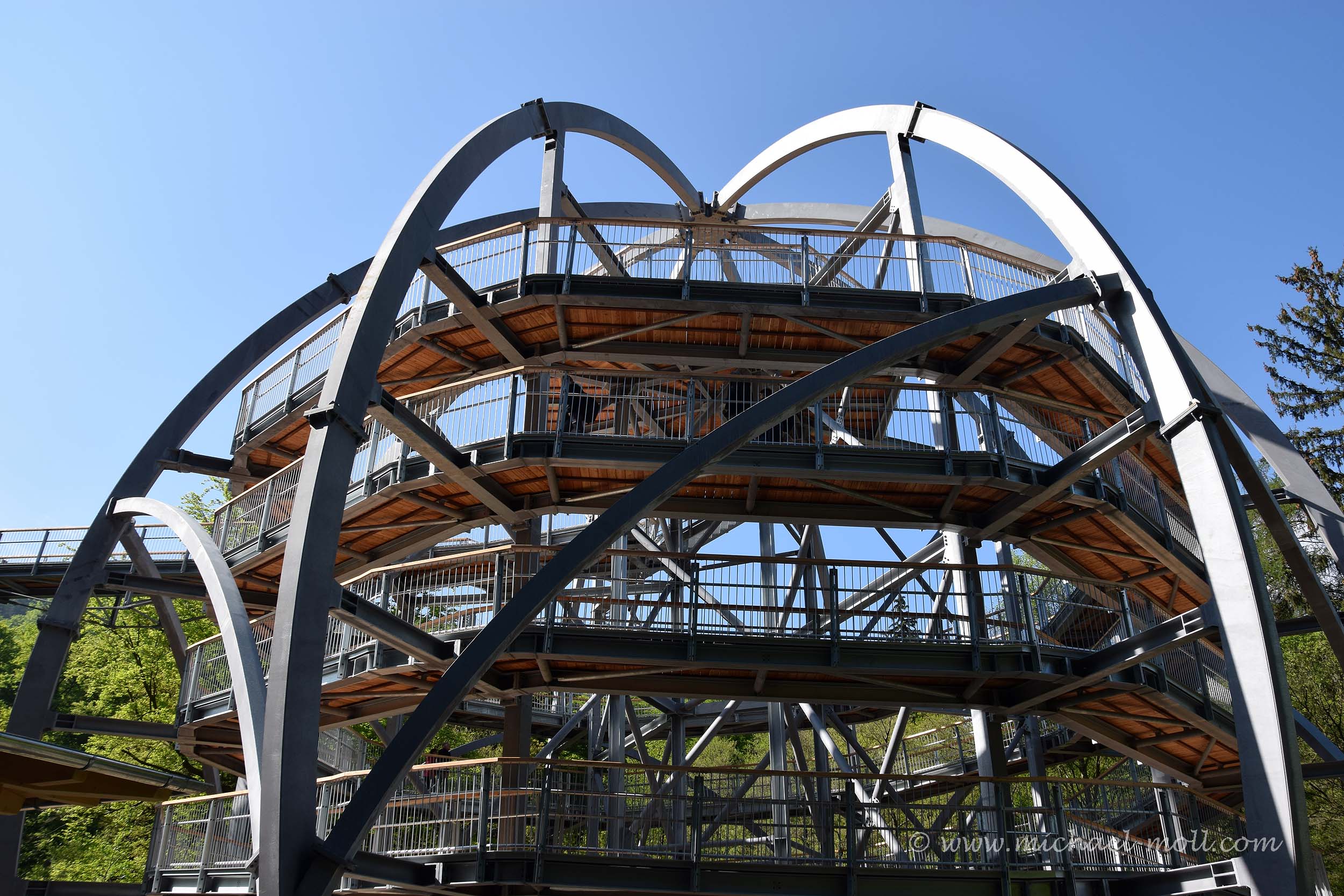 Wir frühstückten in Ruhe, was für uns recht ungewöhnlich ist, da wir uns normalerweise sofort auf die Socken machen, und gingen zunächst einmal zur Kasse des Baumwipfelpfads in Bad Harzburg. Dieser ist nämlich ganz neu und hatte erst eine Woche zuvor geöffnet. Das hatte uns natürlich neugierig gemacht. Über eine Brücke geht man in ein Tal hinein und wird von der Kuppel des Baumwipfelpfads begrüßt, die ein wenig an die Kuppel im Berliner Reichstag erinnert. Denn auch hier wandert man in weiten Kreisen bergauf und erreicht die Aussichtsplattform sowie den eigentlichen Zugang zum Baumwipfelpfad.