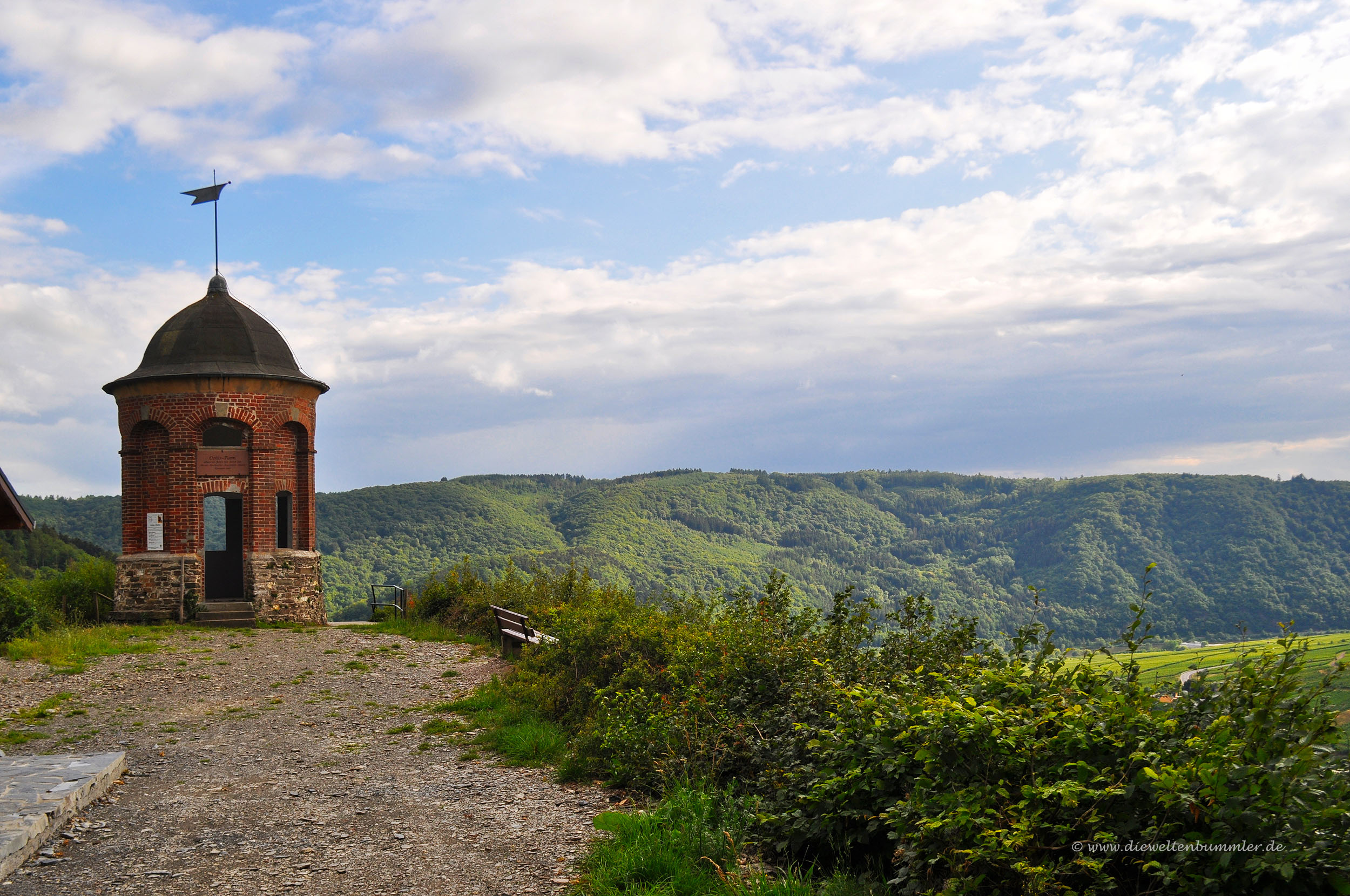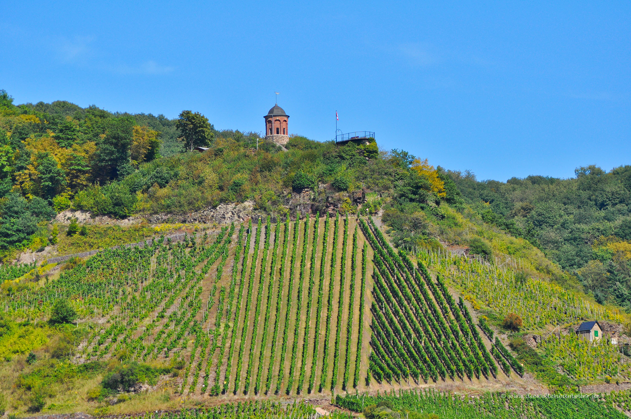 Den Collis-Turm lassen wir hinter uns und wandern auf dem leicht aufsteigenden Weg durch den Wald, bis er in eine Forststraße mündet. Wir biegen links auf einen von Eschen und Buchen gesäumten ebenen Weg. Er bringt uns zu einer Weggabelung, wo wir uns halbrechts halten. Kurvig verläuft unser Weg nun auf der Moselhöhe. Zu unserer Linken macht der Wald Platz für Weinberge, über deren Rebstöcke hinweg wir eine schöne Aussicht auf das Moseltal haben. An einer Weggabelung wenden wir uns nach rechts, biegen aber sofort nach links ab, um nach wenigen Metern einen weiteren Aussichtspunkt mit der im Jahr 1970 erbauten Läns-Schutzhütte zu erreichen.