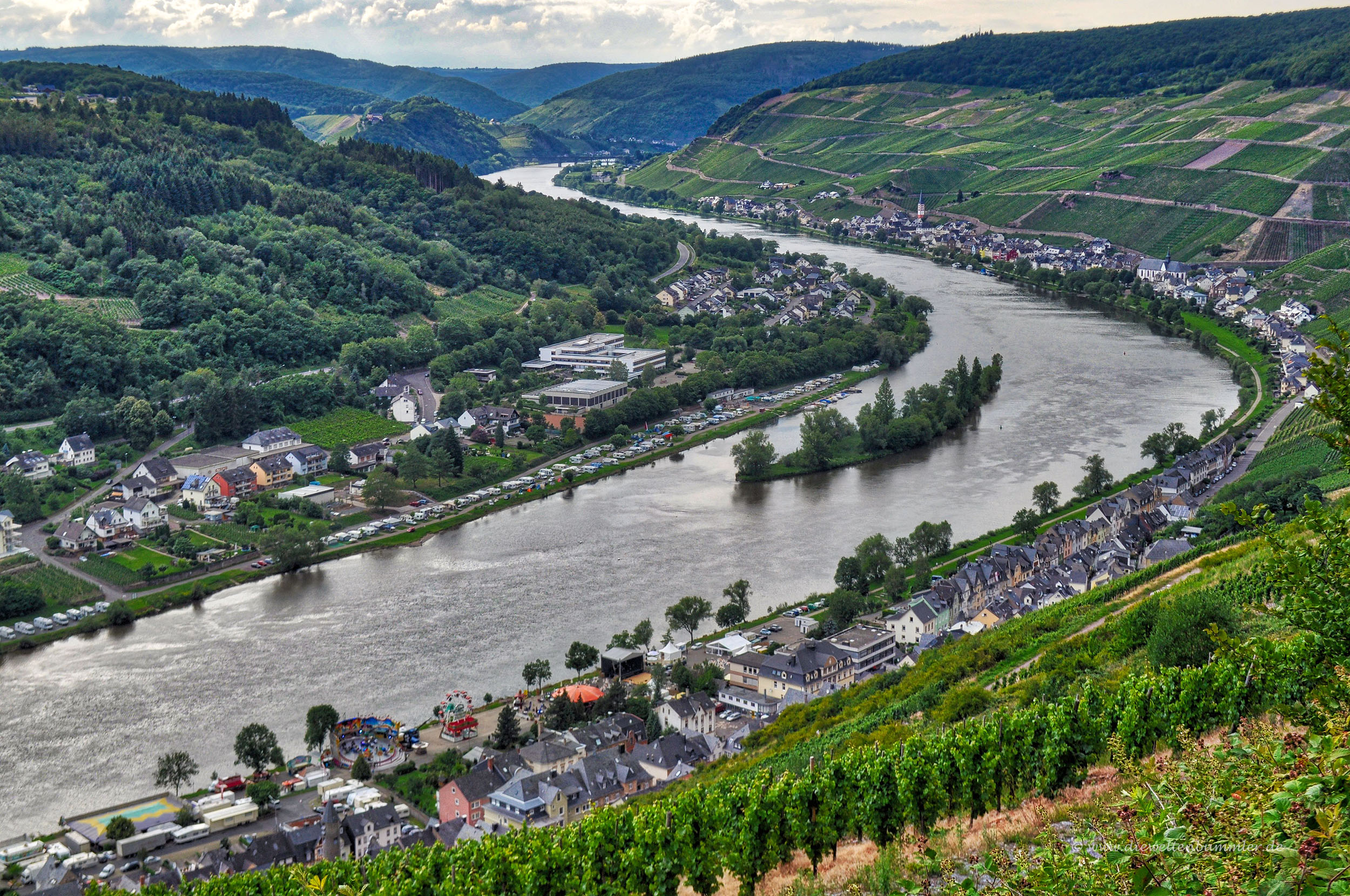 Wenn sich unser Blick wieder zum Fluss senkt, erkennen wir den Turm der St. Peterkirche. Gleich daneben überspannt die Zeller Fußgängerbrücke die Mosel, welche mittlerweile wieder über einen Kilometer zurückgelegt hat. Rechts neben der Brücke breitet sich der Festplatz aus, auf dem am letzten Juniwochenende eines der ersten Weinfeste an der Mosel gefeiert wird und dessen Musik bis zum Collis-Turm zu hören ist. An einer kleinen, unbewohnten Insel vorbei fließt die Mosel weiter ostwärts. Sie windet sich noch einmal und verabschiedet sich aus unserem Blickfeld. Wenn wir ganz genau hinschauen, erkennen wir in viereinhalb Kilometern Entfernung die markante Doppelstockbrücke bei Bullay.