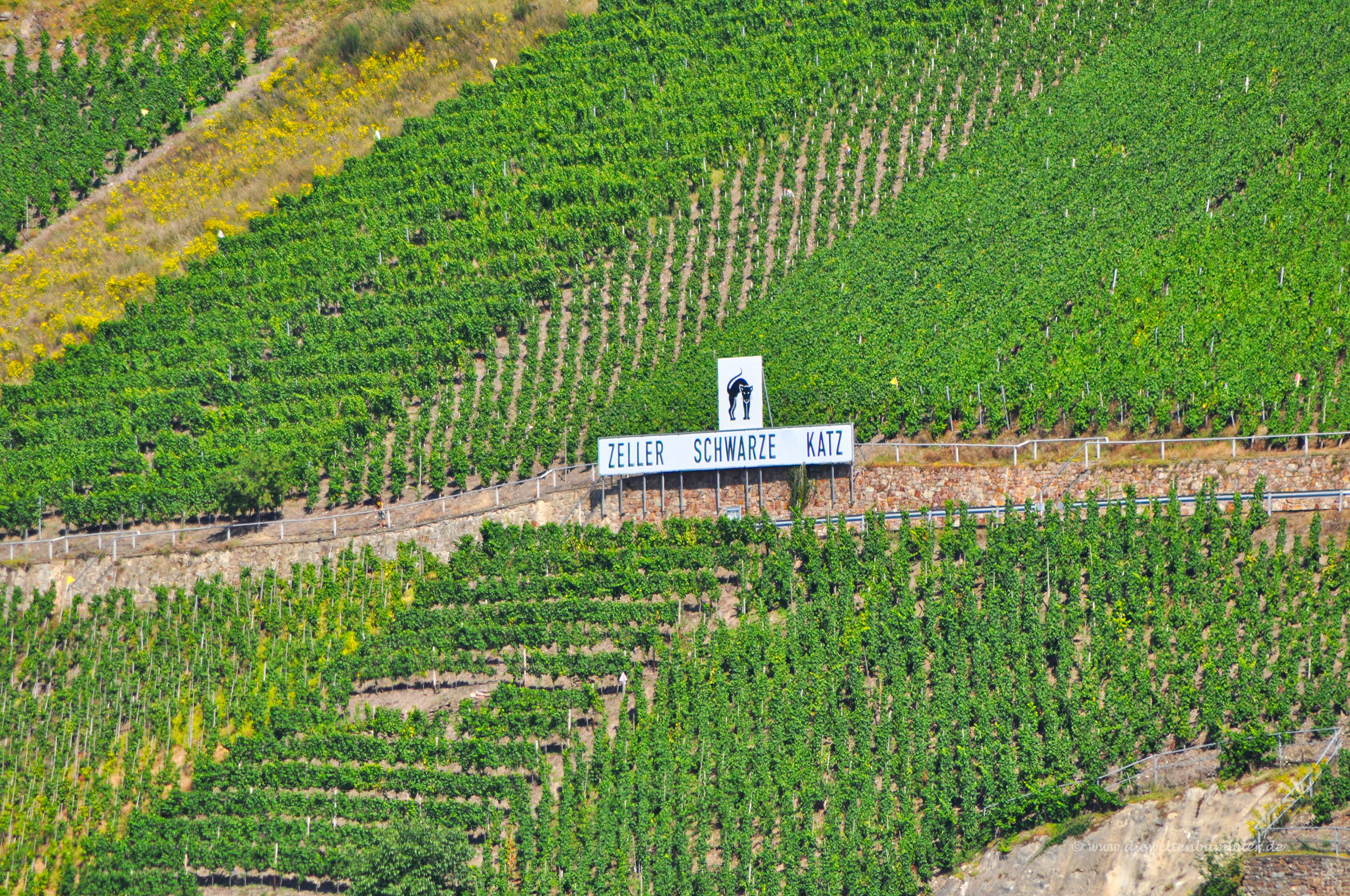 Erst als sie laut fauchend mit ihrer Pfote um sich schlägt, bemerken die Weinhändler das Tier. Nach einer kurzen Schrecksekunde werten sie die den Wein verteidigende Katze als Zeichen und entscheiden sich für dieses Fass – mit Erfolg, denn der Wein findet reißenden Absatz. Und so erhielt die Weinlage, aus der die Trauben stammten, den Namen Schwarze Katz. Zurück im 21. Jahrhundert stellen wir fest, dass es sich wohl um eine Legende handelt. Doch die Schwarze Katz bezeichnet bis heute eine Weingroßlage, wurde das Wahrzeichen von Zell und ist überall anzutreffen.